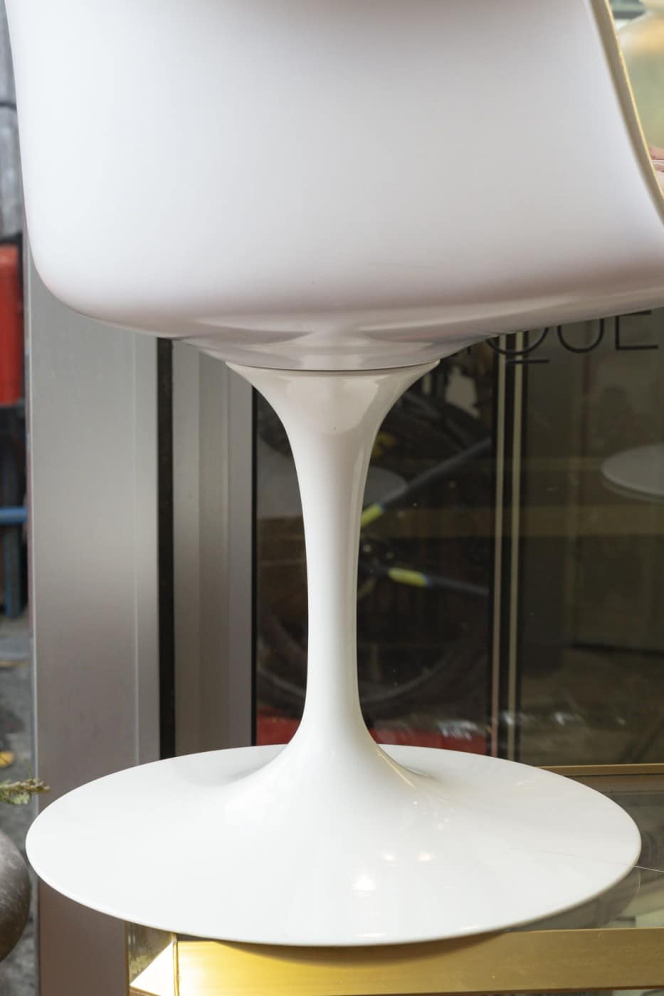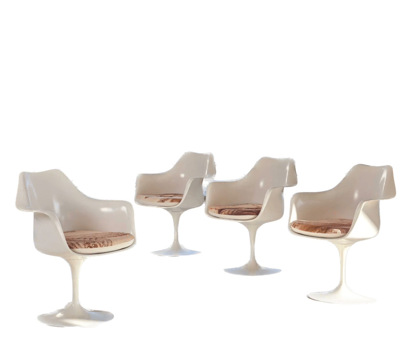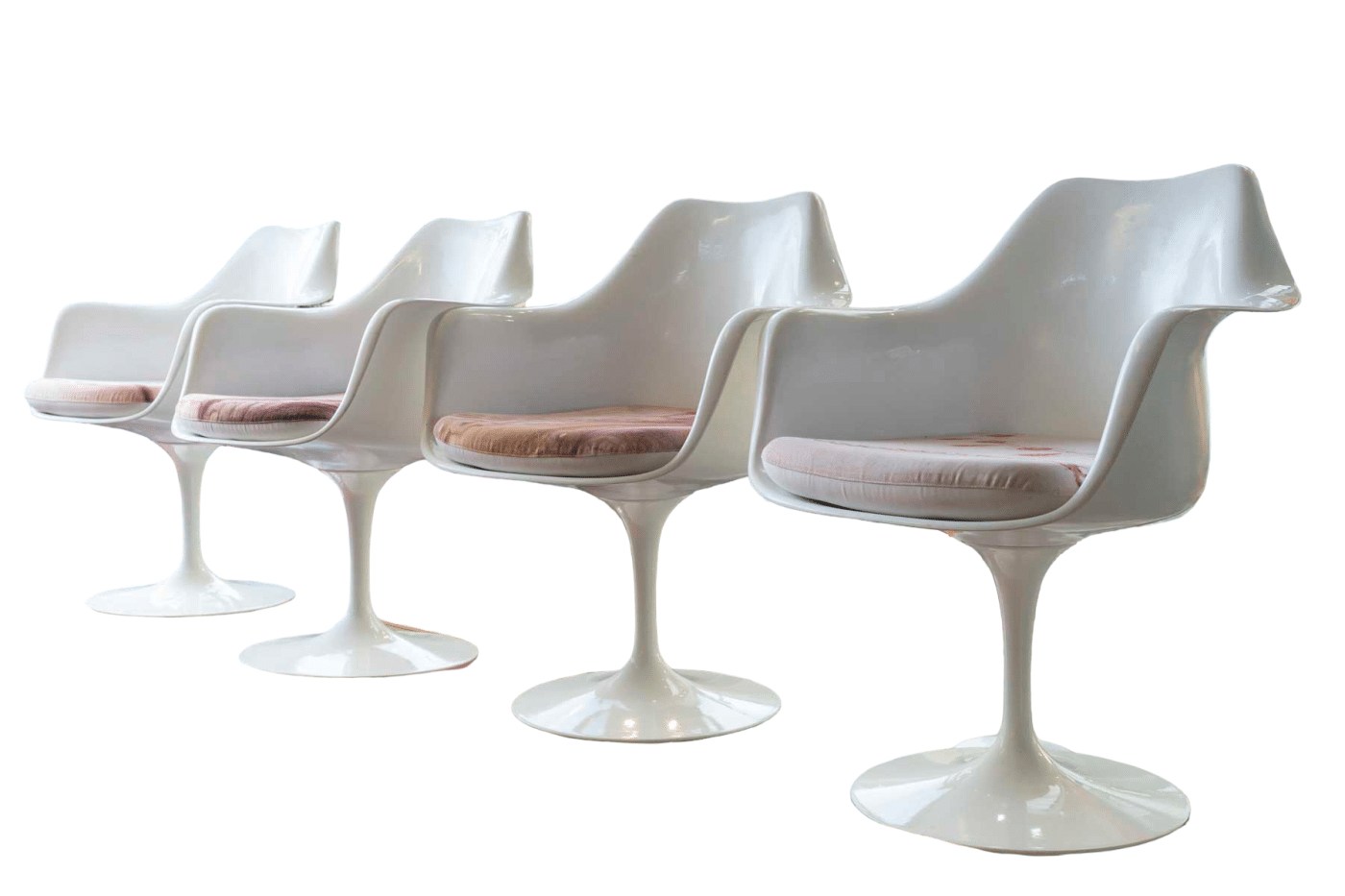 Suite de 4 chaises pivotantes modèle Tulipe en fonte d’aluminium laqué blanc et plastique blanc.