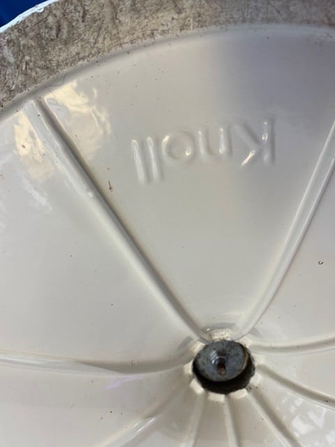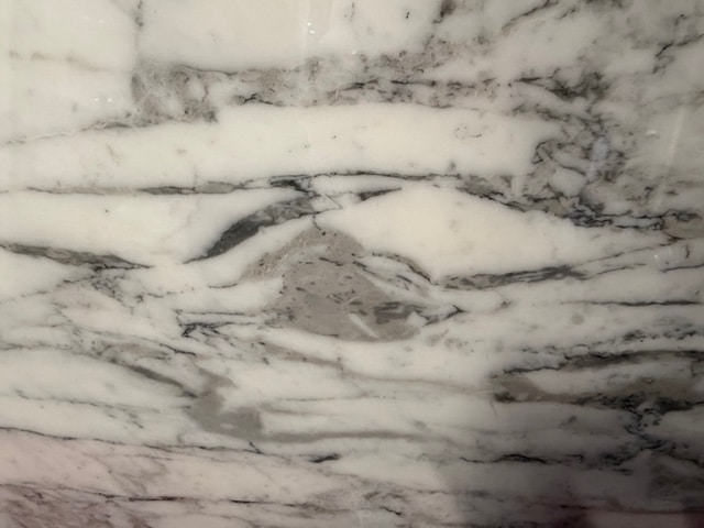 Matériaux : Plateau en marbre Arabescato, piètement en fonte d’aluminium