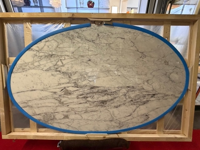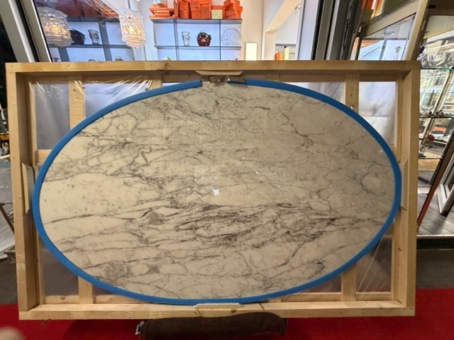 Table ovale en marbre Arabescato (120 × 198 cm) sur un pied en aluminium recouvert de Rilsan blanc.