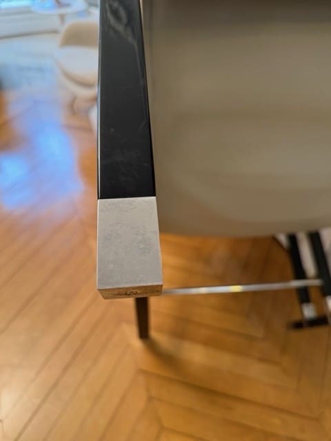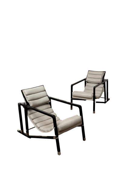 Paire de fauteuils « Transat »,modèle original créé circa 1926, en bois laqué noir à dossier inclinable et accotoirs détachés formant piètement avant à jambes de section carrée terminées par de petits sabots en métal chromé. Piètement arrière à jambes doubles reliées par une entretoise. Dossier et assise gainés de cuir gris matelassé .
