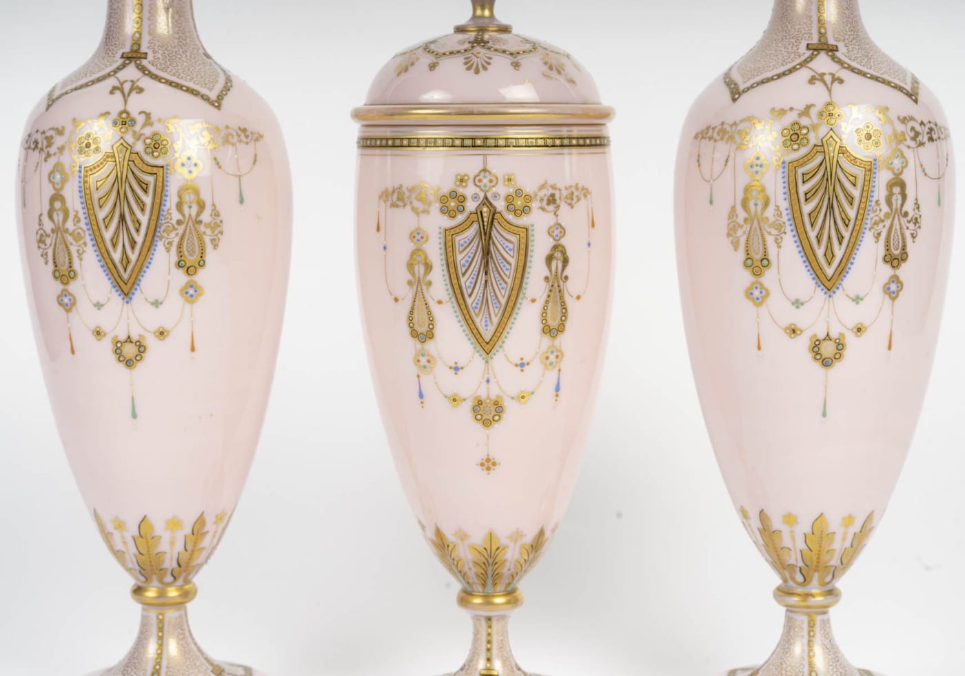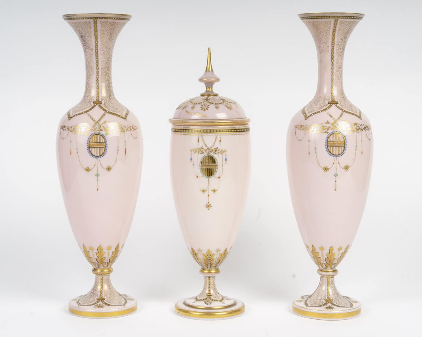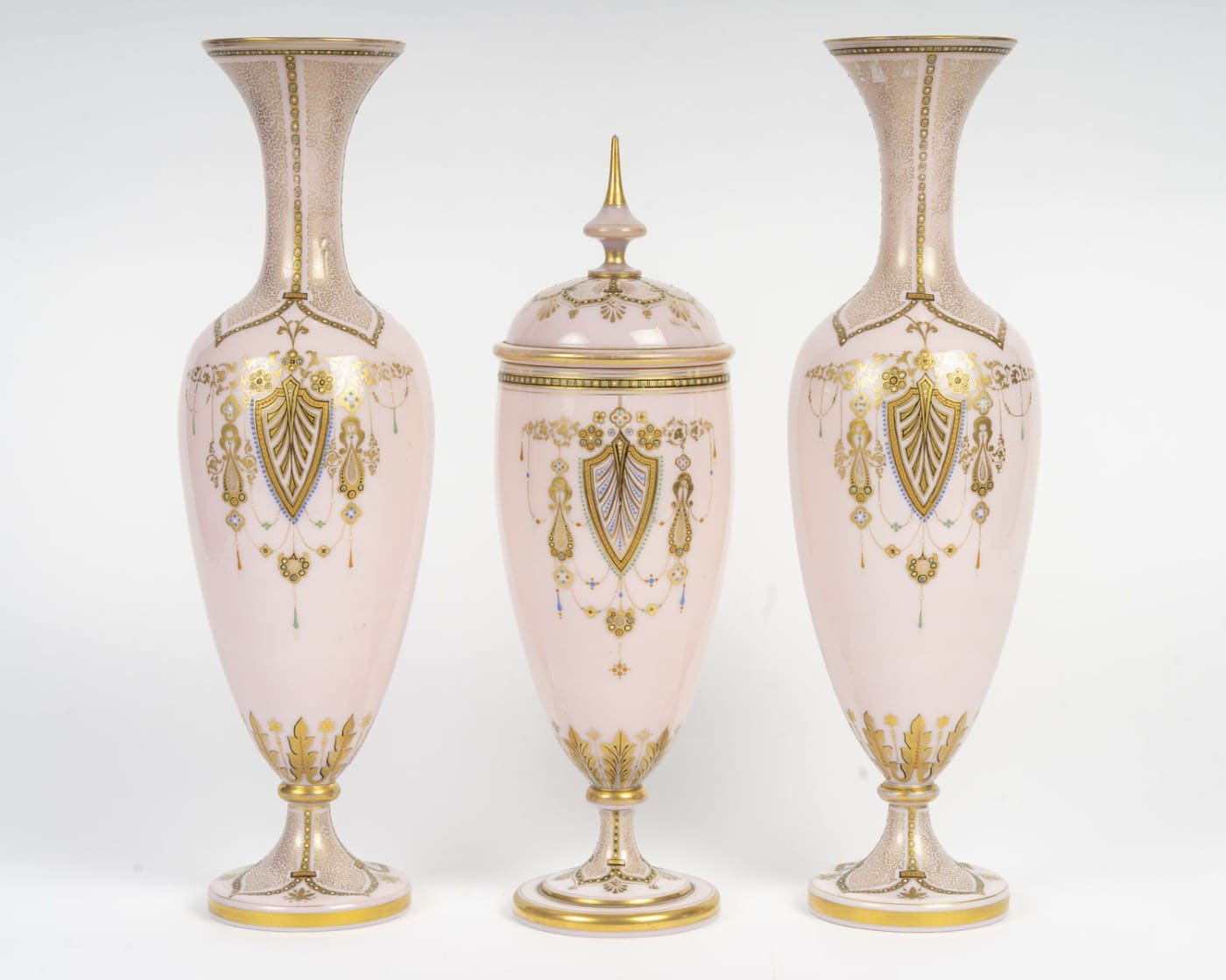 Superbe garniture composée de deux vases balustres et d’un vase couvert central, en opaline rose pâle richement décorée à l’or fin et rehaussée de petits émaux polychromes.