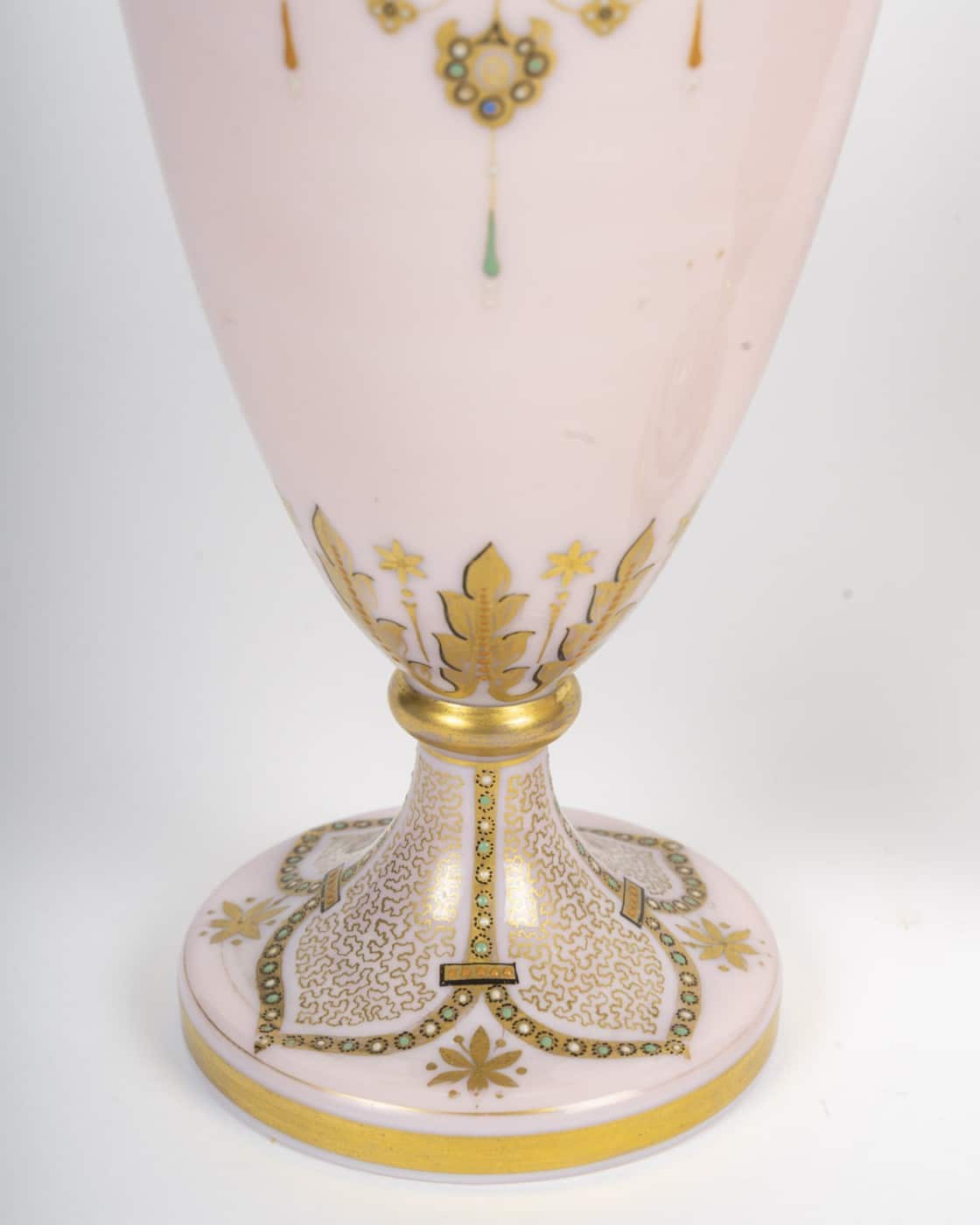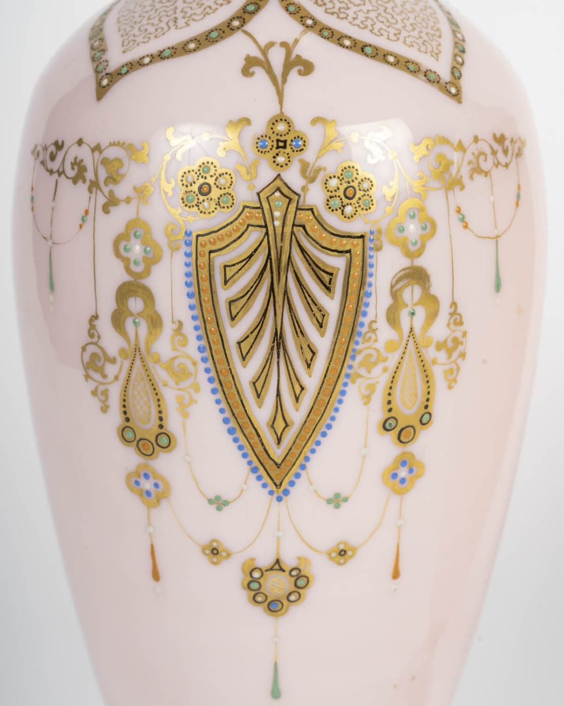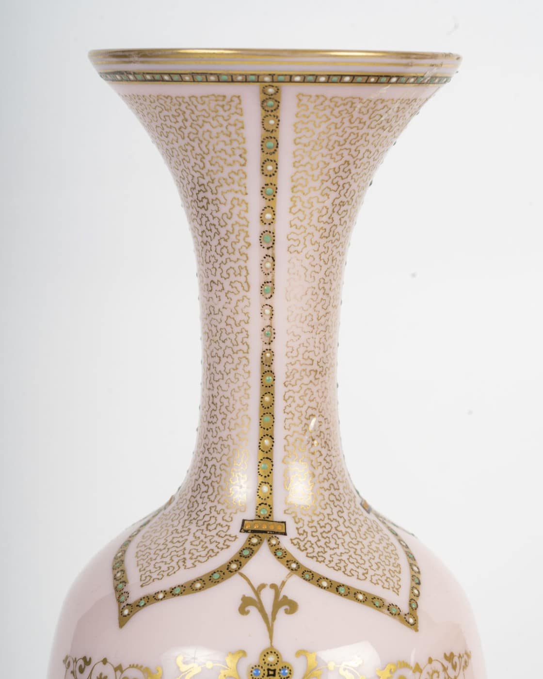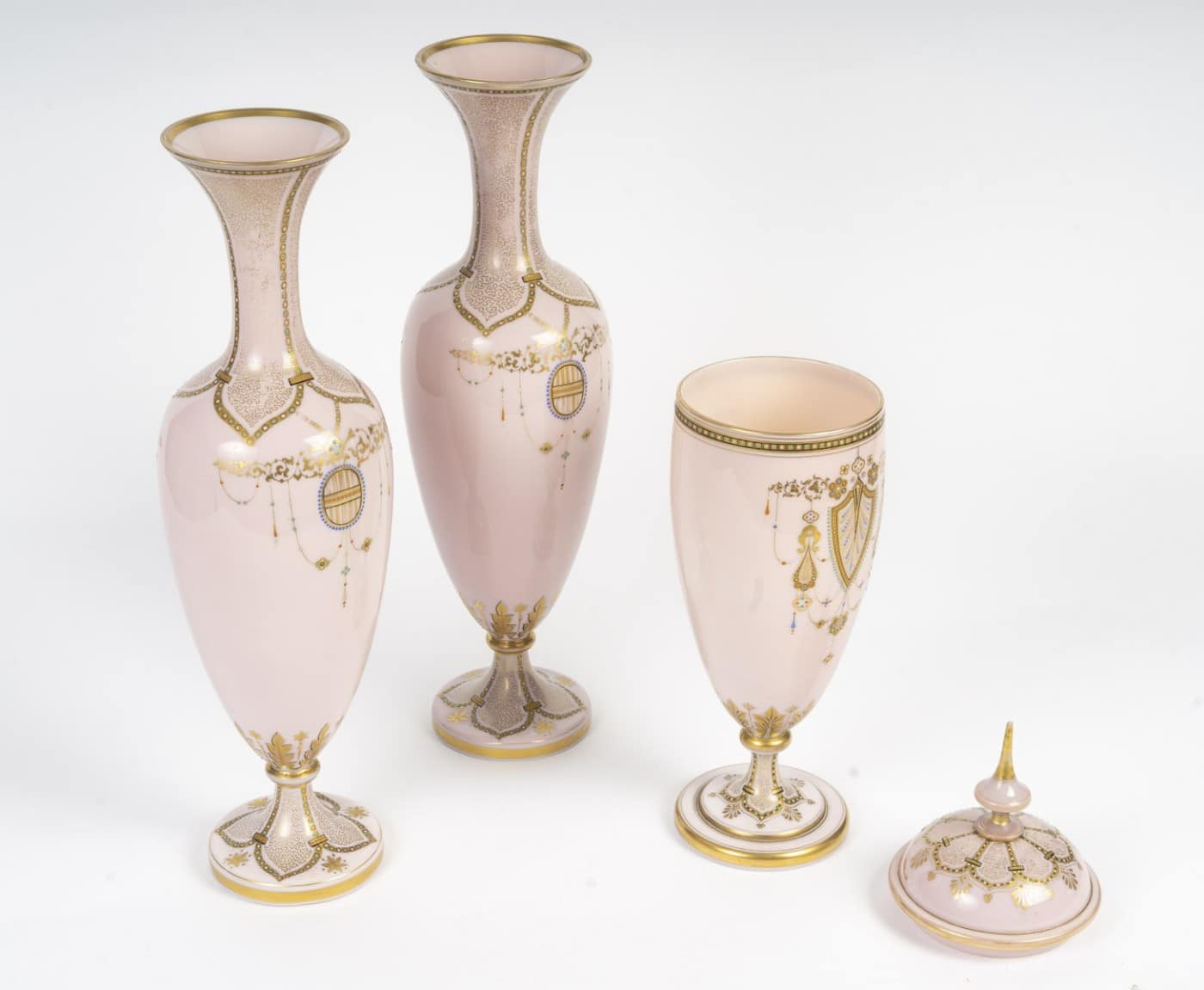 Superbe garniture composée de deux vases balustres et d’un vase couvert central, en opaline rose pâle richement décorée à l’or fin et rehaussée de petits émaux polychromes.