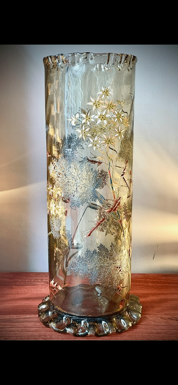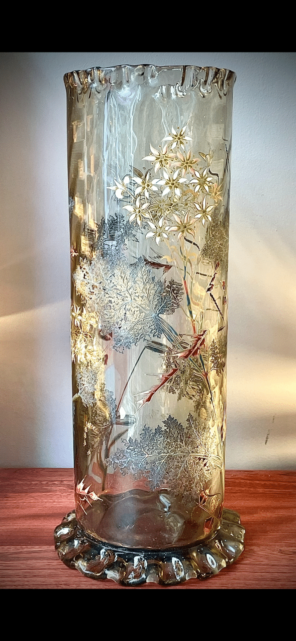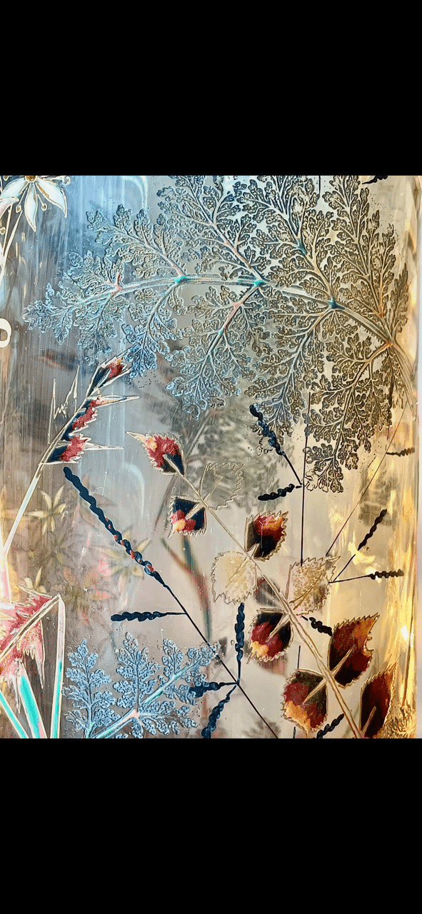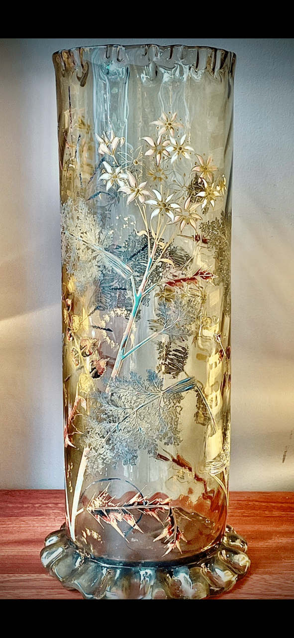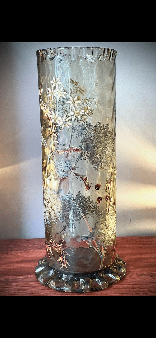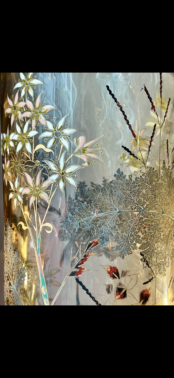 RARE ET IMPORTANTE CRISTALLERIE TUBULAIRE DES ÉTABLISSEMENTS EMILE GALLÉ ENTIÈREMENT ÉMAILLÉE DE FLEURS D EDELWEISS D UN JOLI BLANC IMMACULÉ ET ROSE SUR TOUTE FACE ET DE FEUILLAGES DÉGAGÉES FINEMENT À L ‘ ACIDE