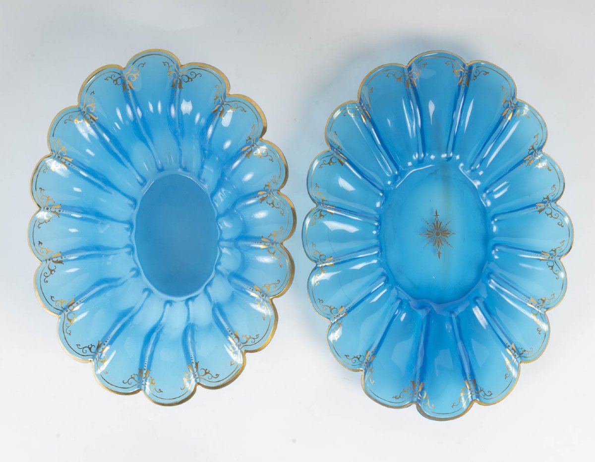 Charmant ensemble de deux plats en opaline bleue (verre opalin), de forme mouvementée à contours godronnés et bordure festonnée, rehaussée d’un délicat décor doré en rinceaux et frises, typique des productions décoratives du XIXe siècle.