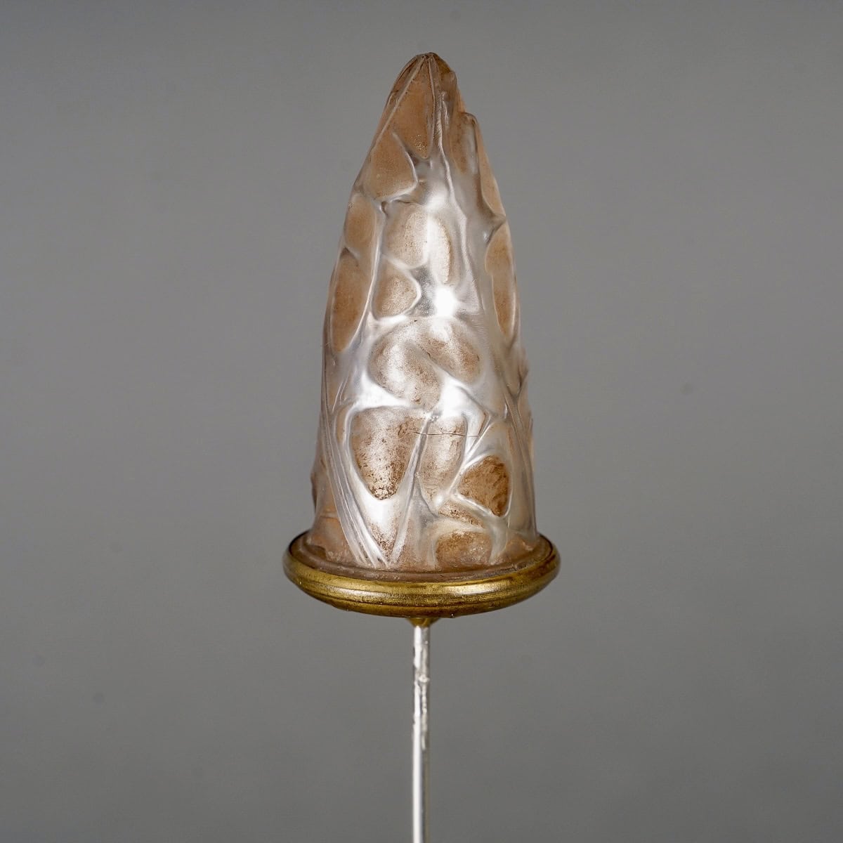 Epingle à Chapeau « Feuilles » en verre blanc patiné sépia sur clinquant argent de René Lalique créée en 1912.