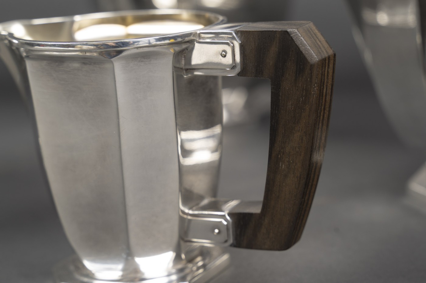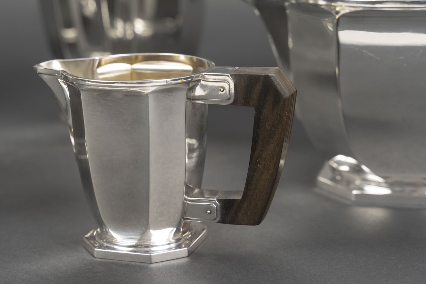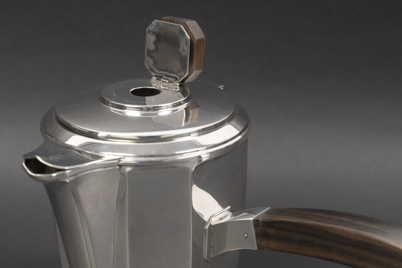 Service complet à thé, café et chocolat en argent massif de forme hexagonale à pans coupés, typique du style Art Déco. Chaque pièce repose sur une base à gradins et présente un couvercle à doucine surmonté d’un bouton en bois assorti aux anses anguleuses. Intérieur du pot à lait et du sucrier vermeillé.