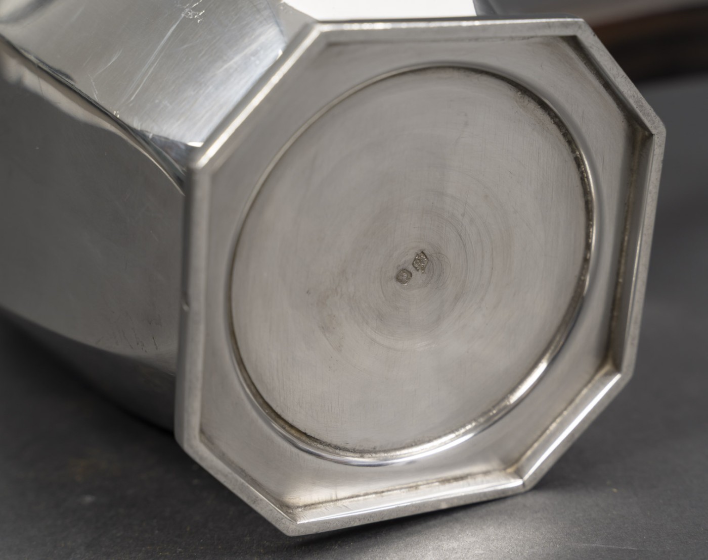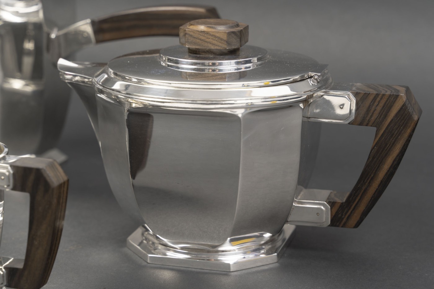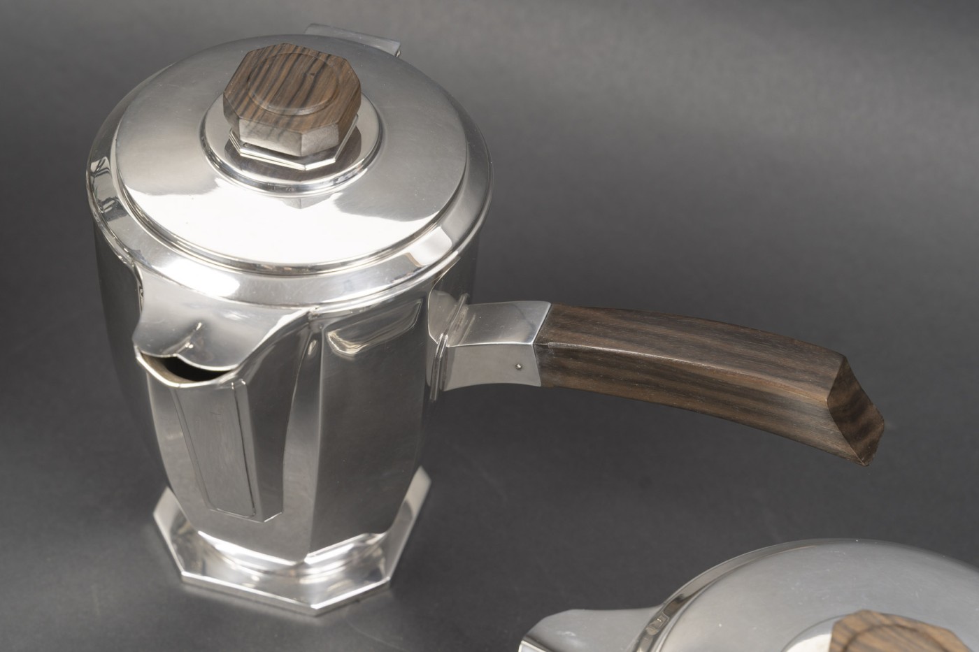 Service complet à thé, café et chocolat en argent massif de forme hexagonale à pans coupés, typique du style Art Déco. Chaque pièce repose sur une base à gradins et présente un couvercle à doucine surmonté d’un bouton en bois assorti aux anses anguleuses. Intérieur du pot à lait et du sucrier vermeillé.