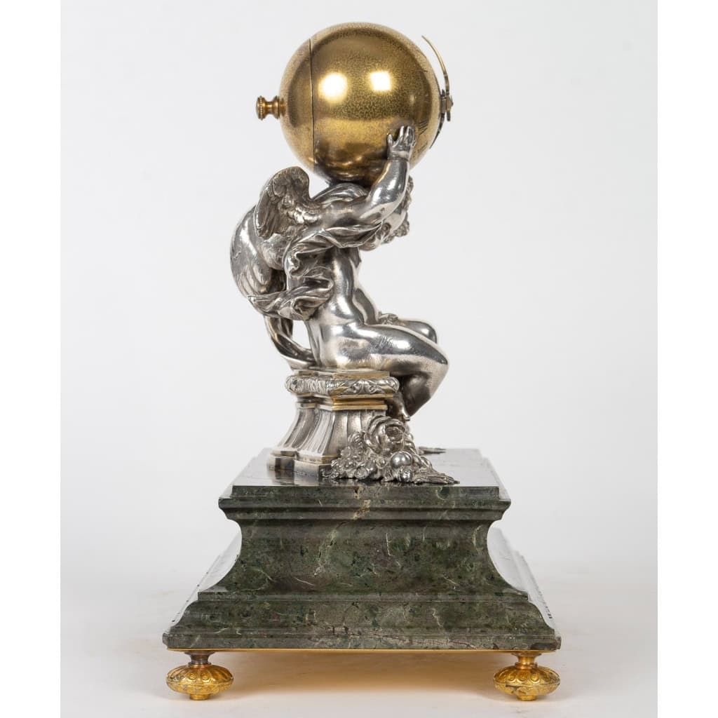 Décor d’un Amour soutanant un globe renfermant le mouvement et indiquant les heures gravées en chiffres romains.