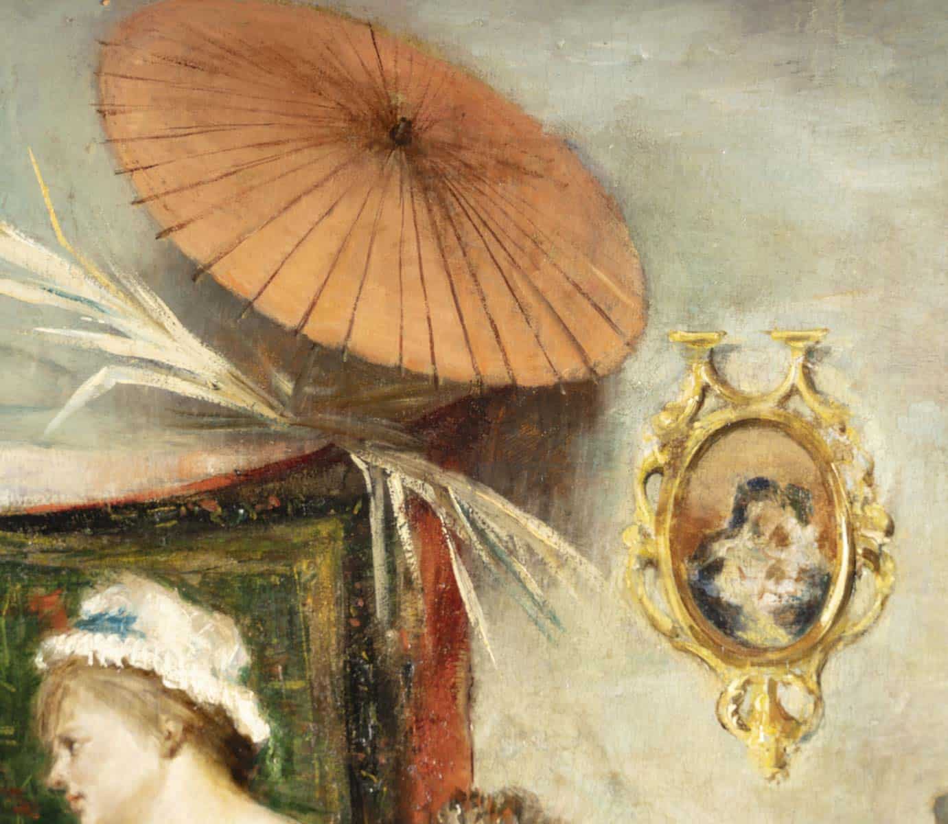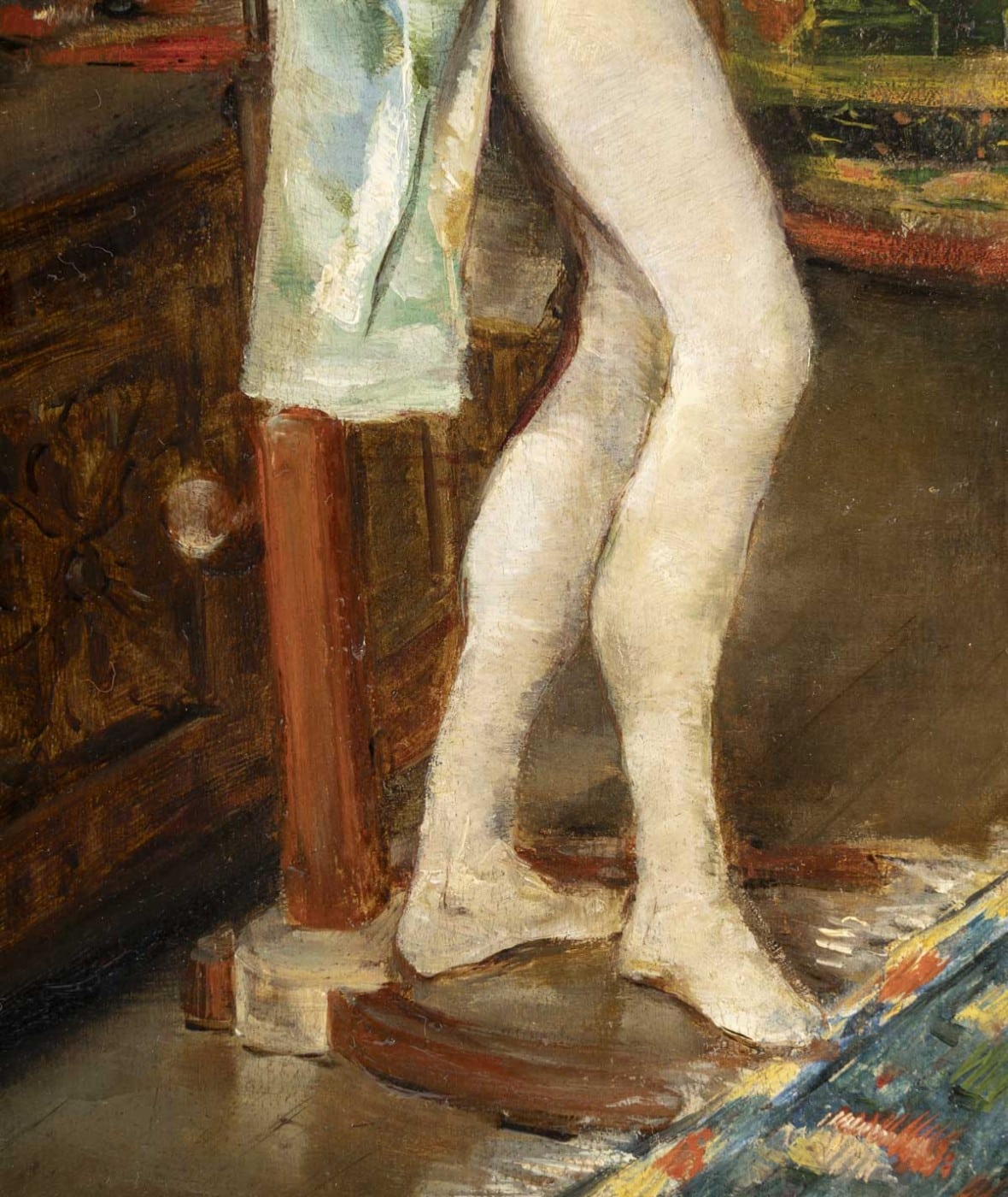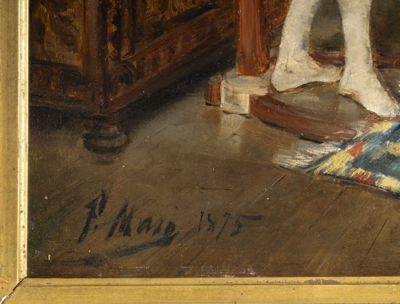 Une scène de genre mettant en scène une soubrette face à un mannequin grandeur nature dans un intérieur du peintre catalan Felipe Maso de Falp.