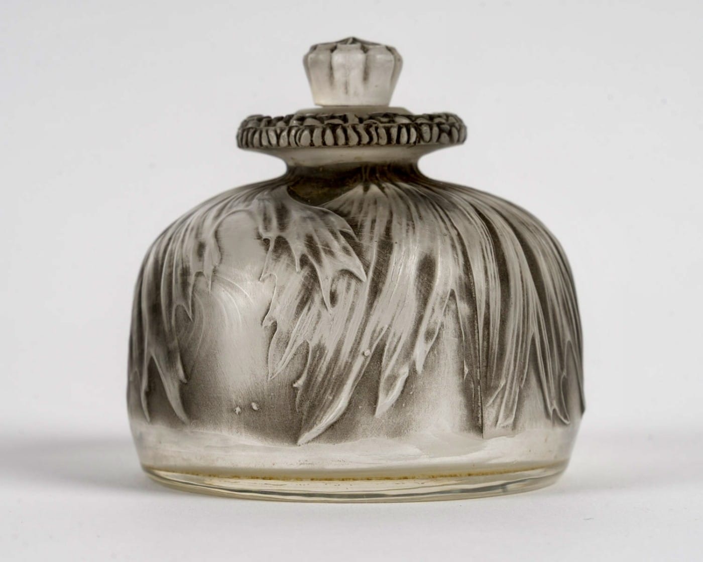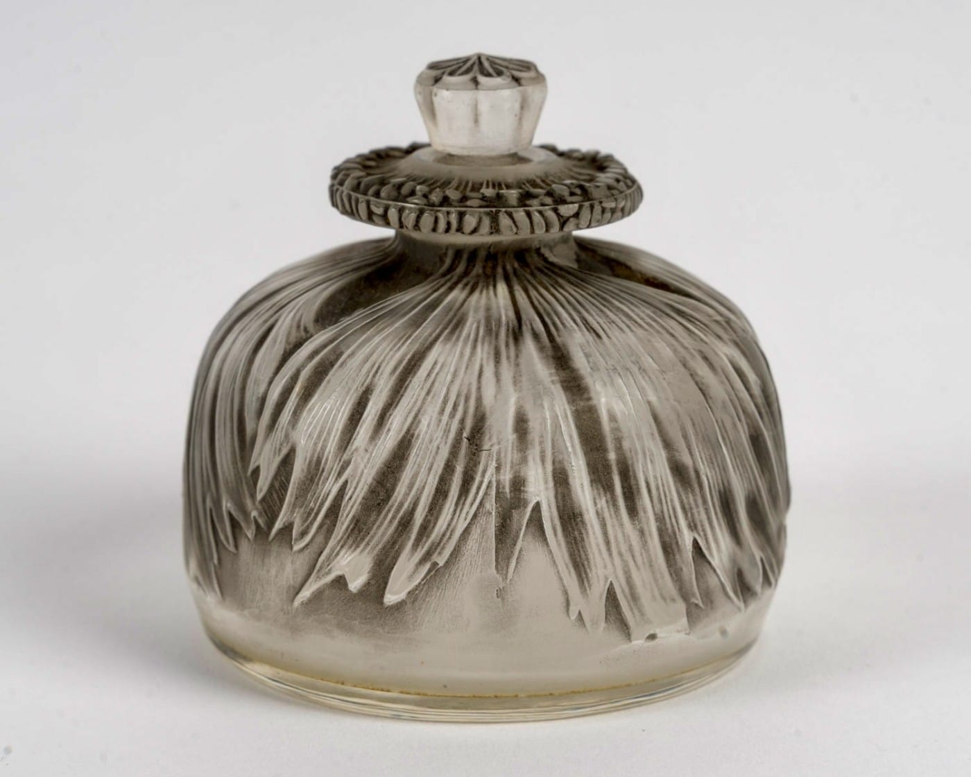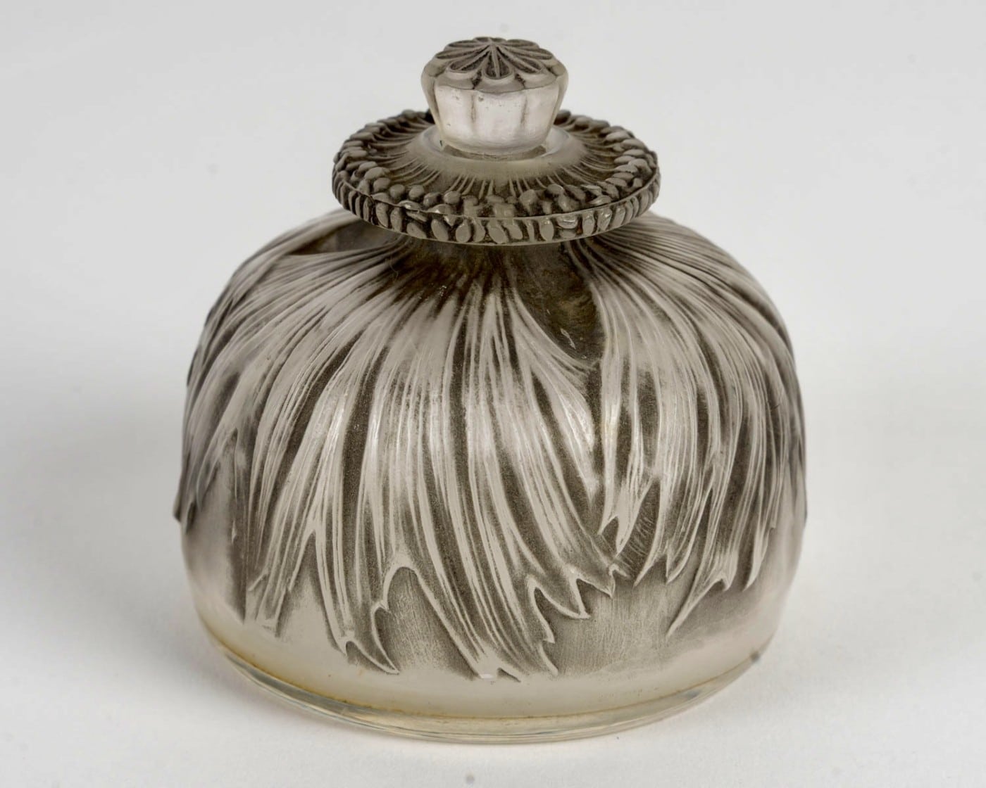 Flacon à Parfum « Pavot » en verre blanc patiné gris créé par René Lalique en 1910.