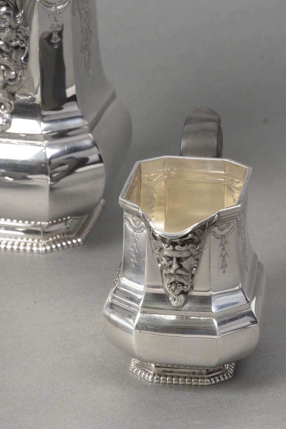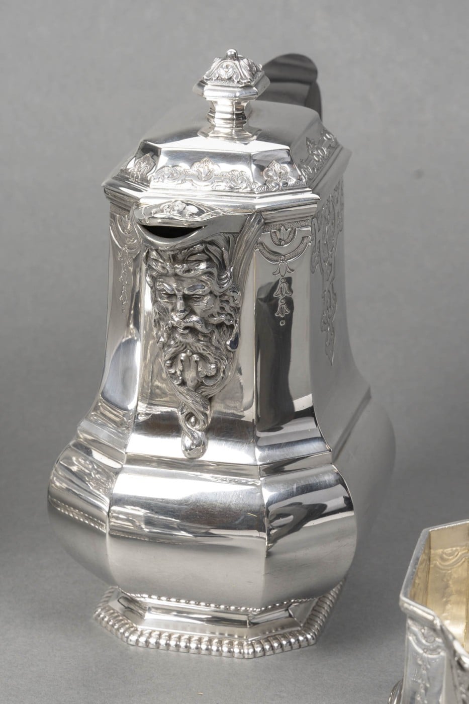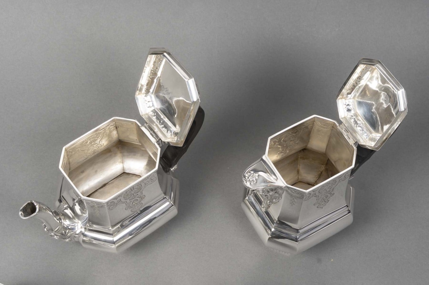 Raffiné service à thé et café en argent massif composé d’une théière, d’une cafetière, d’un sucrier couvert et d’un pot à lait. Chaque pièce présente une forme balustre octogonale à pans coupés, soulignée par un piédouche à frise de perles.