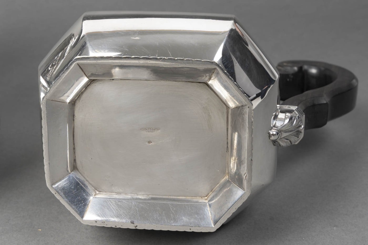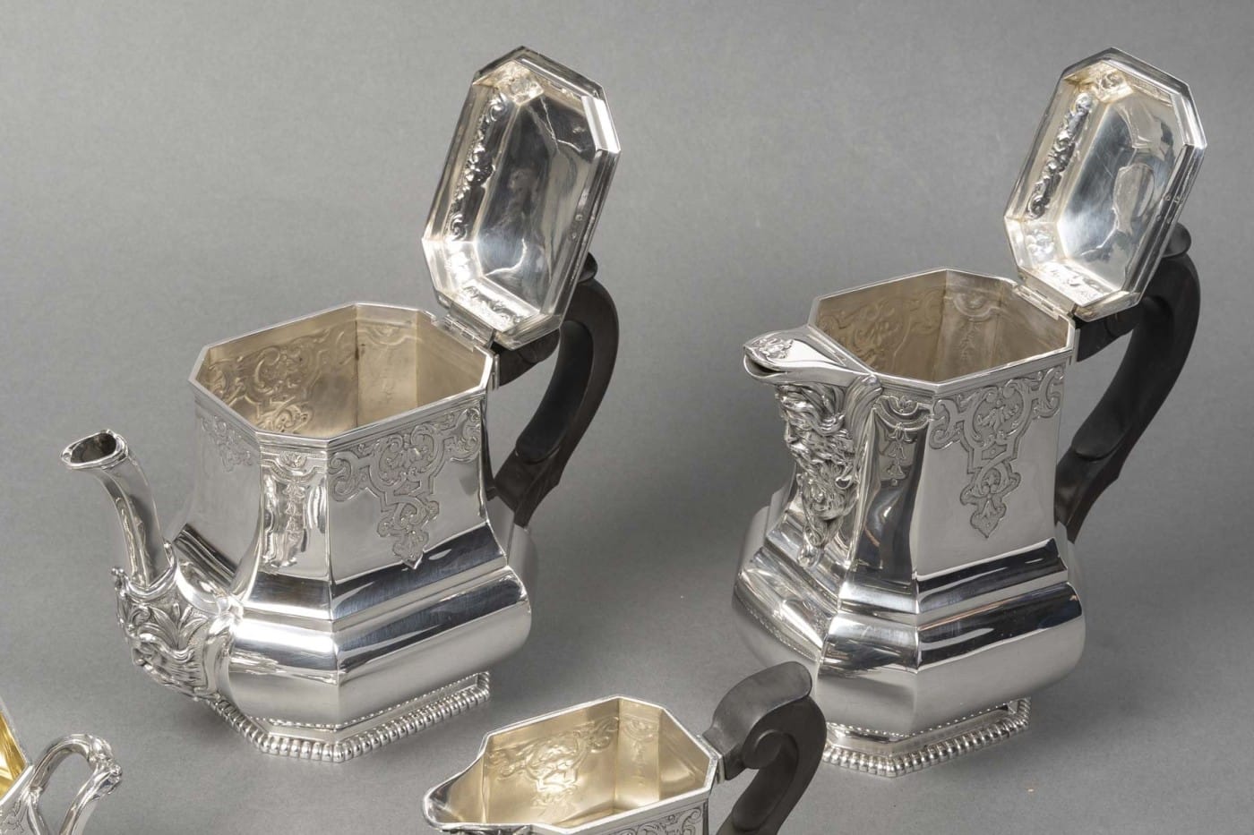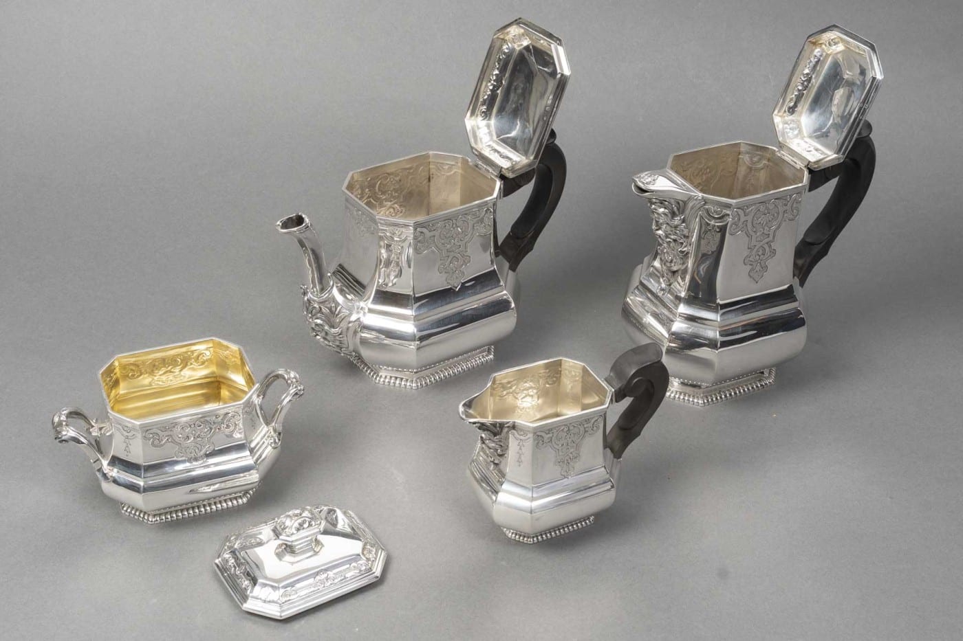 Raffiné service à thé et café en argent massif composé d’une théière, d’une cafetière, d’un sucrier couvert et d’un pot à lait. Chaque pièce présente une forme balustre octogonale à pans coupés, soulignée par un piédouche à frise de perles.