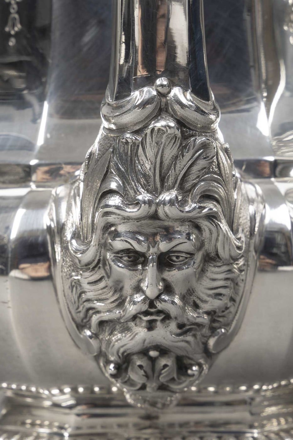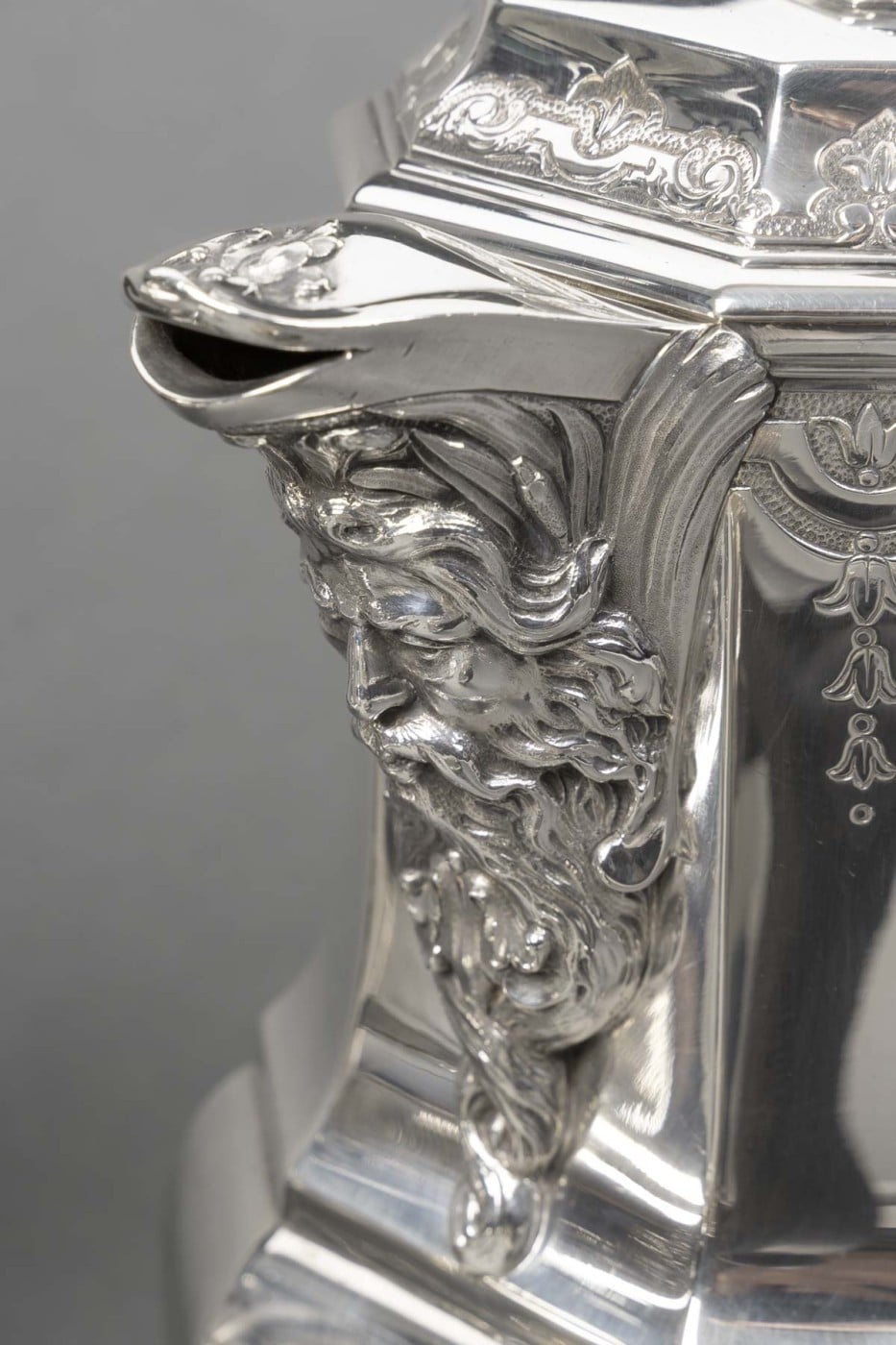 Les becs verseurs sont moulurés de mascarons et d’enroulements feuillagés, tandis que les anses en bois noirci (probablement ébène) contrastent élégamment avec l’éclat du métal. Les couvercles, à charnières, sont sommés de prises en forme de boutons stylisés.
