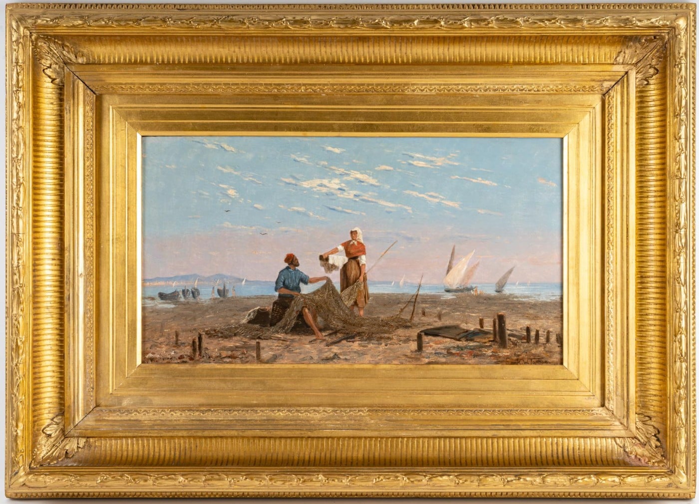 Charming painting depicting a fisherman mending his nets on a beach in Capri signed lower left by Frank William Warwick Topham circa 1863.