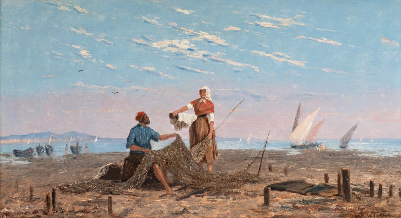 Frank William Warwick Topham (1838-1924) Capri The Repair of the Nets oil on panel circa 1863