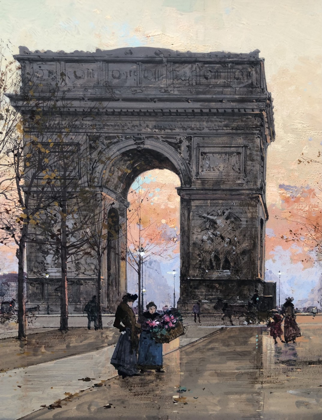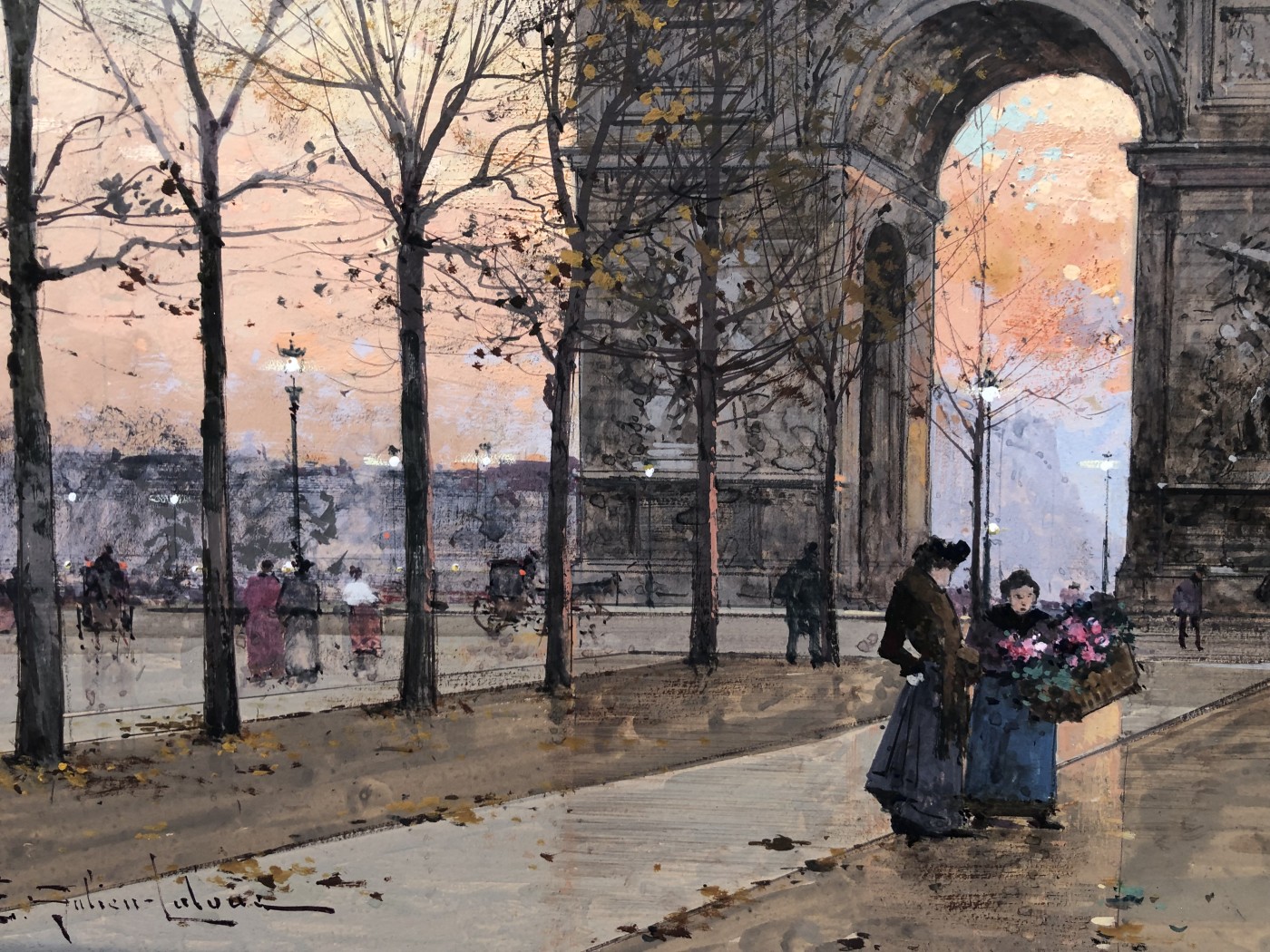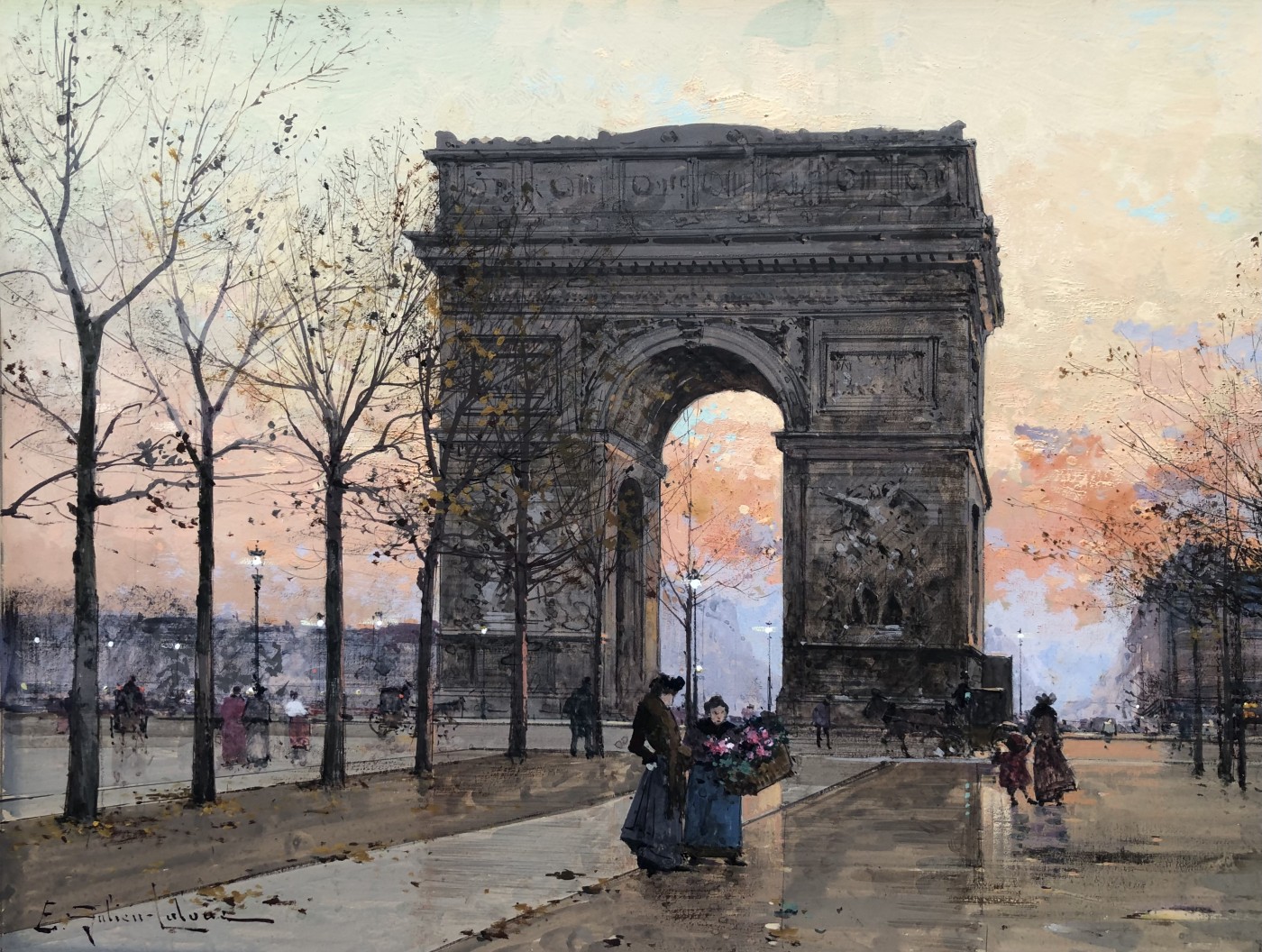 Peintre de scènes de genre , sujets militaires , paysages animés , paysages urbains , peintre à la gouache , aquarelliste . Elève de son père Charles Laloue , Eugène Galien-Laloue expose au Salon à partir de 1879 et se fait une spécialité des vues de Paris à La Belle Epoque . Doué d’une grande facilité , Eugène Galien-Laloue a eu une très grande production , principalement à la gouache et des oeuvres de petites tailles . Eugène Galien-Laloue représente souvent les endroits les plus pittoresques de Paris : Les Grands Boulevards , Les marchés aux fleurs de La Madeleine ou de La Conciergerie , Les quais de La Seine . Au début du 20ème siècle Eugène Galien-Laloue a une belle réputation en évoquant l’atmosphère de Paris en 1900 avec ses omnibus et ses fiacres de La Belle Epoque .L’oeuvre de Eugène Galien-Laloue a également une valeur de témoignage de son époque . Cet artiste raffiné et délicat a peint aussi des paysages de Normandie , de Seine et Marne , de Marseille , d’Italie et de Venise et en 1914 des représentations de vues militaires . Les PEINTRES de PARIS Paris est l’une des villes au monde qui a le plus attiré les peintres. Mais la nature et les raisons de cet intérêt ont évolué avec l’histoire de la ville. Paris est une mosaïque de quartiers. Les peintres en ont représenté les sites les plus séduisants et les monuments prestigieux en s’appropriant les lieux pour en nourrir leur imaginaire – de l’Ile de la Cité à l’Arc de Triomphe – de la place Clichy à l’Opéra – du Quartier Latin aux Tuileries – des Grands Boulevards à Montmartre ou aux quais de Seine – Le XIXème siècle a profondément modifié l’aspect de la ville et le peintre réaliste s’attachera à représenter les hommes dans leur vie quotidienne. Sous Napoléon III, la modernisation de la capitale, dirigée par le baron Haussmann, avec le percement de grandes artères, la construction de nouveaux quartiers comme autour du Parc Monceau ou l’Etoile, des monuments comme l’Opéra ou l’Eglise St-Augustin, l’aménagement des Bois de Boulogne et Vincennes – autant de sujets que les peintres voudront fixer sur la toile. Après les épreuves de 1870, Paris se libère et vit une période de plaisirs de joie de vivre. De nombreux peintres, Français et Etrangers, ont illustré avec bonheur cette société dite de « La Belle Epoque » – Parmi les plus célèbres : Auguste Renoir et « Le Bal du Moulin de la Galette » Claude Monet et « la Gare St-Lazare » – Raoul Dufy au « Palais Royal » – Edouard Manet « La Musique aux Tuileries » – Henri de Toulouse Lautrec « Au Moulin Rouge » Certains peintres sont devenus « les spécialistes de Paris » représentant l’animation des rues et jardins, les marchés aux fleurs de la cité ou le long de l’Eglise de la Madeleine, les « bouquinistes » sur les quais de Seine avec Notre Dame… Tout est prétexte à croquer sur le vif cette vie trépidante et mondaine à toute heure du jour ou de la nuit, et en toute saison. Tels : Jean Béraud et ses élégantes – Edouard Cortès – Georges Stein – Eugène Galien Laloue – et beaucoup d’autres peut-être moins célèbres mais tout aussi talentueux.