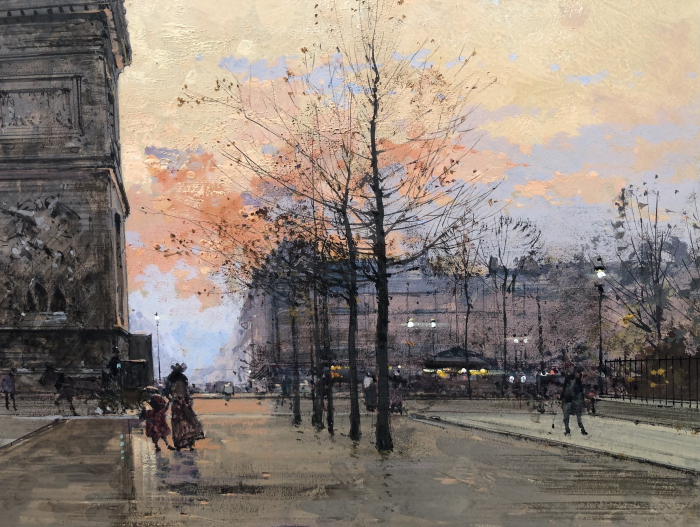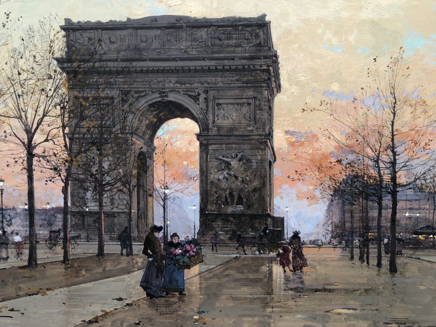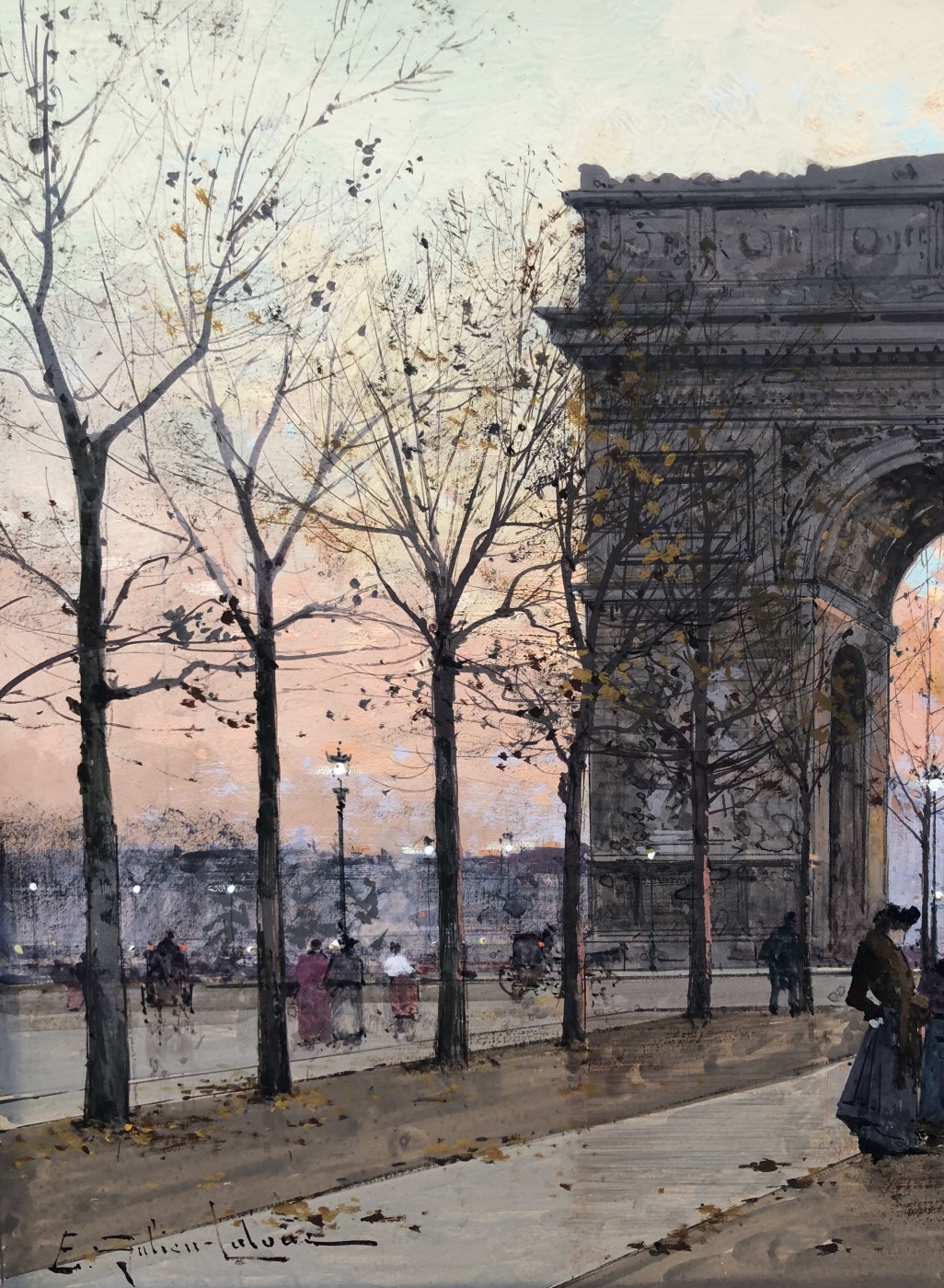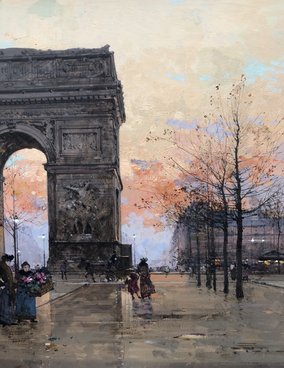 Peintre de scènes de genre , sujets militaires , paysages animés , paysages urbains , peintre à la gouache , aquarelliste . Elève de son père Charles Laloue , Eugène Galien-Laloue expose au Salon à partir de 1879 et se fait une spécialité des vues de Paris à La Belle Epoque . Doué d’une grande facilité , Eugène Galien-Laloue a eu une très grande production , principalement à la gouache et des oeuvres de petites tailles . Eugène Galien-Laloue représente souvent les endroits les plus pittoresques de Paris : Les Grands Boulevards , Les marchés aux fleurs de La Madeleine ou de La Conciergerie , Les quais de La Seine . Au début du 20ème siècle Eugène Galien-Laloue a une belle réputation en évoquant l’atmosphère de Paris en 1900 avec ses omnibus et ses fiacres de La Belle Epoque .L’oeuvre de Eugène Galien-Laloue a également une valeur de témoignage de son époque . Cet artiste raffiné et délicat a peint aussi des paysages de Normandie , de Seine et Marne , de Marseille , d’Italie et de Venise et en 1914 des représentations de vues militaires . Les PEINTRES de PARIS Paris est l’une des villes au monde qui a le plus attiré les peintres. Mais la nature et les raisons de cet intérêt ont évolué avec l’histoire de la ville. Paris est une mosaïque de quartiers. Les peintres en ont représenté les sites les plus séduisants et les monuments prestigieux en s’appropriant les lieux pour en nourrir leur imaginaire – de l’Ile de la Cité à l’Arc de Triomphe – de la place Clichy à l’Opéra – du Quartier Latin aux Tuileries – des Grands Boulevards à Montmartre ou aux quais de Seine – Le XIXème siècle a profondément modifié l’aspect de la ville et le peintre réaliste s’attachera à représenter les hommes dans leur vie quotidienne. Sous Napoléon III, la modernisation de la capitale, dirigée par le baron Haussmann, avec le percement de grandes artères, la construction de nouveaux quartiers comme autour du Parc Monceau ou l’Etoile, des monuments comme l’Opéra ou l’Eglise St-Augustin, l’aménagement des Bois de Boulogne et Vincennes – autant de sujets que les peintres voudront fixer sur la toile. Après les épreuves de 1870, Paris se libère et vit une période de plaisirs de joie de vivre. De nombreux peintres, Français et Etrangers, ont illustré avec bonheur cette société dite de « La Belle Epoque » – Parmi les plus célèbres : Auguste Renoir et « Le Bal du Moulin de la Galette » Claude Monet et « la Gare St-Lazare » – Raoul Dufy au « Palais Royal » – Edouard Manet « La Musique aux Tuileries » – Henri de Toulouse Lautrec « Au Moulin Rouge » Certains peintres sont devenus « les spécialistes de Paris » représentant l’animation des rues et jardins, les marchés aux fleurs de la cité ou le long de l’Eglise de la Madeleine, les « bouquinistes » sur les quais de Seine avec Notre Dame… Tout est prétexte à croquer sur le vif cette vie trépidante et mondaine à toute heure du jour ou de la nuit, et en toute saison. Tels : Jean Béraud et ses élégantes – Edouard Cortès – Georges Stein – Eugène Galien Laloue – et beaucoup d’autres peut-être moins célèbres mais tout aussi talentueux.