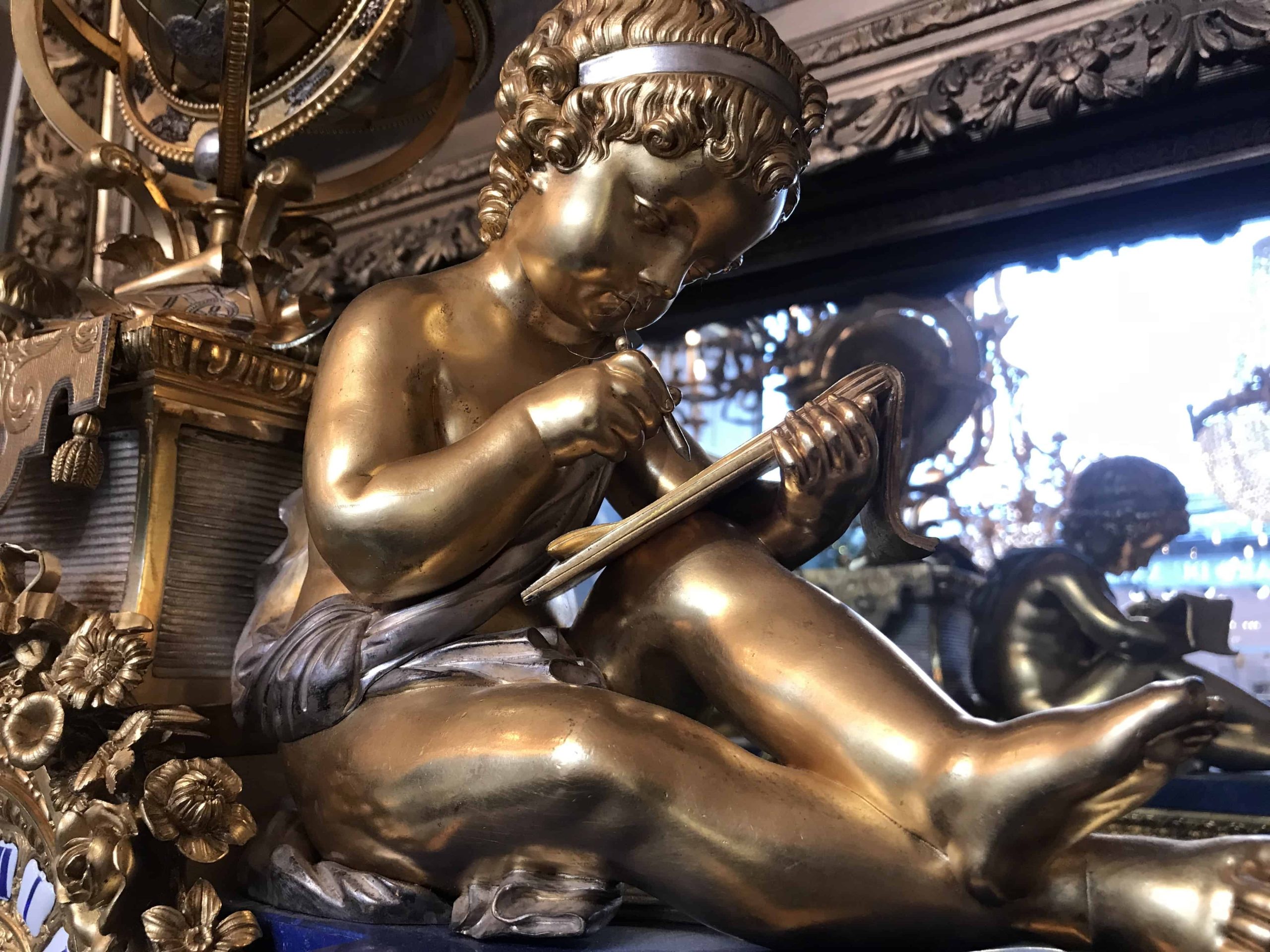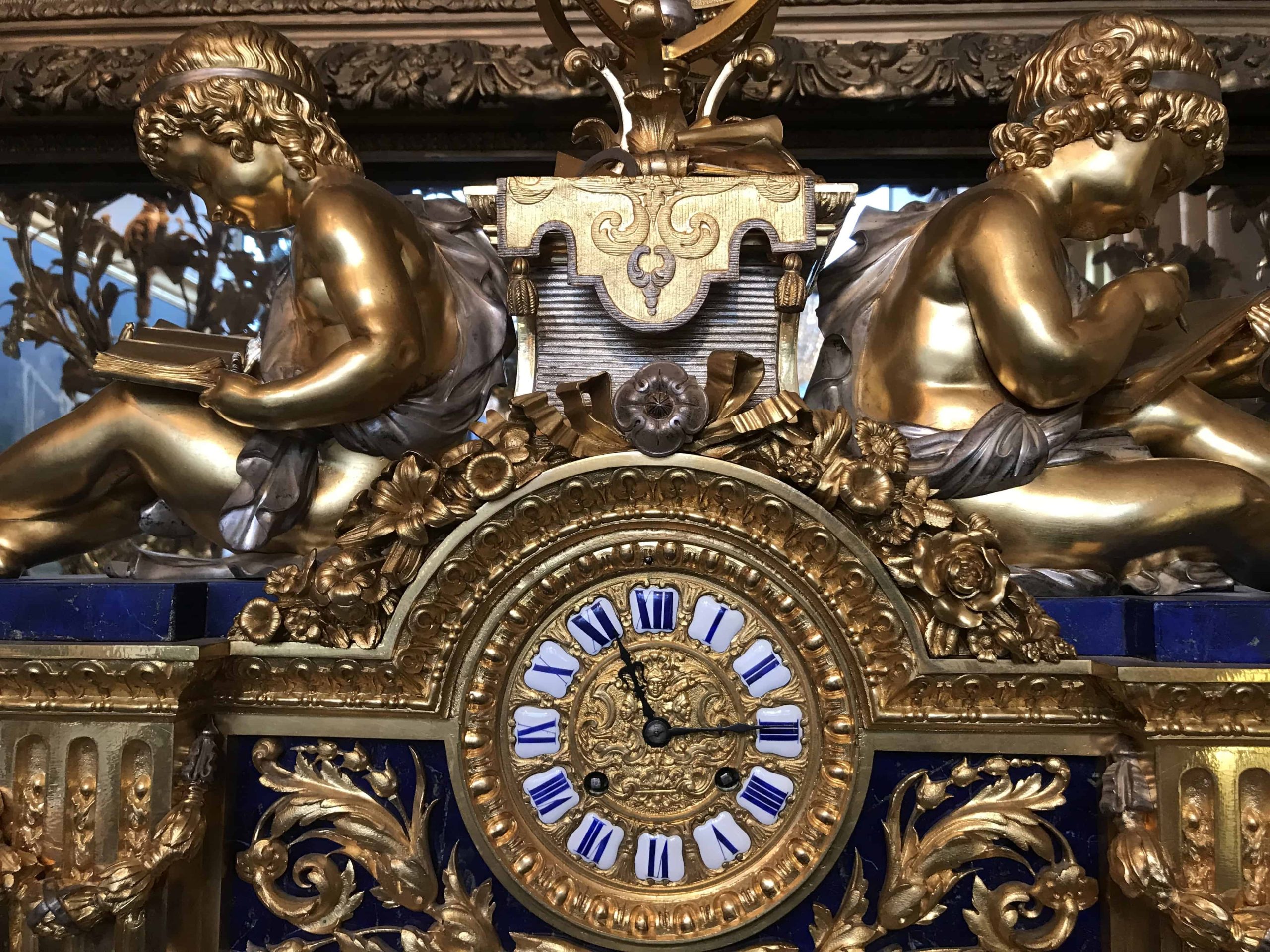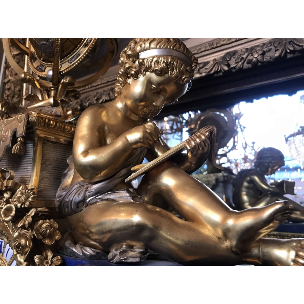 Horloge en bronze à double patine, or et argent, montée sur plaque et éléments de Lapis-Lazuli, agrémentée de part et d’autre de chérubins, attributs de métiers, guirlandes de fleurs et drapés argent.