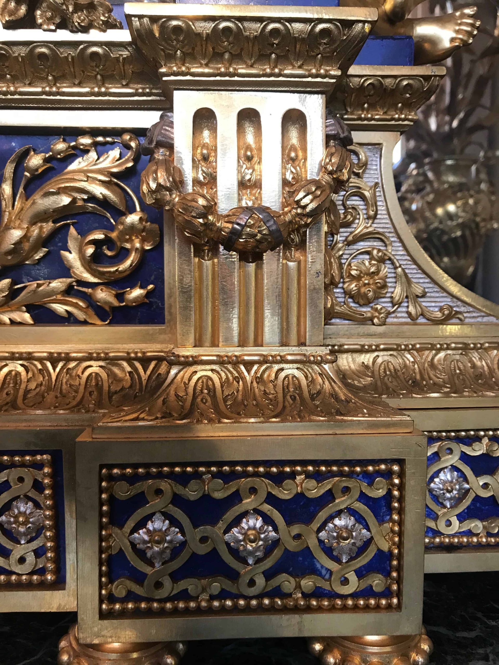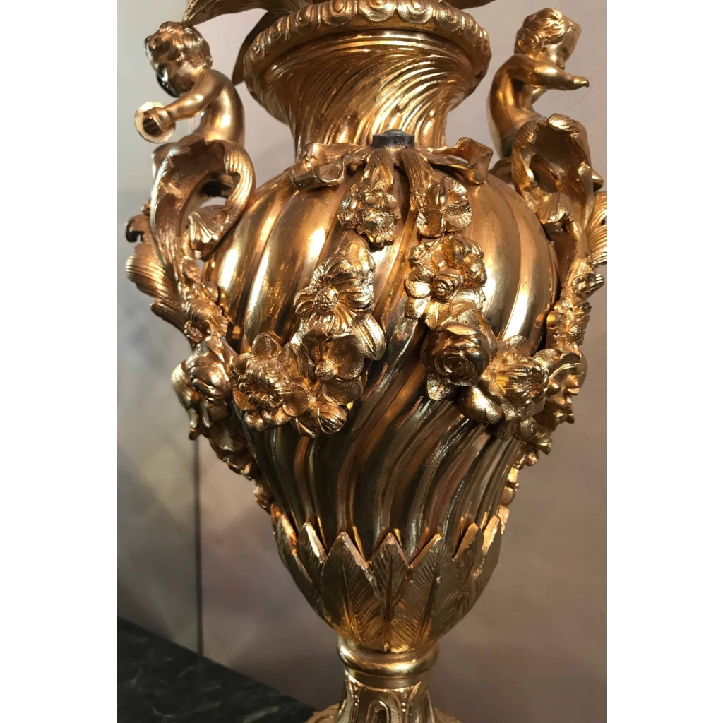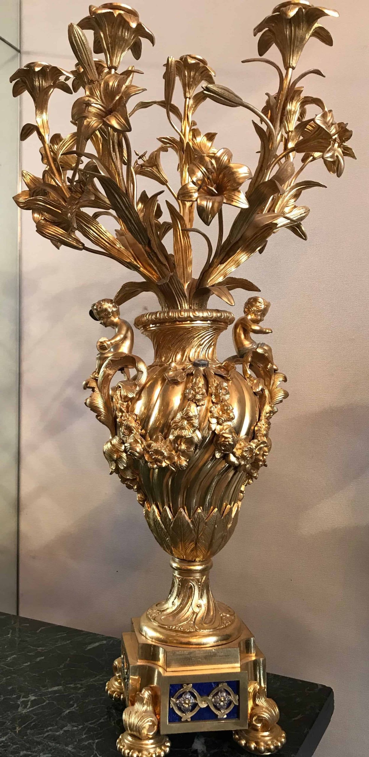 Les candélabres représentant des vases garnis de chérubins, de guirlandes de fleurs et surmontés de girandoles à 6 bras de lumières, reposant également sur un socle garni de Lapis-Lazuli.