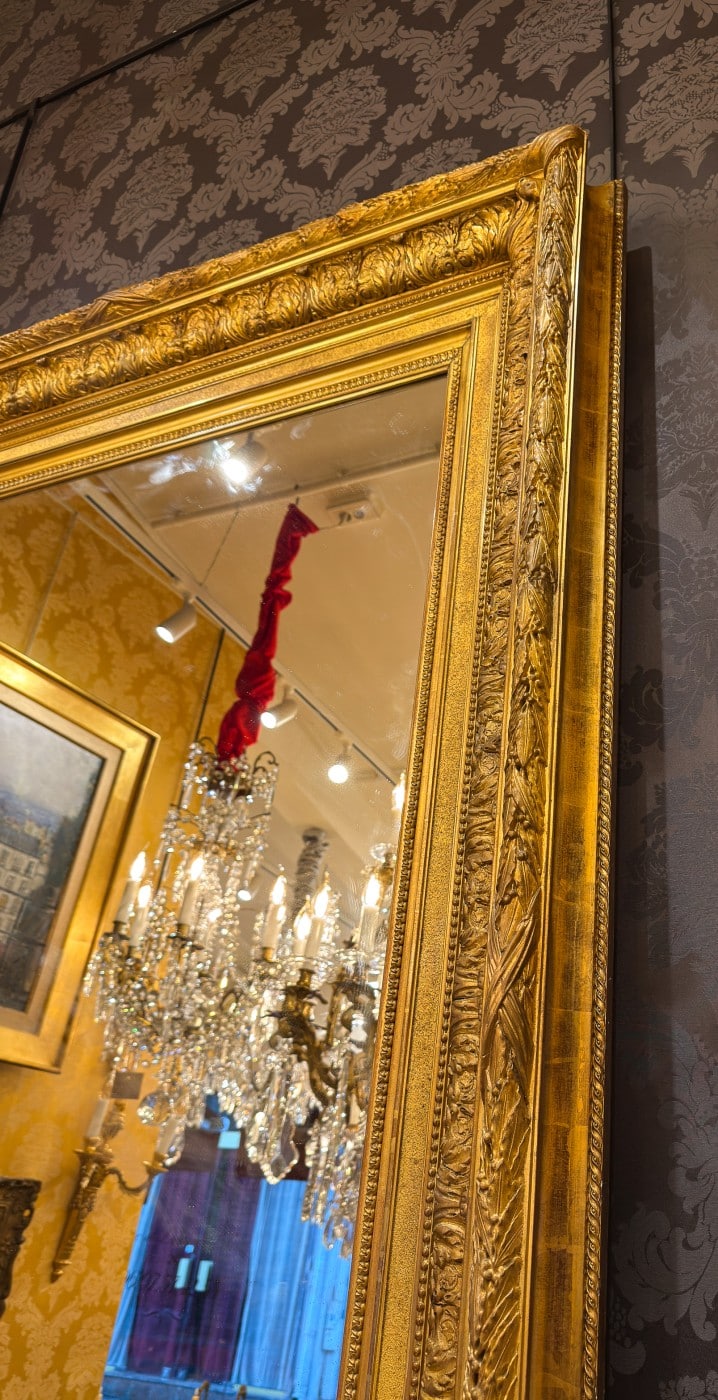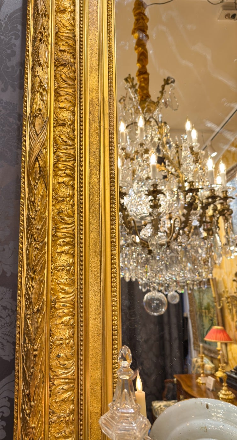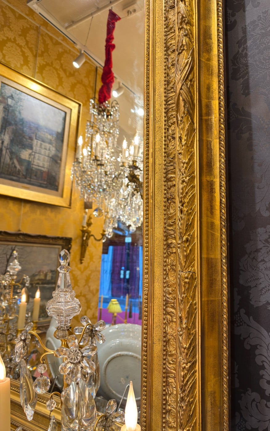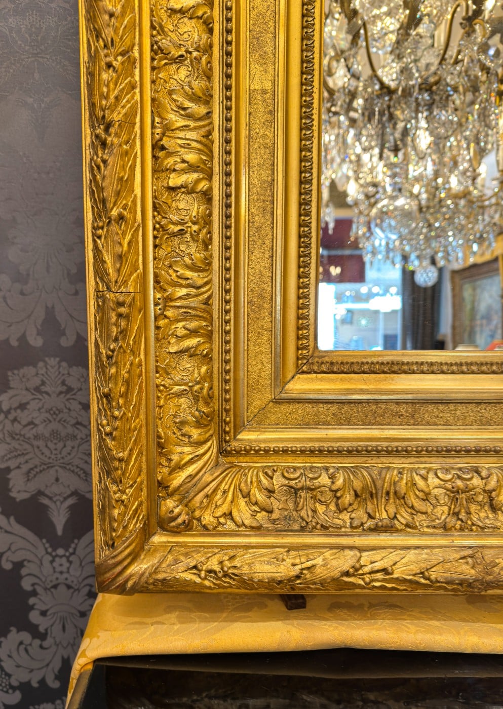 Un important et décoratif miroir en bois sculpté et doré, orné de motifs en raies de cœur, de rangs de perles, de drapés, de feuilles d’acanthe et de feuillage, typiques des éléments décoratifs du style Louis XVI. Réalisation française de qualité, datée de la fin du XVIIIème 1790-1800.