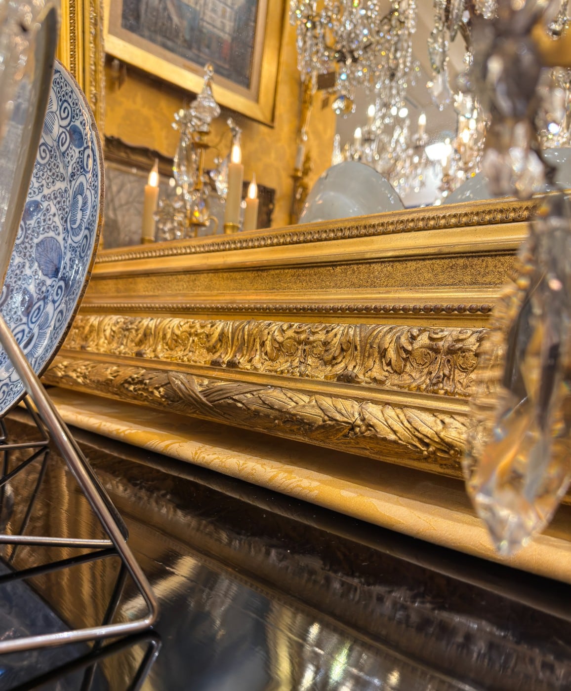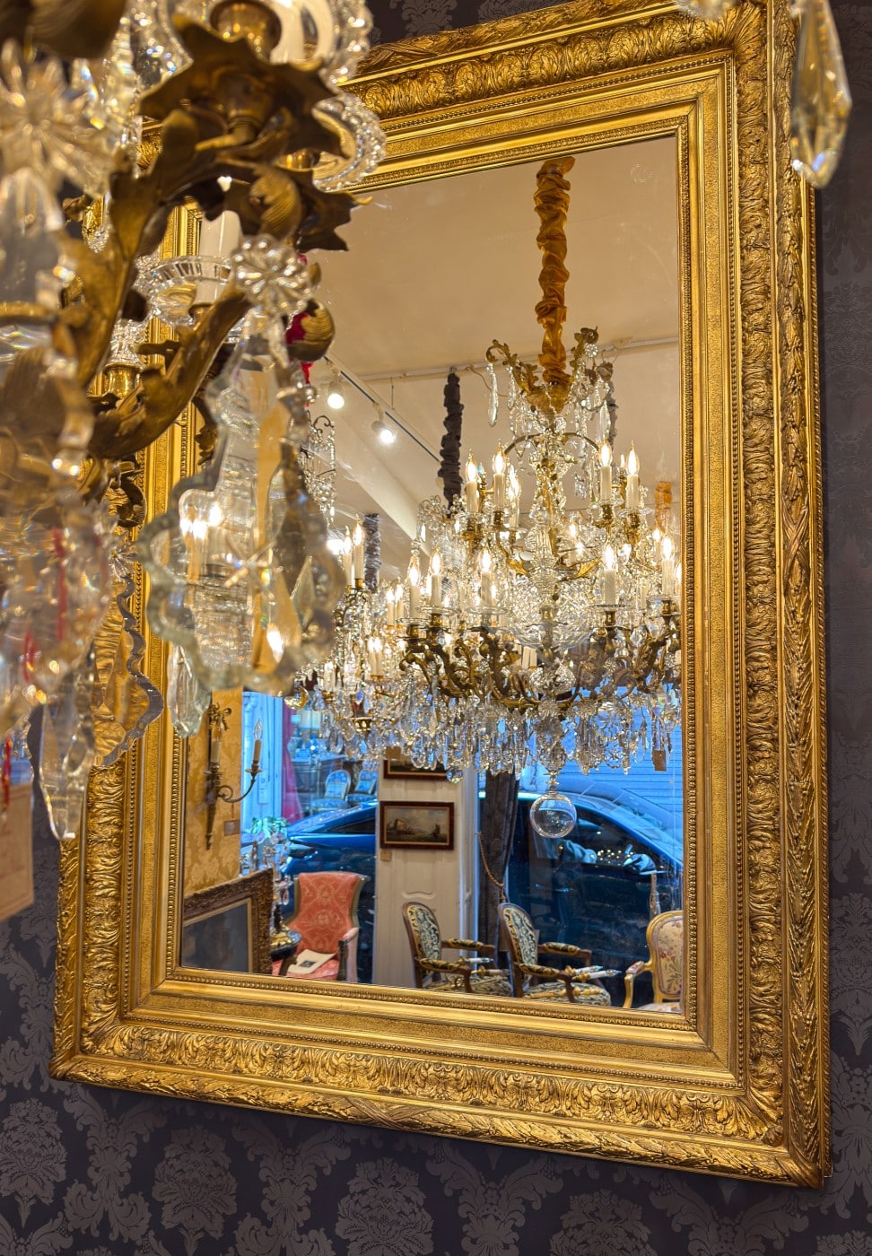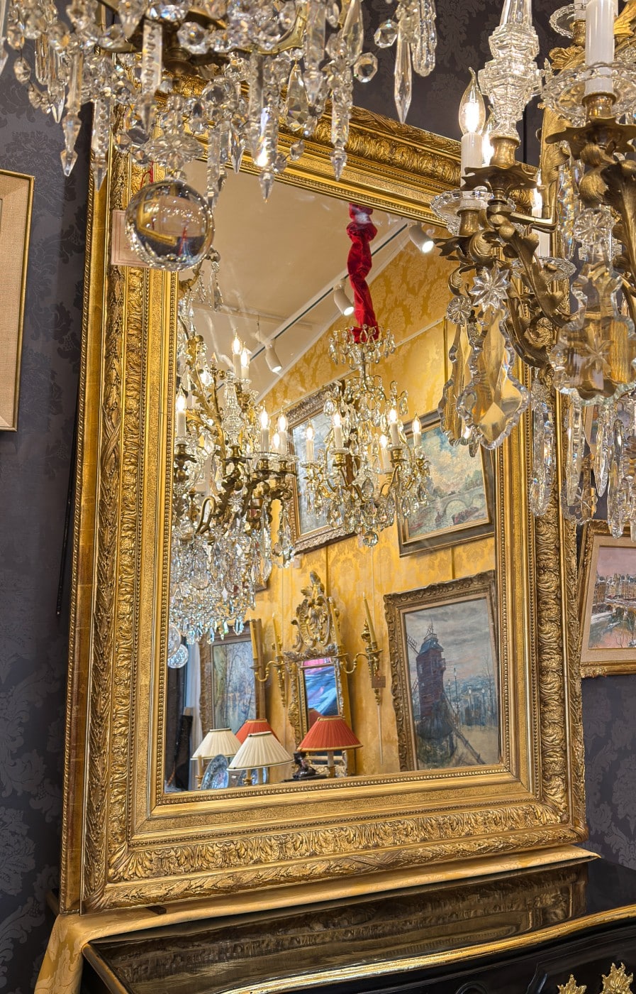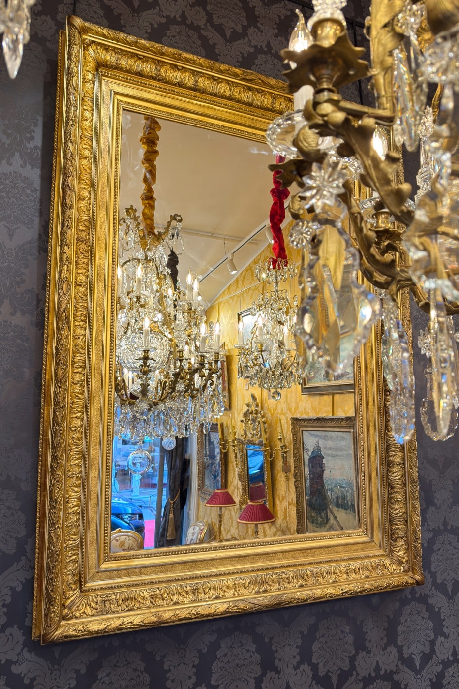 Un important et décoratif miroir en bois sculpté et doré, orné de motifs en raies de cœur, de rangs de perles, de drapés, de feuilles d’acanthe et de feuillage, typiques des éléments décoratifs du style Louis XVI. Réalisation française de qualité, datée de la fin du XVIIIème 1790-1800.
