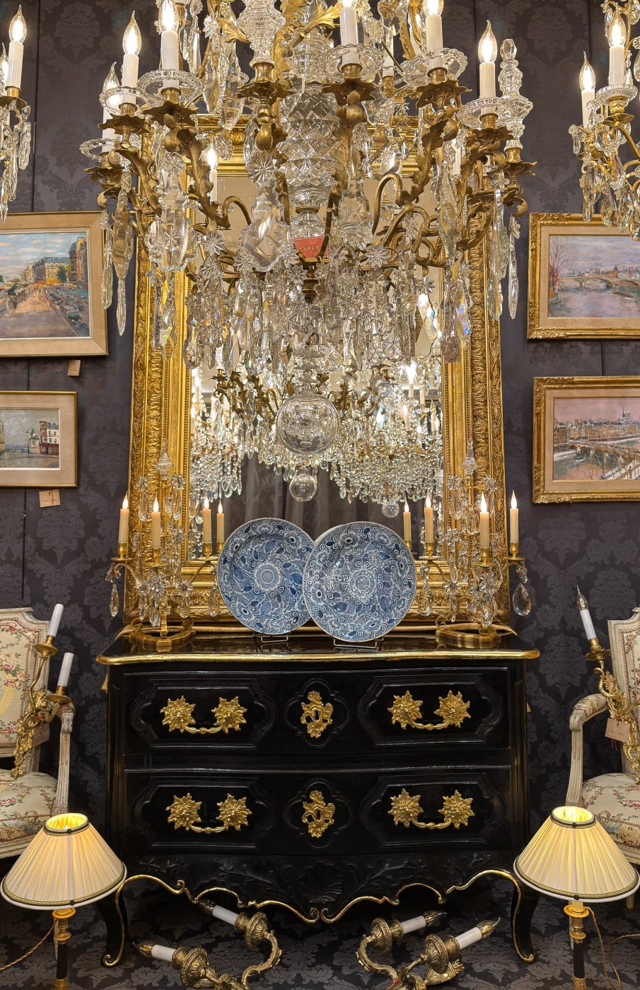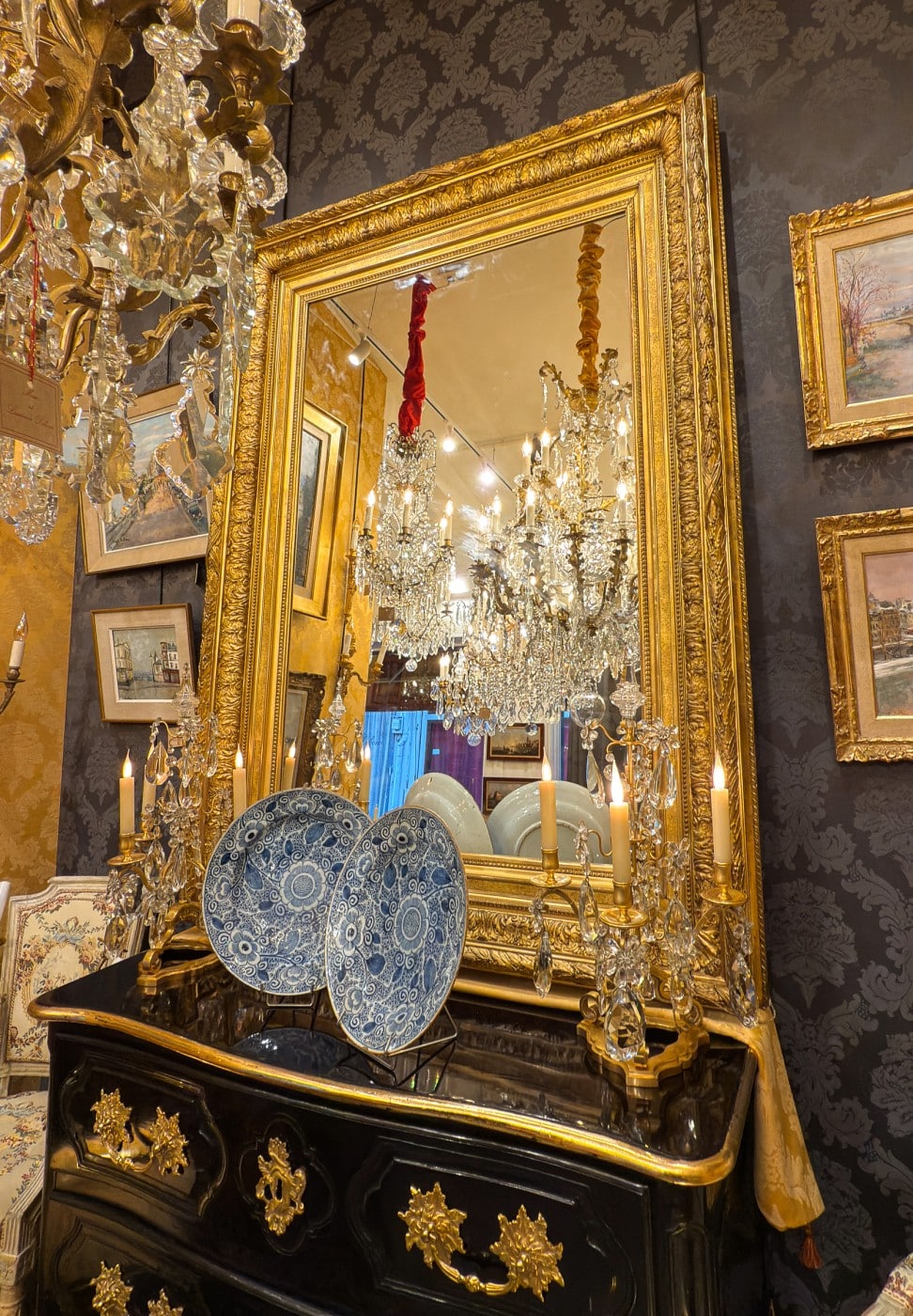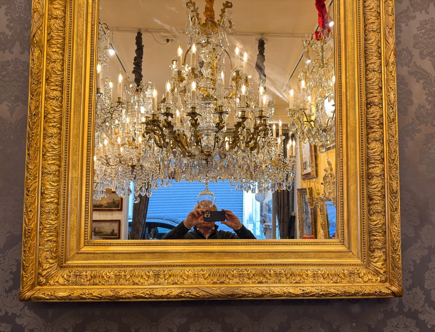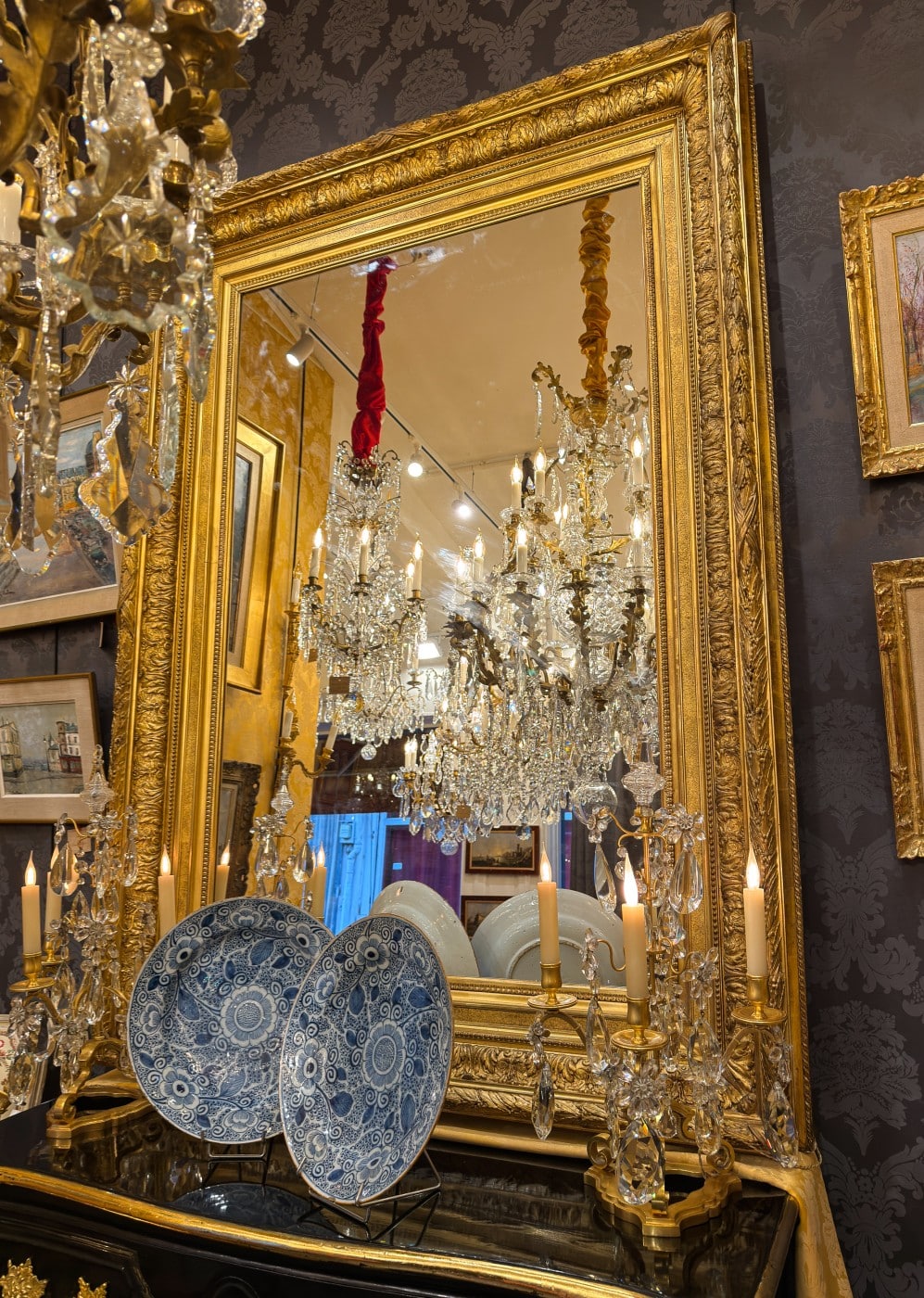 Un important et décoratif miroir en bois sculpté et doré, orné de motifs en raies de cœur, de rangs de perles, de drapés, de feuilles d’acanthe et de feuillage, typiques des éléments décoratifs du style Louis XVI. Réalisation française de qualité, datée de la fin du XVIIIème 1790-1800.