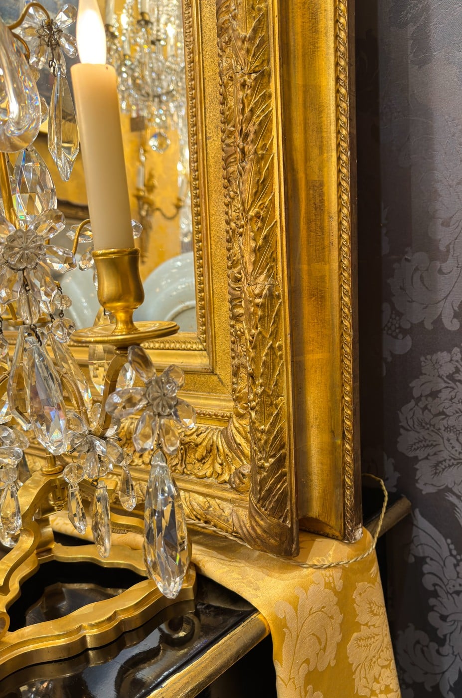 In overall good condition, with some localized touch-ups to the gilding. The mirror glass has been replaced.