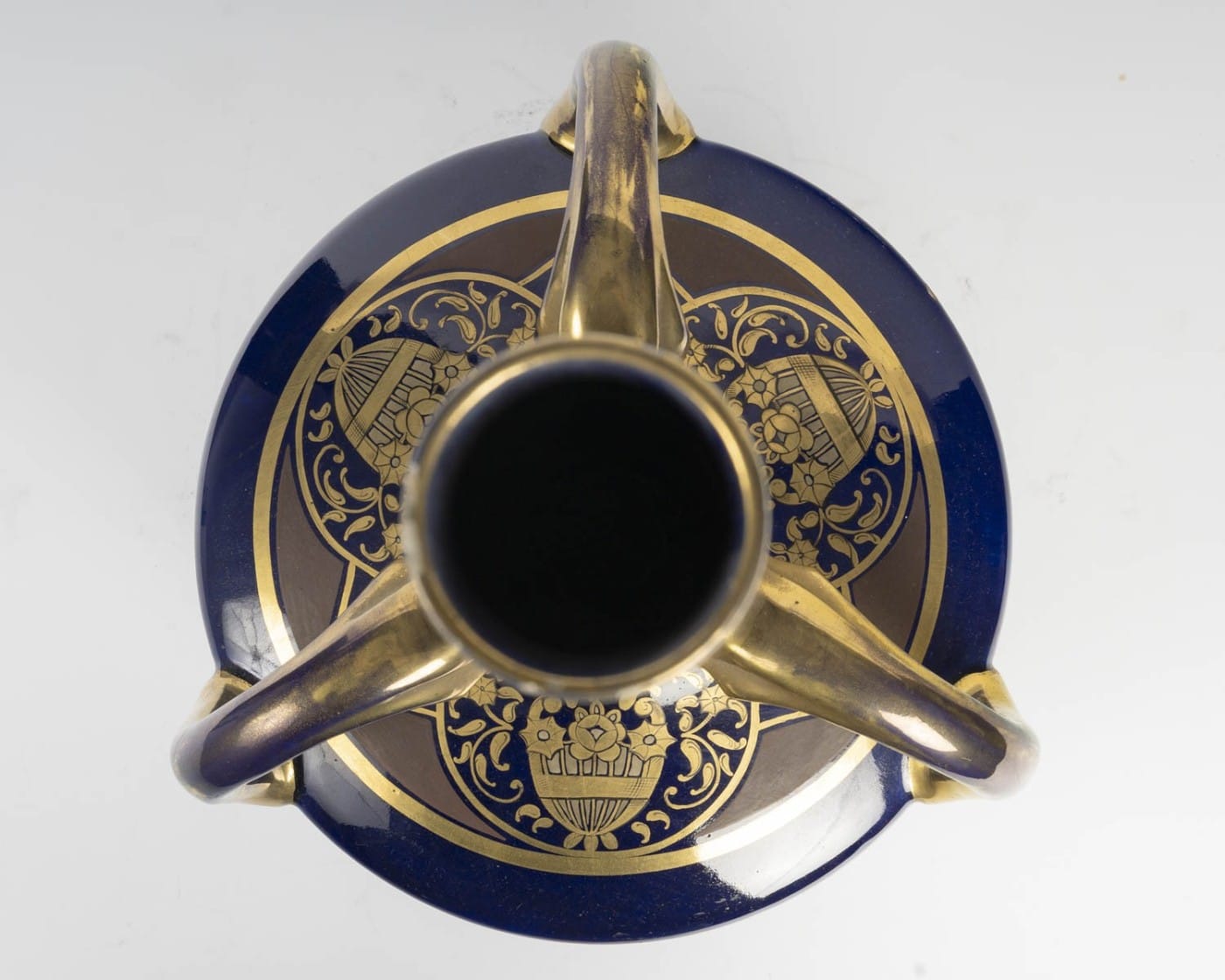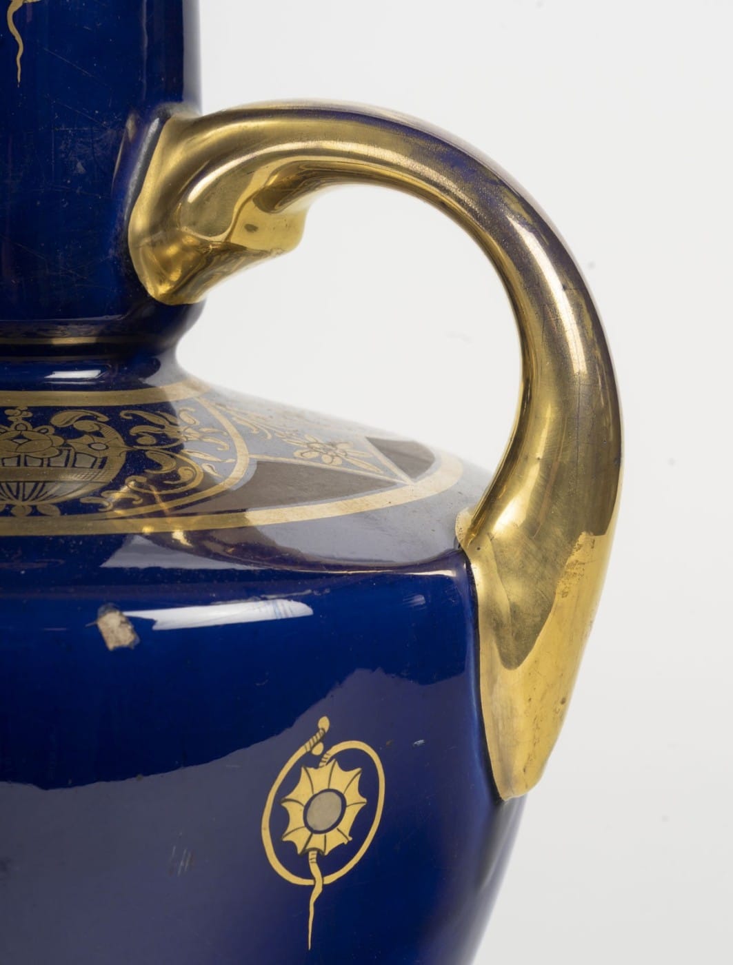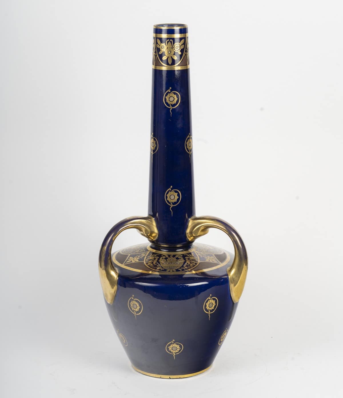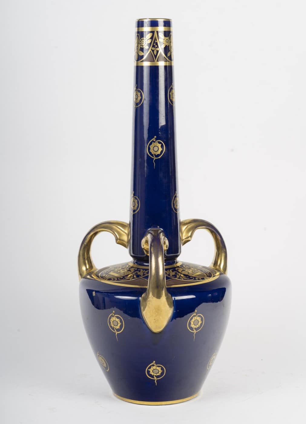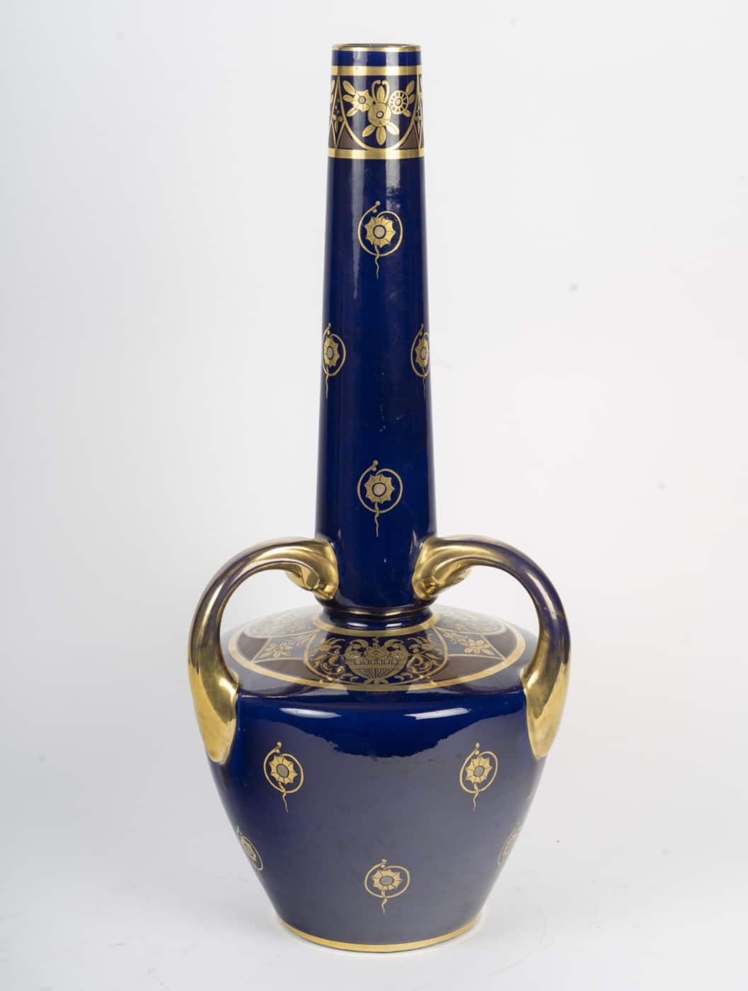 Grand vase en porcelaine bleue de Sèvres à décor floral doré.