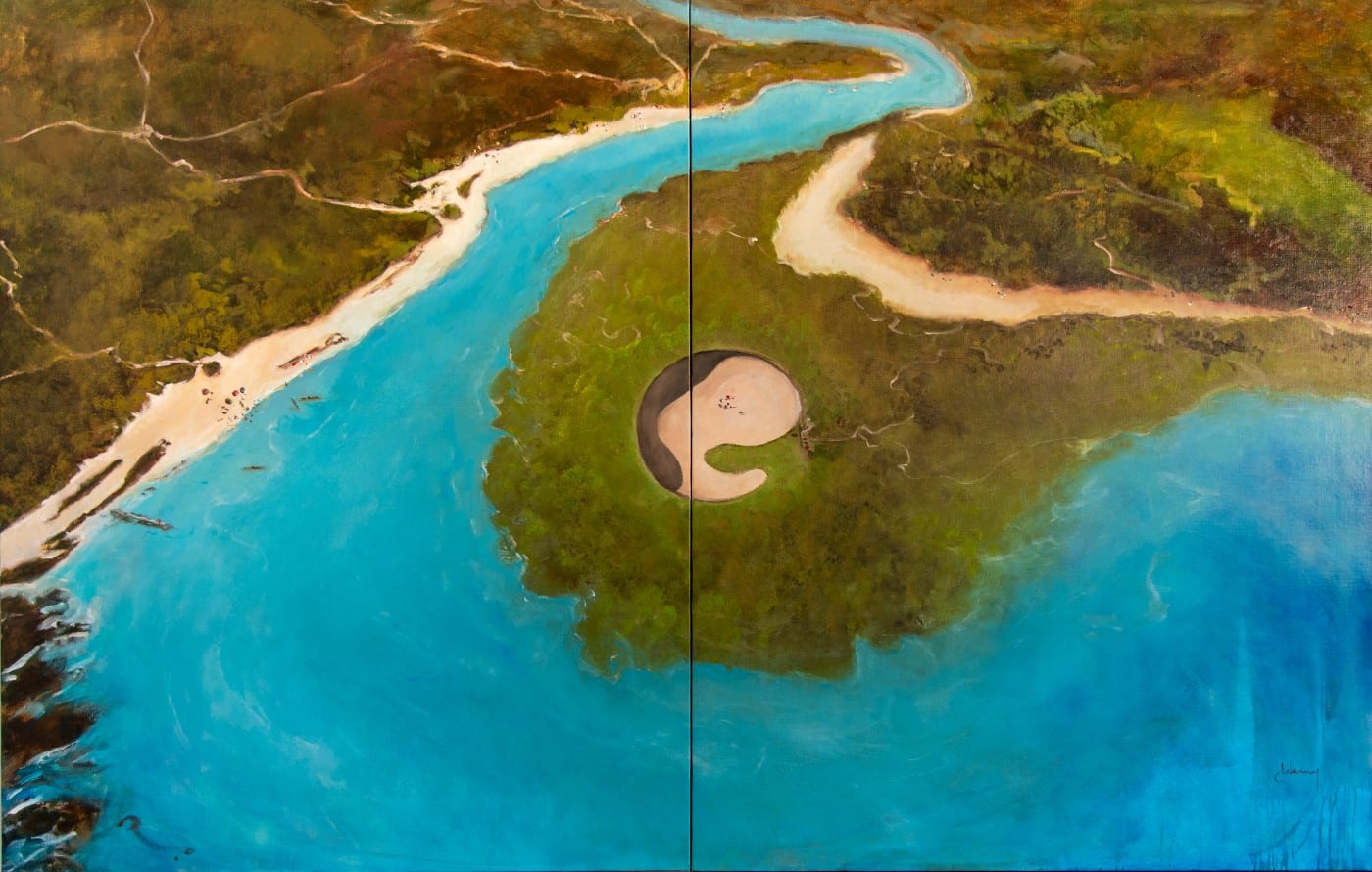 Cette oeuvre intitulée « Green Secret, Le Veillon » est un diptyque, Huiles sur toile de dimension 146×114 x 2 cm issue de la série maritime 2025