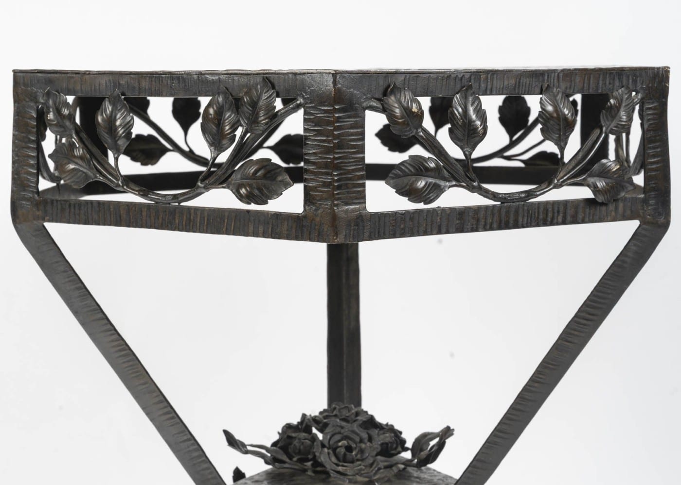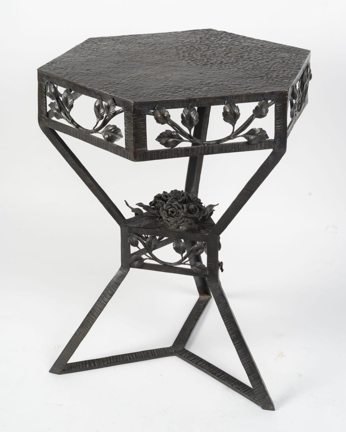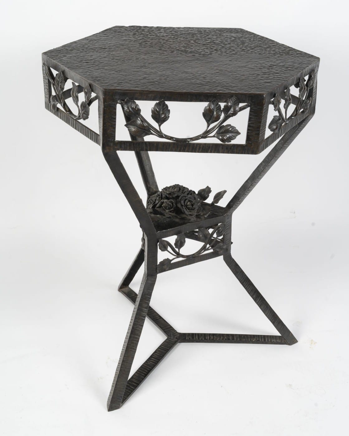 Elégant guéridon en fer forgé de style Art Déco, années 1940. Le plateau en cuivre martelé de forme hexagonale à patine brune est travaillé en dinanderie. Le piètement est garni de branches feuillues, un bouquet de roses orne le centre. Les pieds sont martelés formant des lignes parallèles.