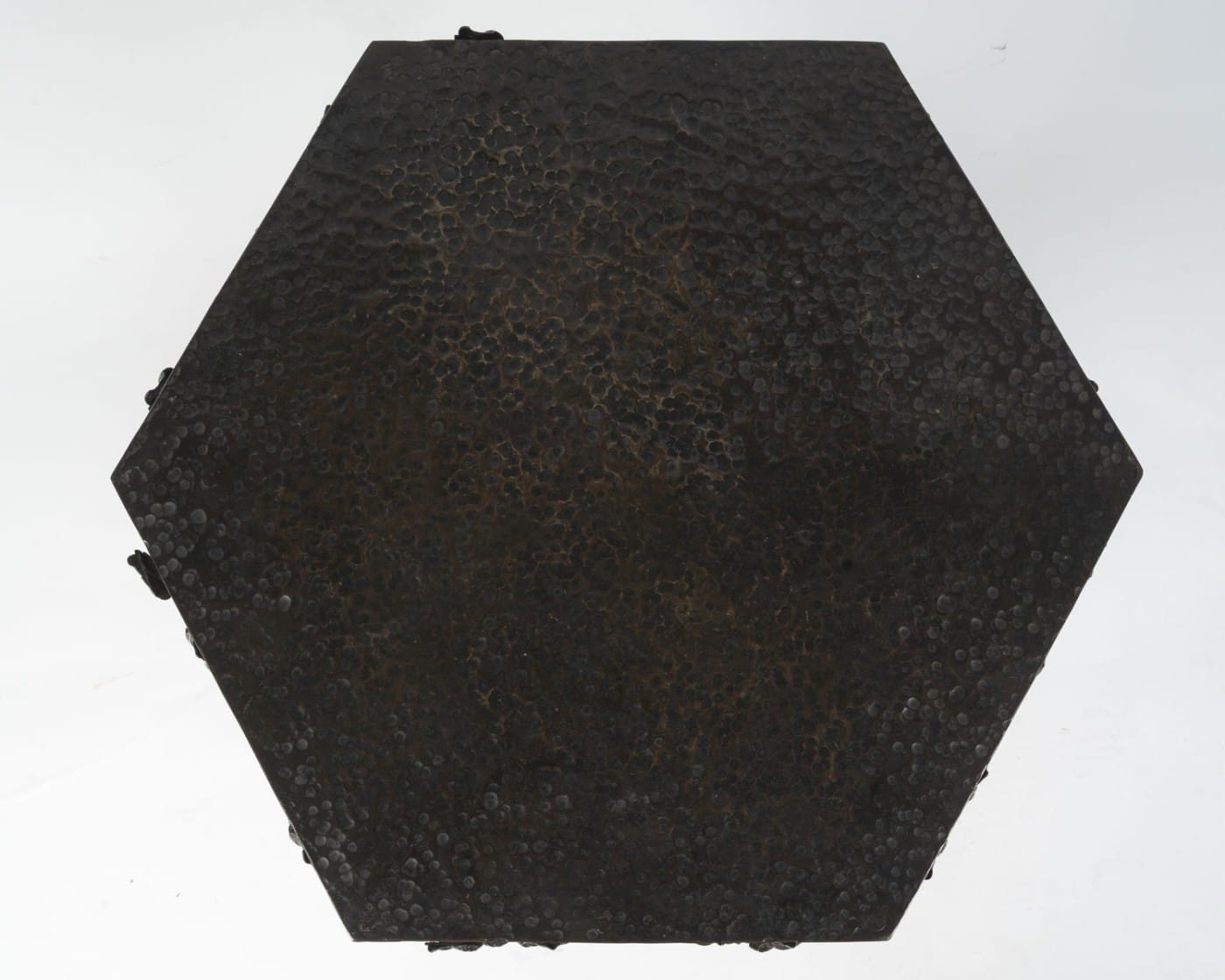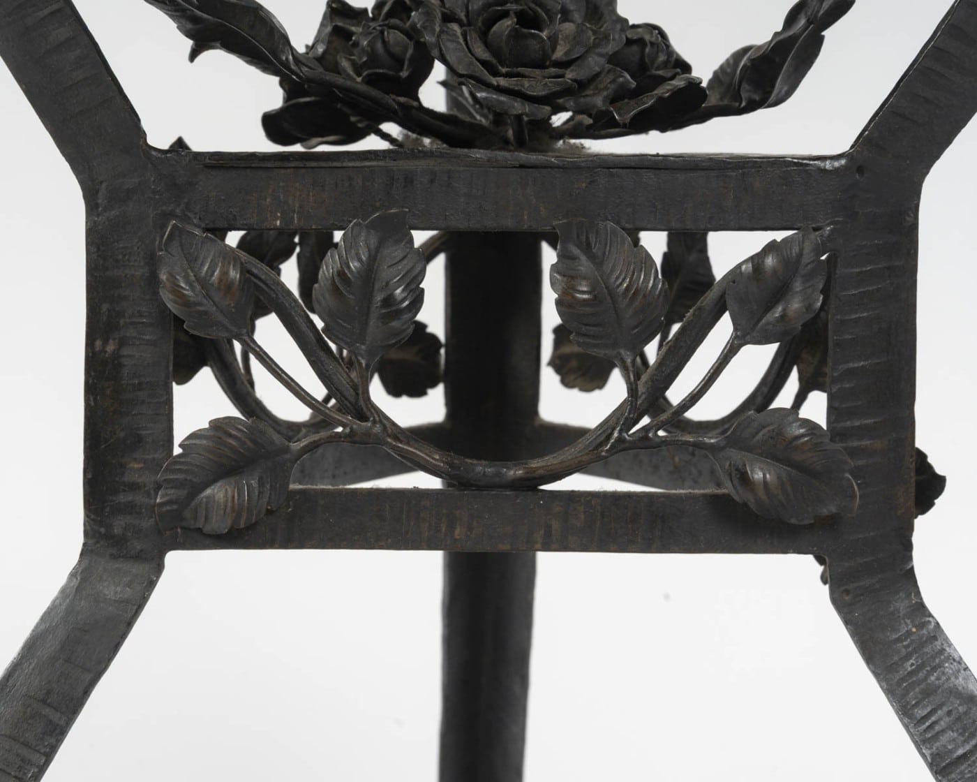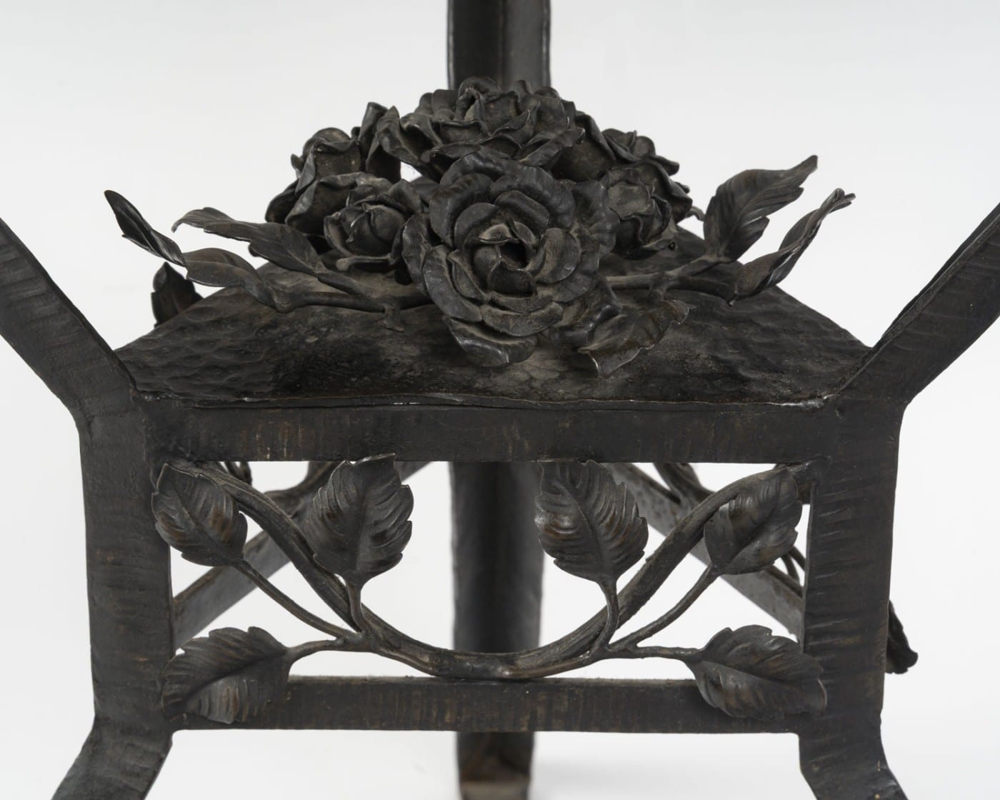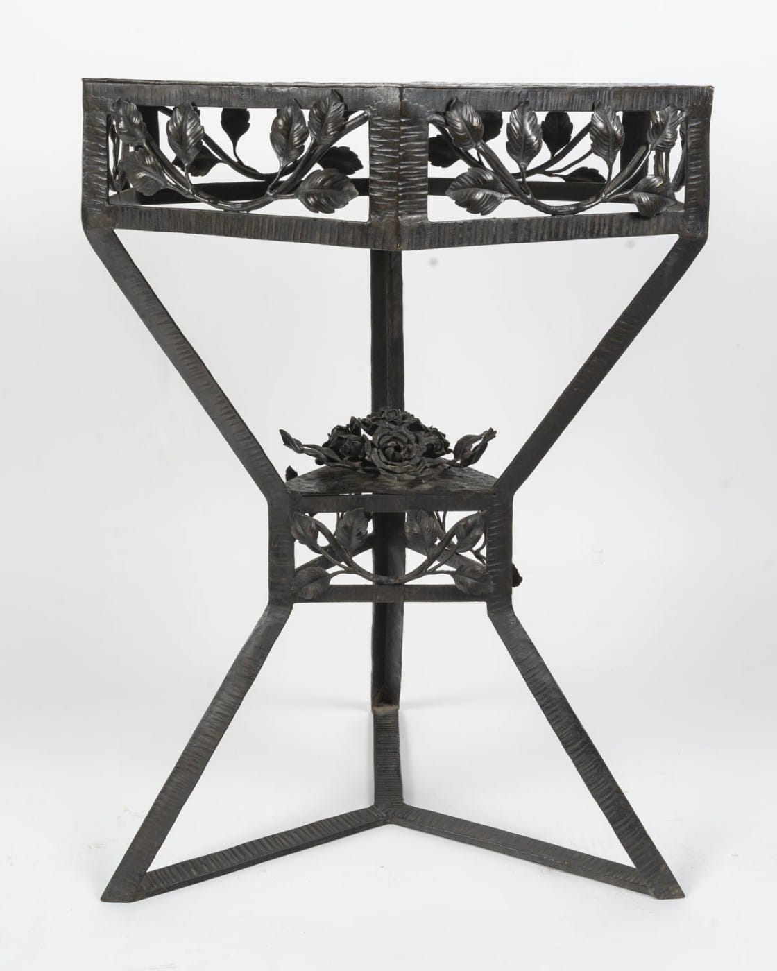 Elégant guéridon en fer forgé de style Art Déco, années 1940. Le plateau en cuivre martelé de forme hexagonale à patine brune est travaillé en dinanderie. Le piètement est garni de branches feuillues, un bouquet de roses orne le centre. Les pieds sont martelés formant des lignes parallèles.