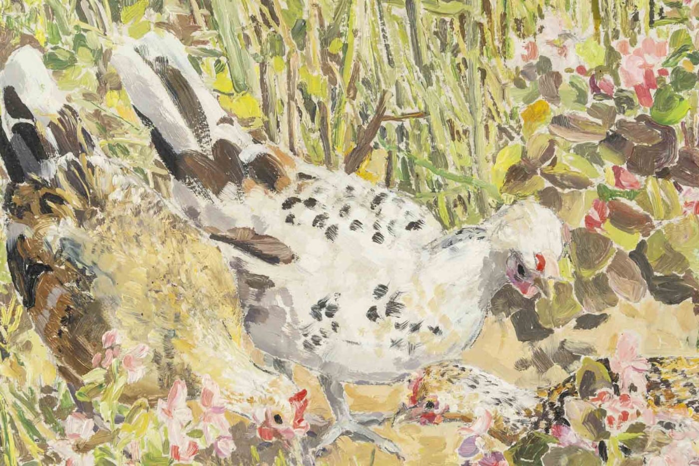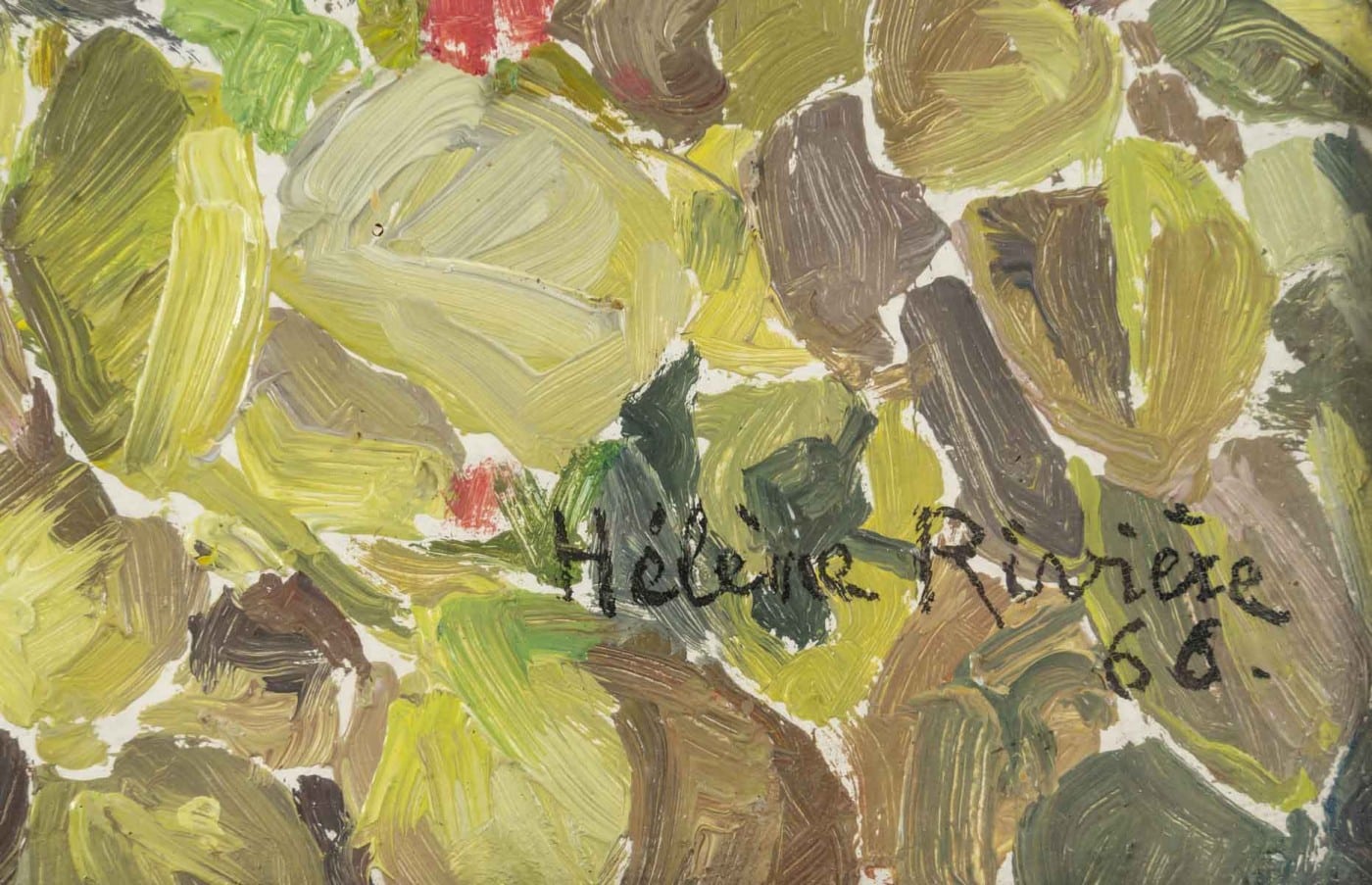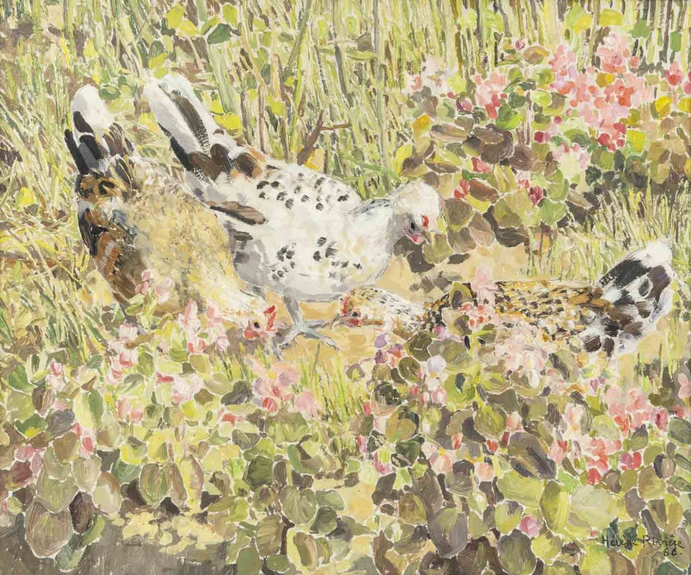 Voici quelques poules en liberté picorant au milieu de fleurs, un sujet excécuté avec vivacité et en couleur. Hélène RIVIERE nait en 1896 à Toulouse. Fille du sculpteur Jean Rivière professeur à l’école des Beaux-Arts de Toulouse, elle expose très jeune à partir de 1920 par l’intermédiaire de la Société des artistes Méridionaux. Puis de 1926 à 1940, elle expose au Salon des artistes français et obtient une médaille d’or en 1935. C’est en 1937 qu’elle reçoit le prix Rosa-Bonheur. Filleule du peintre Henri Martin elle débute par la peinture de paysages puis se spécialise dans la peinture de fleurs et de basses-cours. Elle enseignera aussi le dessin à l’école des Beaux-Arts de Toulouse.