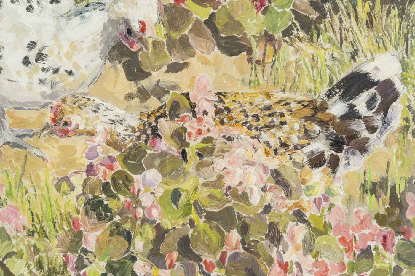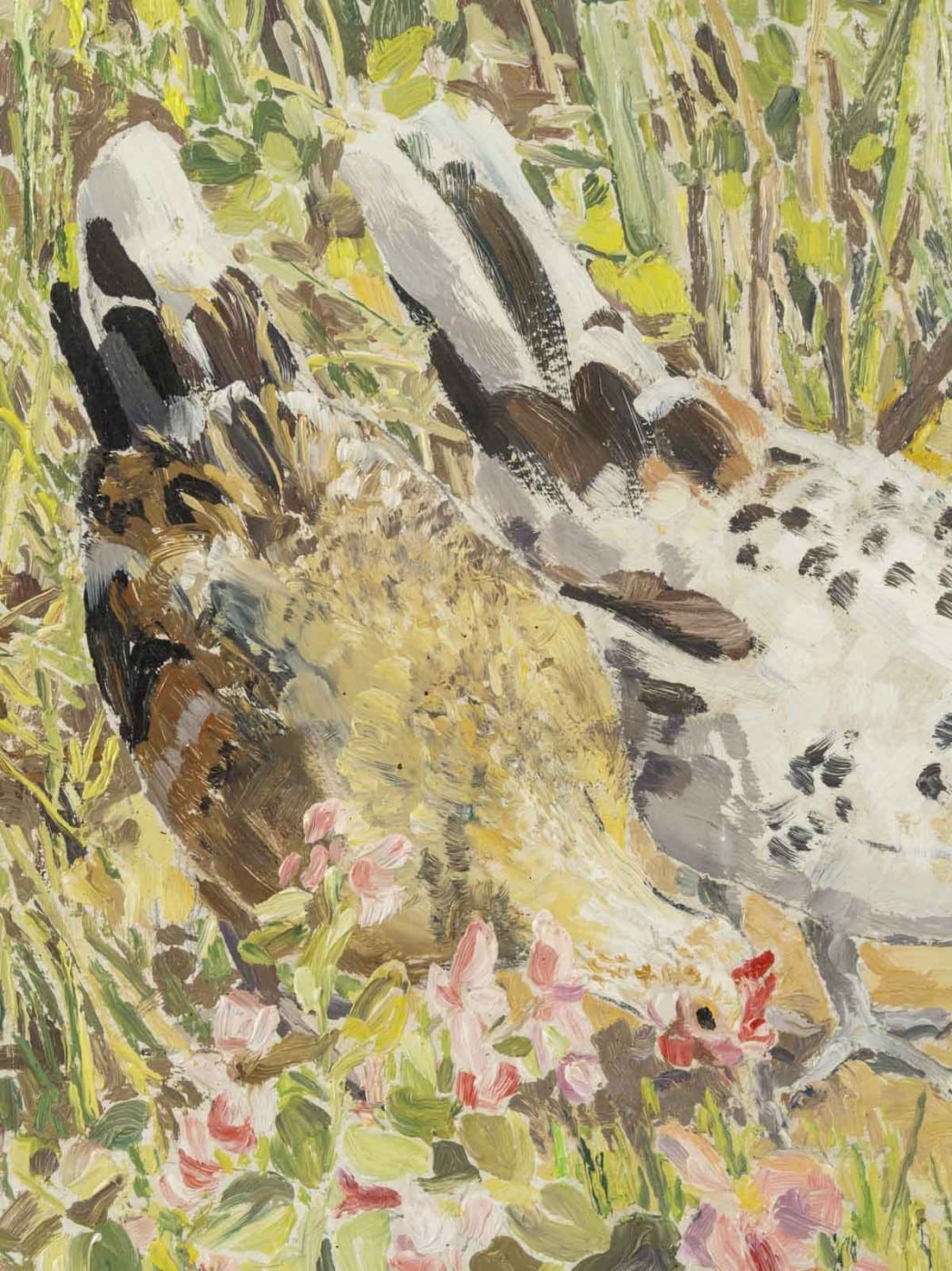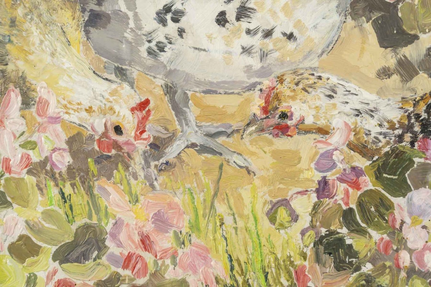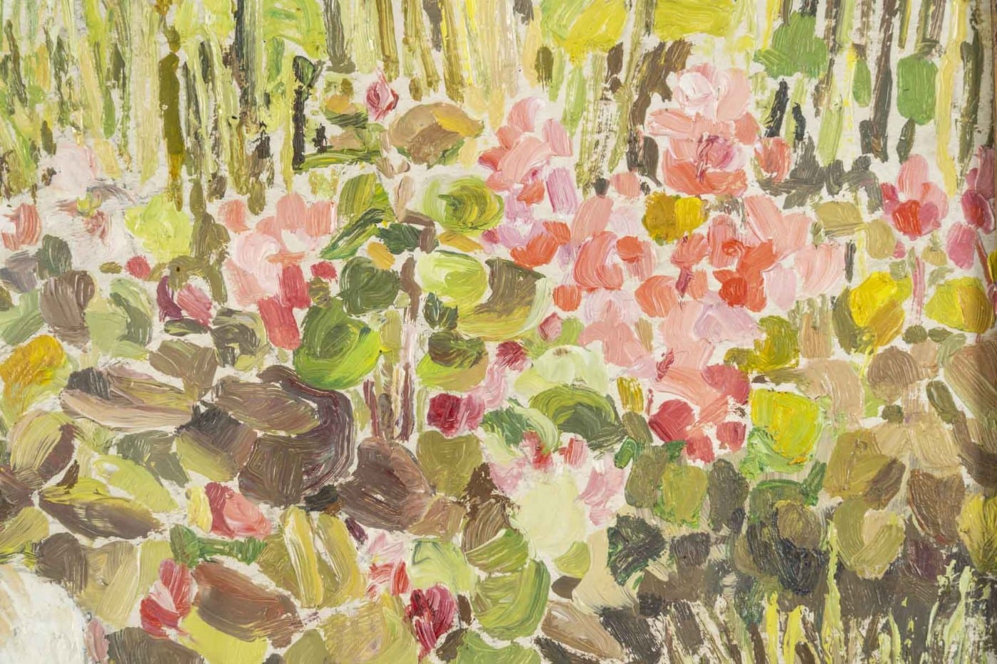 Voici quelques poules en liberté picorant au milieu de fleurs, un sujet excécuté avec vivacité et en couleur. Hélène RIVIERE nait en 1896 à Toulouse. Fille du sculpteur Jean Rivière professeur à l’école des Beaux-Arts de Toulouse, elle expose très jeune à partir de 1920 par l’intermédiaire de la Société des artistes Méridionaux. Puis de 1926 à 1940, elle expose au Salon des artistes français et obtient une médaille d’or en 1935. C’est en 1937 qu’elle reçoit le prix Rosa-Bonheur. Filleule du peintre Henri Martin elle débute par la peinture de paysages puis se spécialise dans la peinture de fleurs et de basses-cours. Elle enseignera aussi le dessin à l’école des Beaux-Arts de Toulouse.