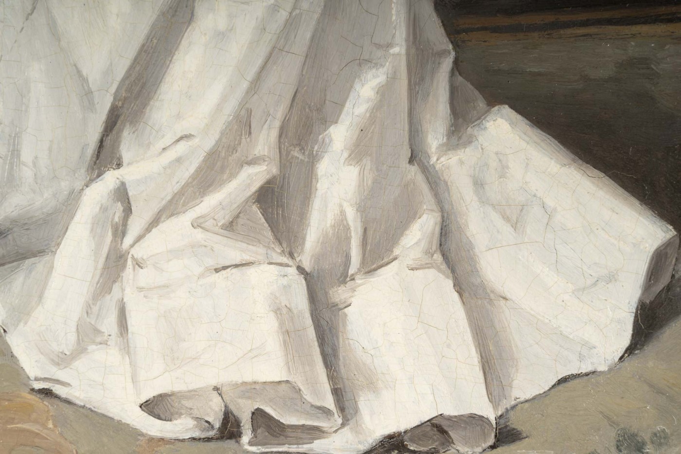 Sa robe blanche immaculée, aux plis structurés, illumine la scène