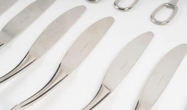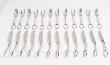 Original par sa forme et sa prise, le service Grand Attelage s’inspire de la clé de selle, une pièce utilisée dans les attelages à plusieurs chevaux.Cette série en métakl argenté comprend :
