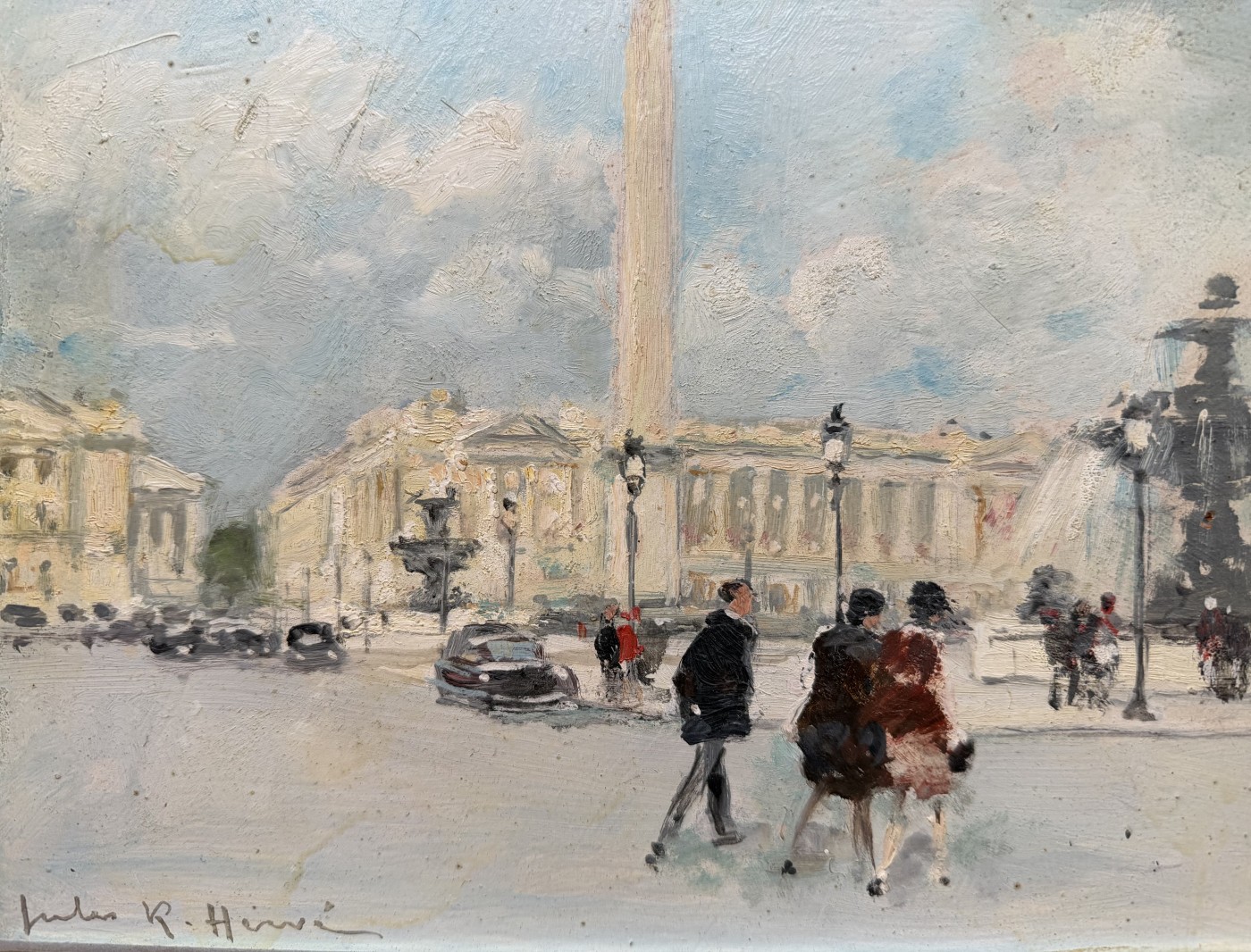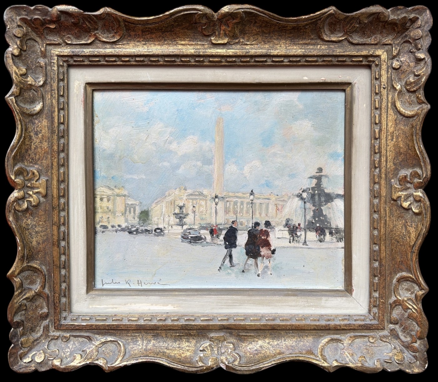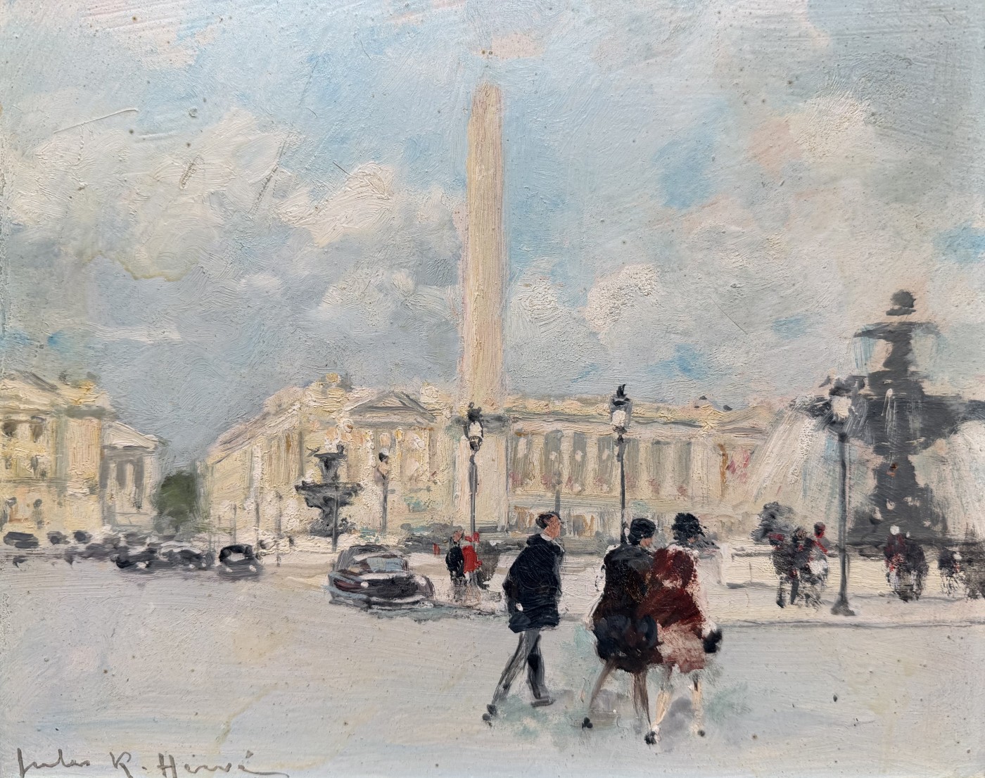Musées : Annecy , Calais , Casablanca , Chicago , Dijon , Langres , Luxeuil-Les-Bains , Montreal , New York , Paris , Saint-Etienne , Tourcoing , Troyes . Littérature : Bénézit – Dictionnaire des petits maîtres de la peinture par Gérald Schurr et Pierre Cabanne – « Jules rené Hervé un maître enchanteur de la peinture du 20ème siècle » par Bernard Masson – « Le haut du pavé de Langres » par Gérard Gueniot – Le peintre et l’animal en France au 19ème siècle par Elisabeth Hardouin-Fugier – Jules René HERVE, Né à Langres ( Haute-Marne ) en 1887, Mort à Langres en 1981 Peintre de scènes typiques , figures , portraits , paysages . Elève de Fernand Cormon et de Jules Adler , Jules René Hervé s’installe à Paris et commence à exposer au Salon des Artistes Français en 1910 , Jules René Hervé y reçoit une médaille d’argent en 1914 et une médaille d’or en 1925 .Puis Jules René Hervé partage sa vie entre Paris et sa ville natale dont il peint , d’un pinceau léger , expert en petits éclats vifs sur des gris ou des ocres habilement répartis , les évènements humbles et pittoresques , les portraits de son austère société à l’existence monotone et feutrée – Mais Jules René Hervé sait tout aussi bien restituer l’atmosphère animée de la vie Parisienne et ses monuments ou les danseuses au foyer de l’Opéra -De ses compositions finement observées émanent de délicats sentiments – Apprécié des amateurs français et étrangers , Jules René Hervé s »est adonné à son art tout au long de sa vie -Jules René Hervé est considéré comme « le dernier des impressionnistes »