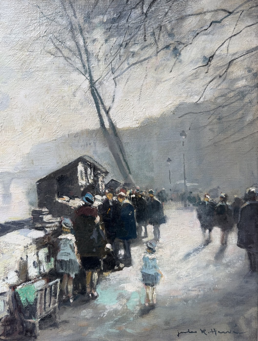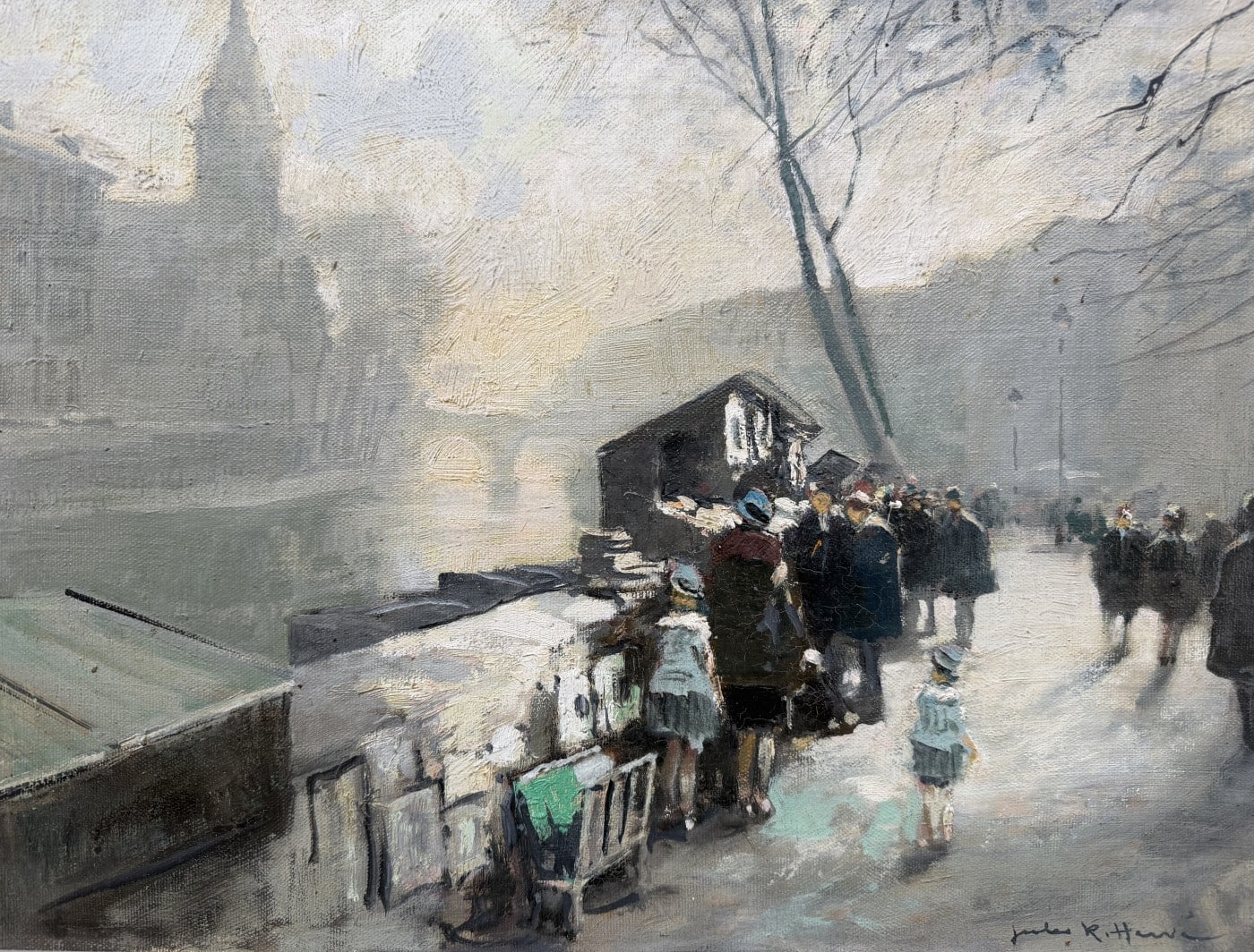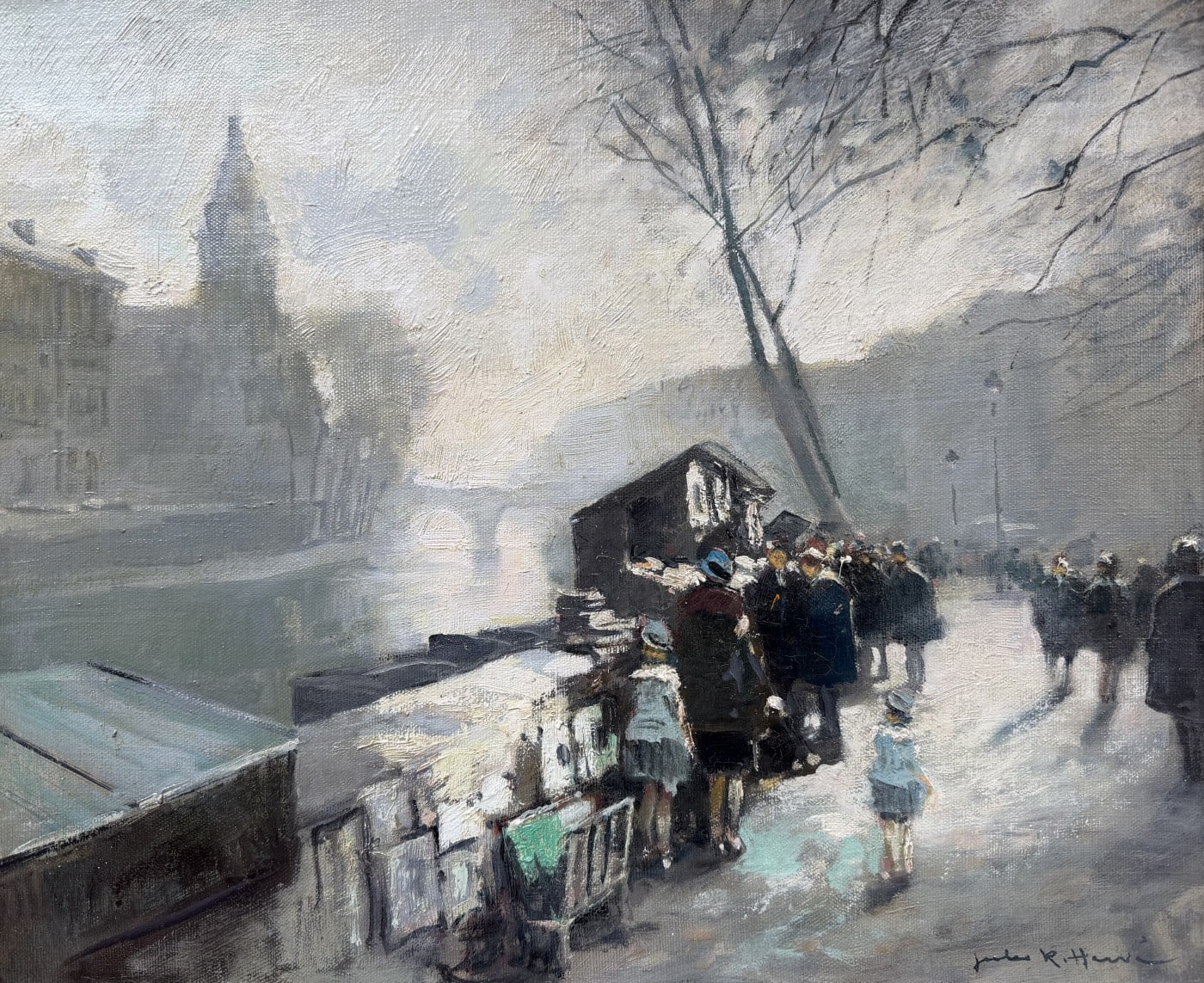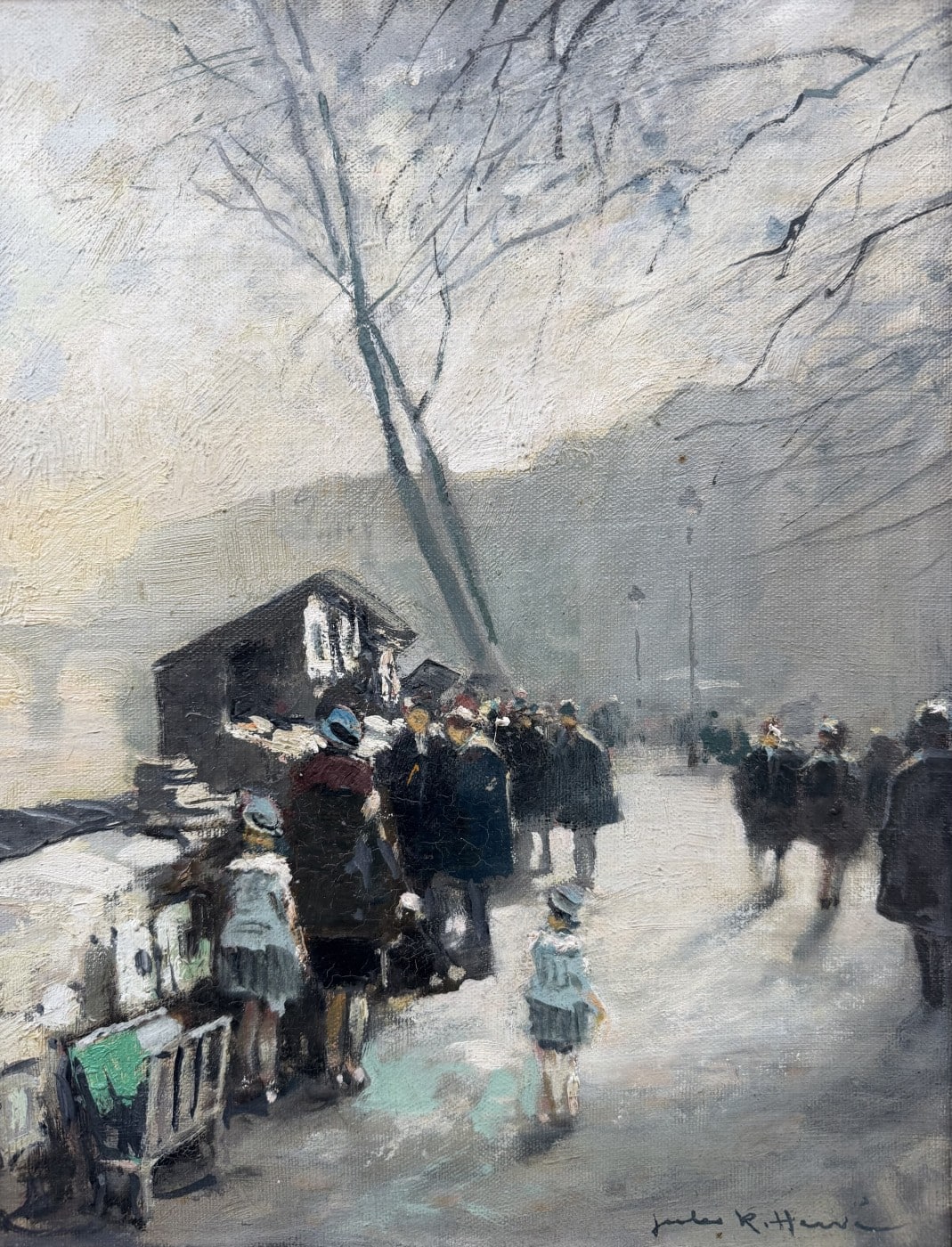 Jules René HERVE, Né à Langres ( Haute-Marne ) en 1887, Mort à Langres en 1981 Peintre de scènes typiques , figures , portraits , paysages . Elève de Fernand Cormon et de Jules Adler , Jules René Hervé s’installe à Paris et commence à exposer au Salon des Artistes Français en 1910 , Jules René Hervé y reçoit une médaille d’argent en 1914 et une médaille d’or en 1925 .Puis Jules René Hervé partage sa vie entre Paris et sa ville natale dont il peint , d’un pinceau léger , expert en petits éclats vifs sur des gris ou des ocres habilement répartis , les évènements humbles et pittoresques , les portraits de son austère société à l’existence monotone et feutrée – Mais Jules René Hervé sait tout aussi bien restituer l’atmosphère animée de la vie Parisienne et ses monuments ou les danseuses au foyer de l’Opéra -De ses compositions finement observées émanent de délicats sentiments – Apprécié des amateurs français et étrangers , Jules René Hervé s »est adonné à son art tout au long de sa vie -Jules René Hervé est considéré comme « le dernier des impressionnistes »