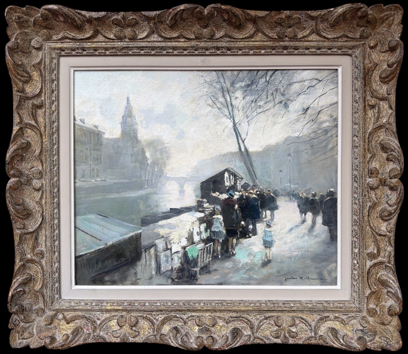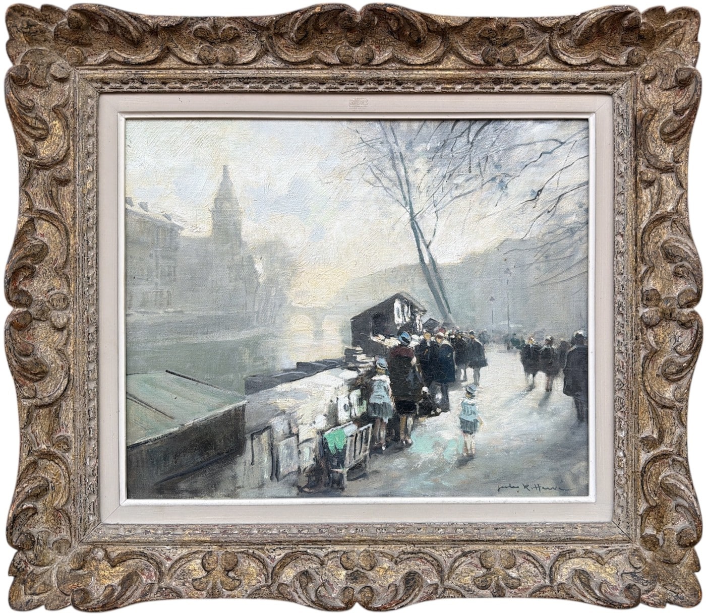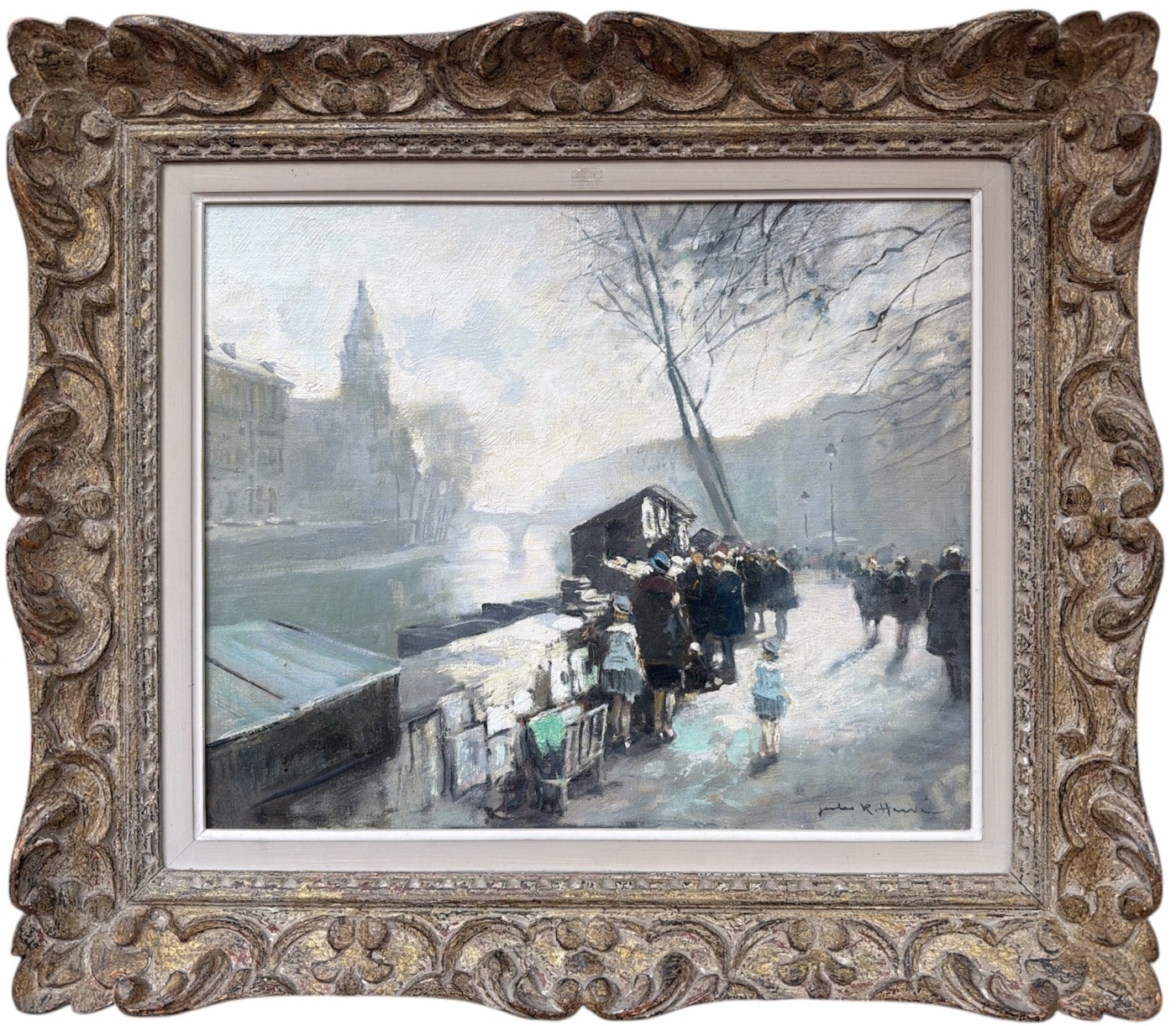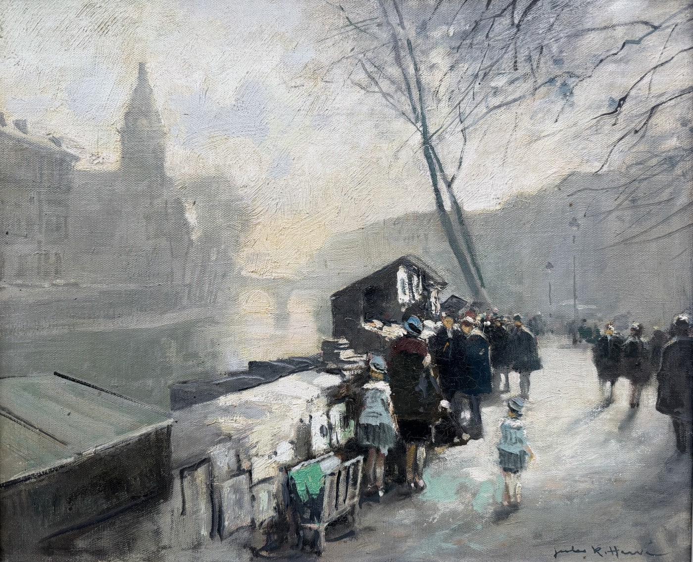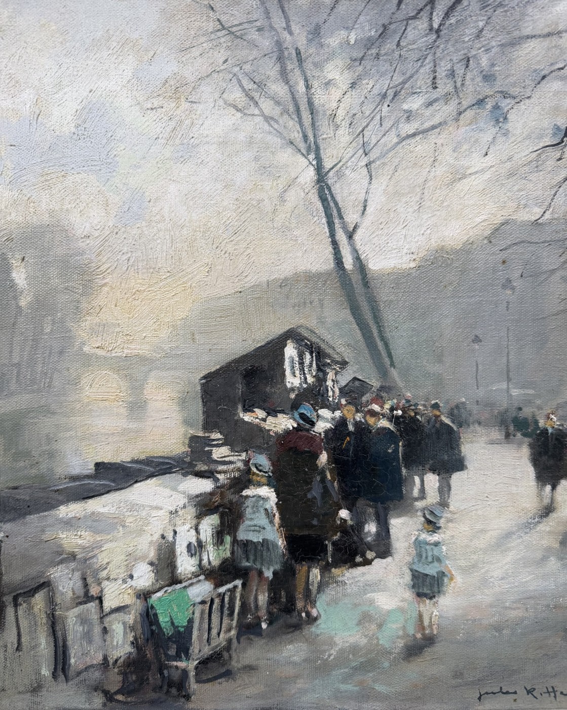 Jules René HERVE, Né à Langres ( Haute-Marne ) en 1887, Mort à Langres en 1981 Peintre de scènes typiques , figures , portraits , paysages . Elève de Fernand Cormon et de Jules Adler , Jules René Hervé s’installe à Paris et commence à exposer au Salon des Artistes Français en 1910 , Jules René Hervé y reçoit une médaille d’argent en 1914 et une médaille d’or en 1925 .Puis Jules René Hervé partage sa vie entre Paris et sa ville natale dont il peint , d’un pinceau léger , expert en petits éclats vifs sur des gris ou des ocres habilement répartis , les évènements humbles et pittoresques , les portraits de son austère société à l’existence monotone et feutrée – Mais Jules René Hervé sait tout aussi bien restituer l’atmosphère animée de la vie Parisienne et ses monuments ou les danseuses au foyer de l’Opéra -De ses compositions finement observées émanent de délicats sentiments – Apprécié des amateurs français et étrangers , Jules René Hervé s »est adonné à son art tout au long de sa vie -Jules René Hervé est considéré comme « le dernier des impressionnistes »