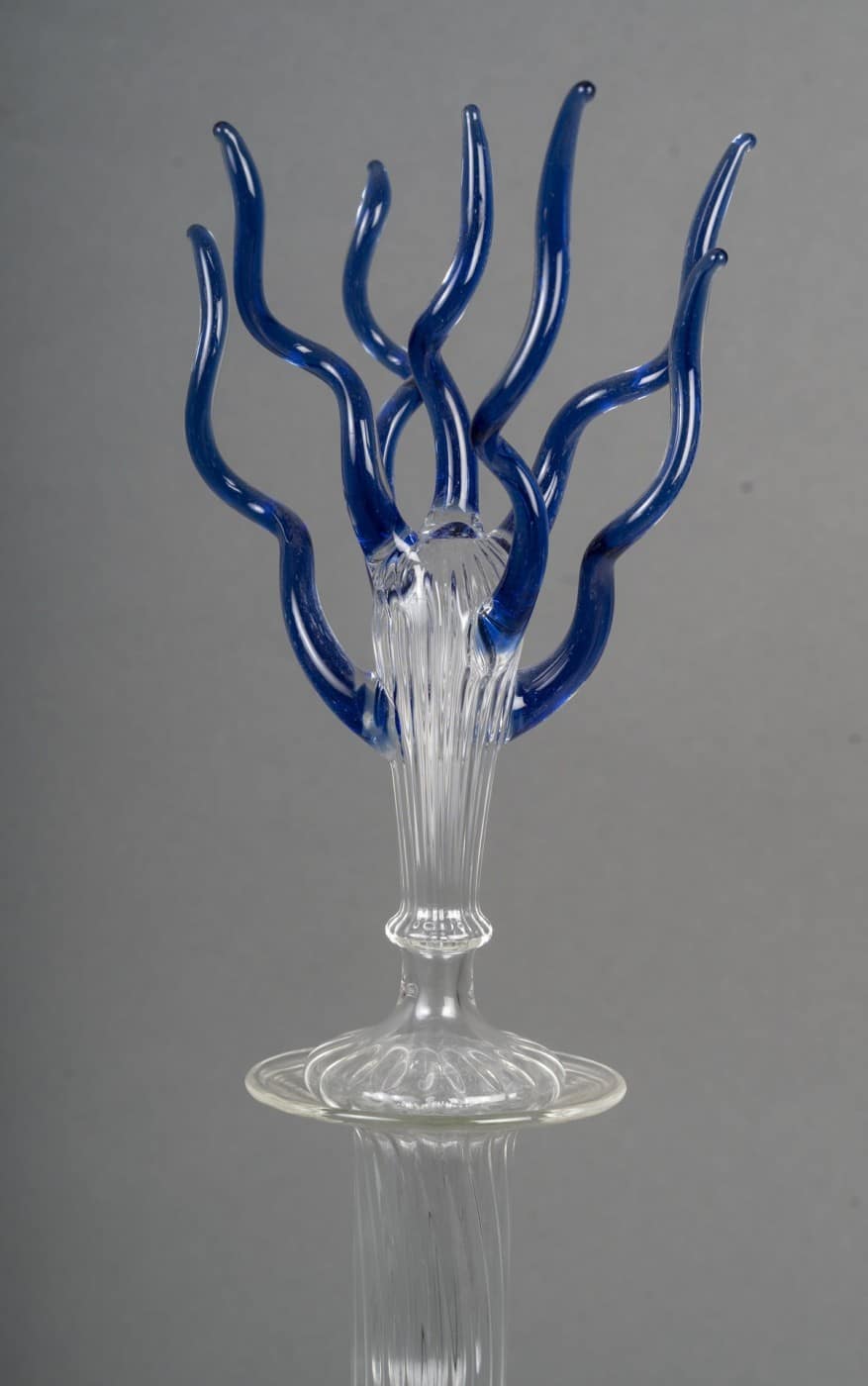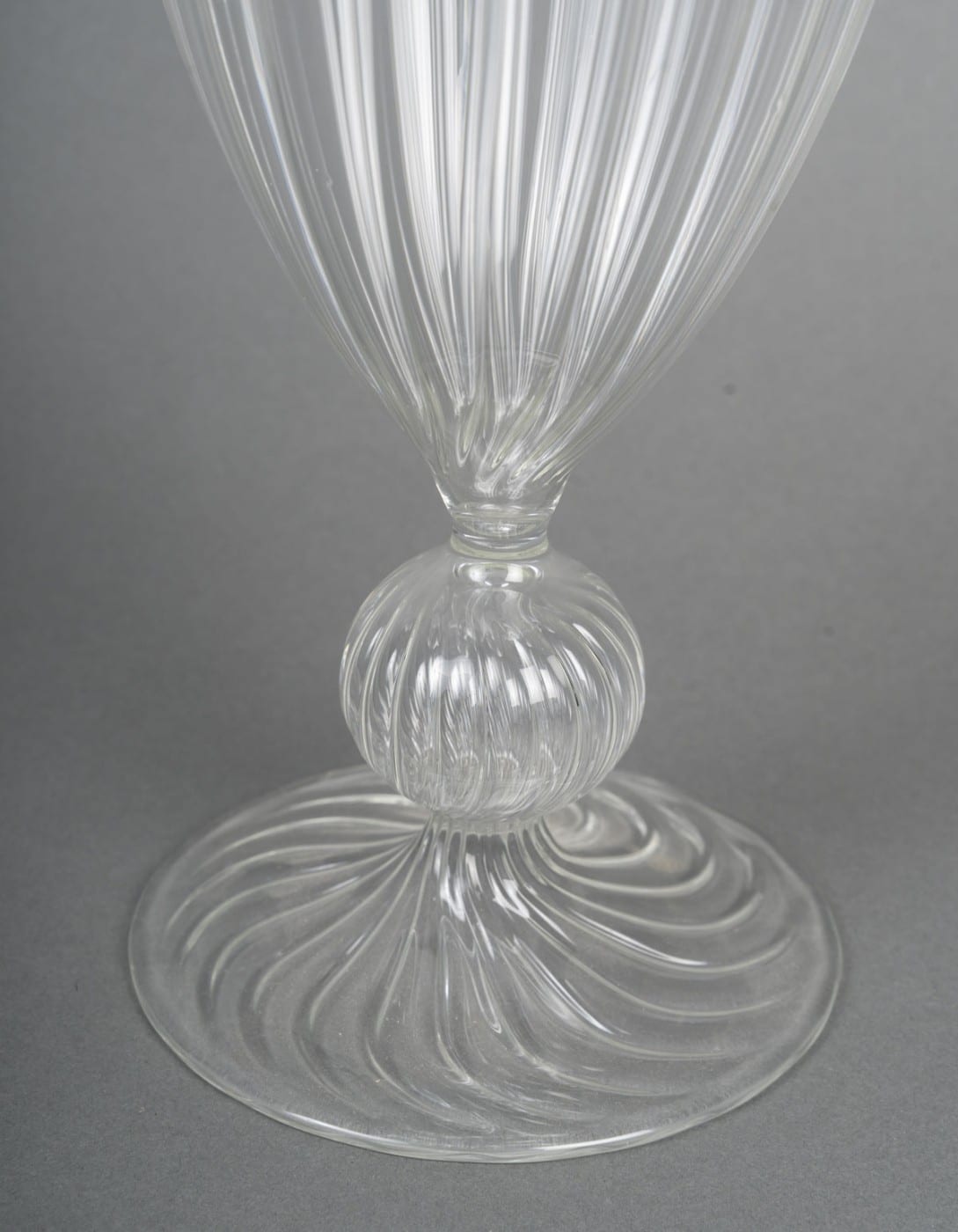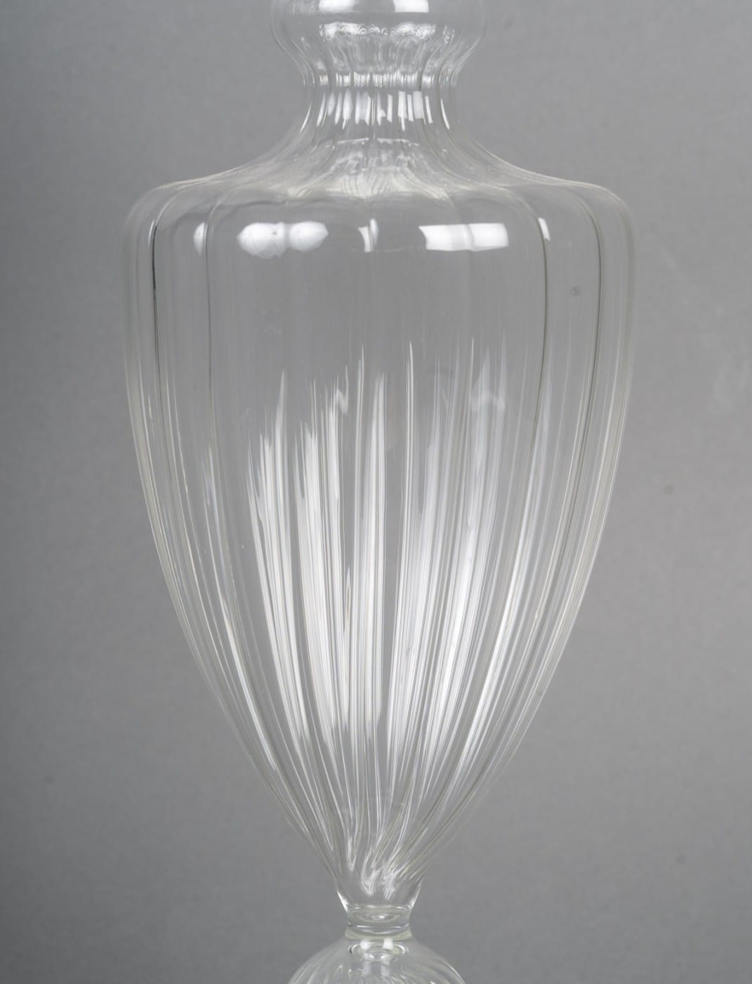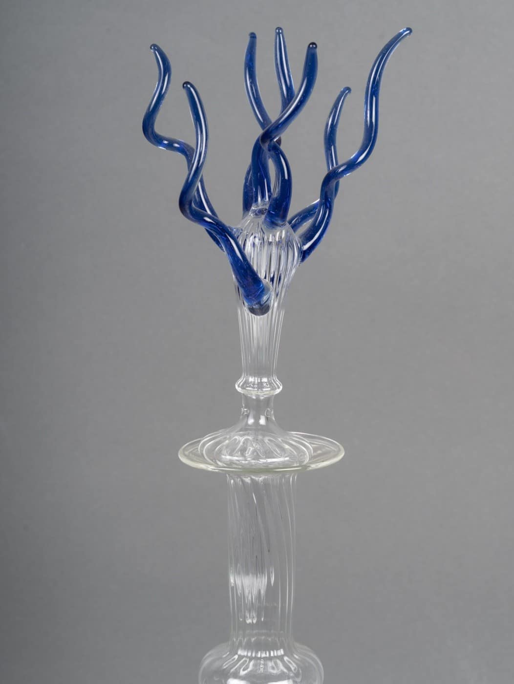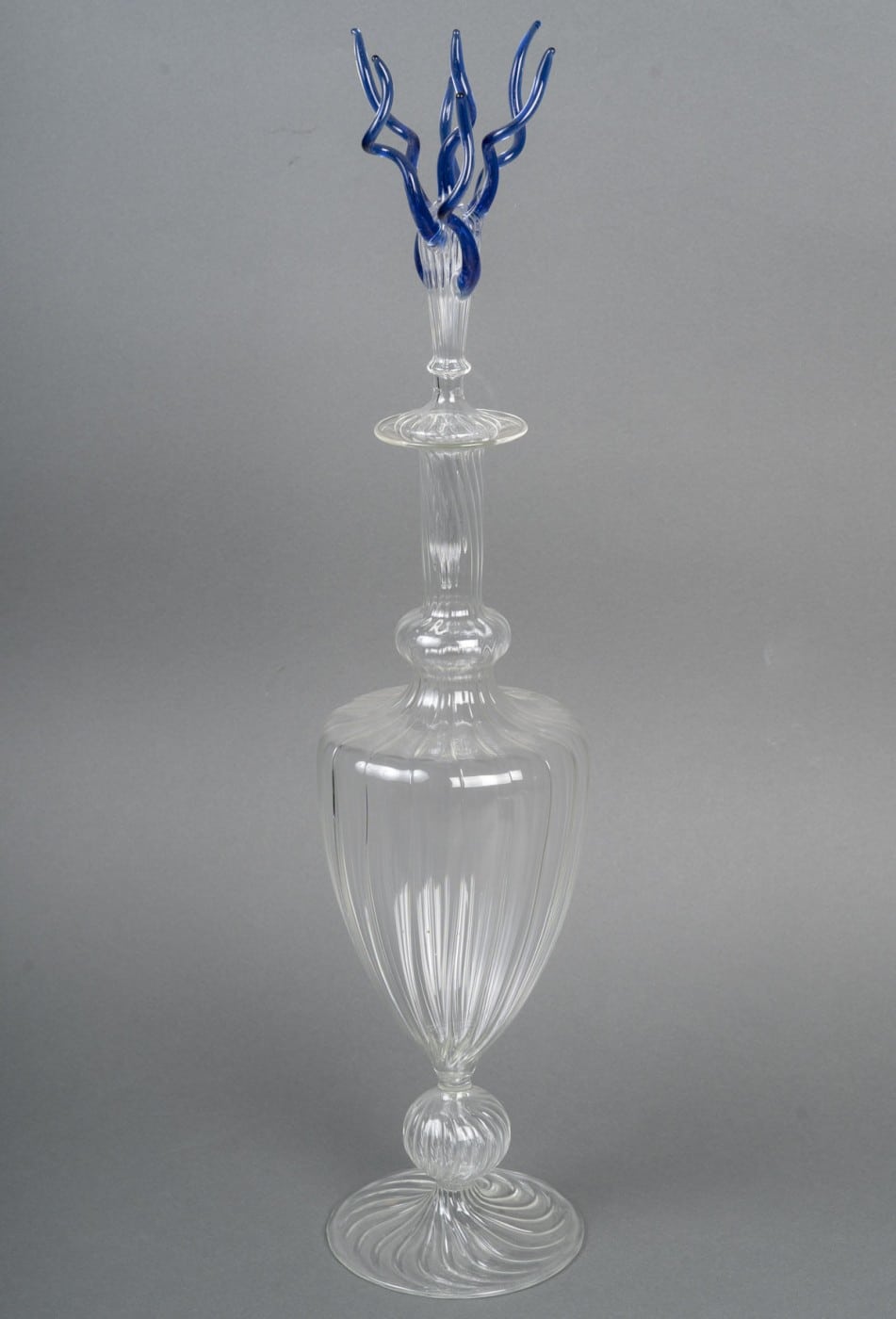 IMPORTANTE CARAFE en verre soufflé transparent et godronné, de forme balustre, le bouchon surmonté d’enroulements en verre bleu roi.
