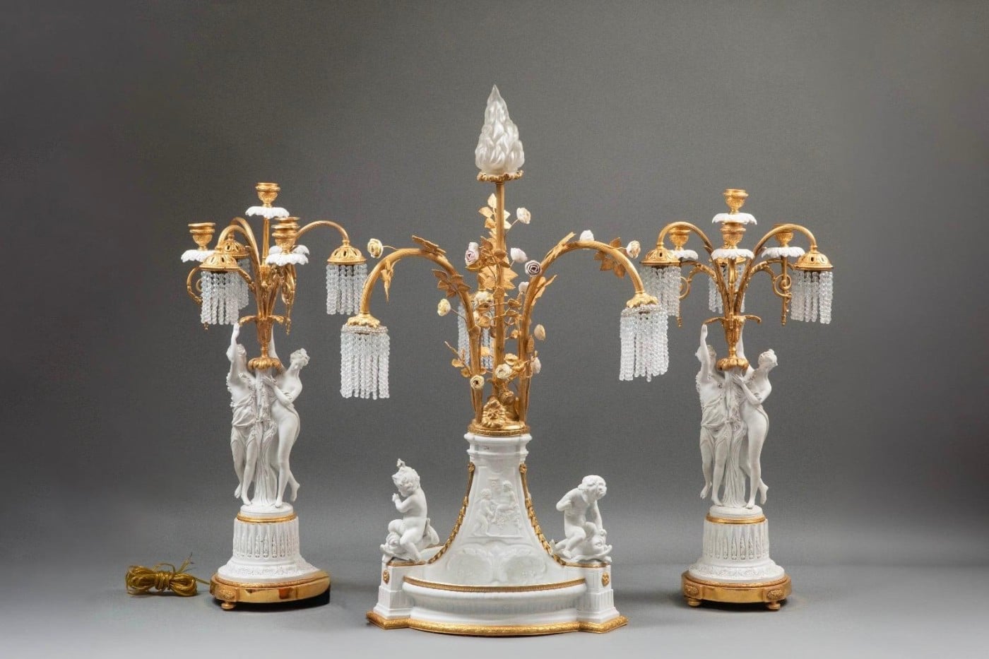 Le centre de table est orné de putti en biscuit, de fleurs en porcelaine polychrome et de bras de lumière décorés de pampilles. Les deux girandoles, également en biscuit et bronze doré, présentent des figures féminines allégoriques d’une grande finesse et portent trois lumières avec quatre emplacements pour bougies.