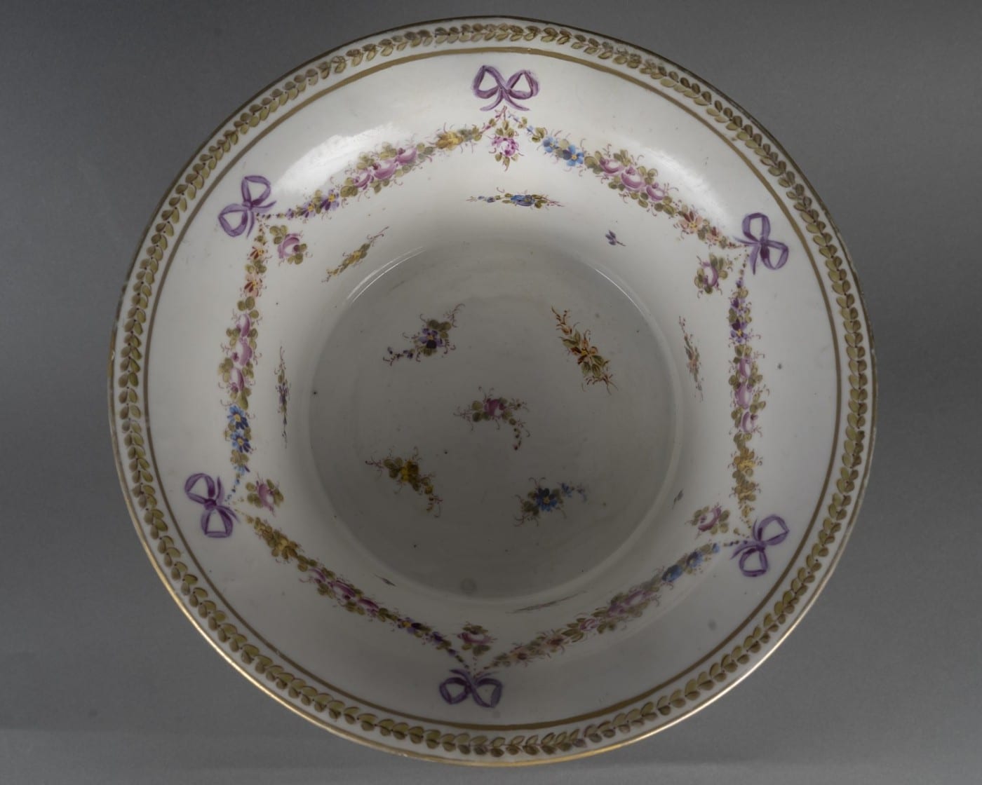 Charmante jardinière en porcelaine blanche finement décorée de guirlandes fleuries, rubans violets et motifs délicats peints à la main.