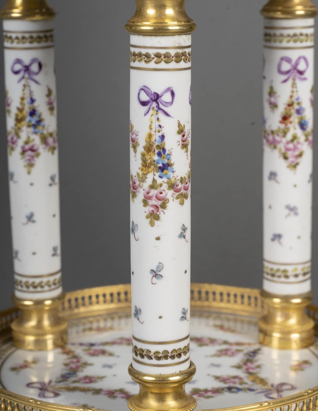 Elle repose sur trois colonnettes également ornées, reliées à une base circulaire en porcelaine encadrée d’une monture en bronze doré ciselé.