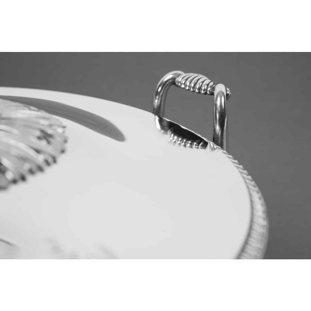 Légumier couvert en argent massif, le corps uni est doublé au col d’un liseré et flanqué de chaque côte d’anses garnies d’une demie coquille. Le couvercle est ceinturé d’une frise de palmettes et la prise est posée sur une terrasse de feuilles d’eau.