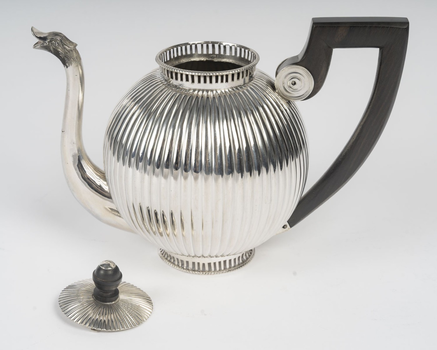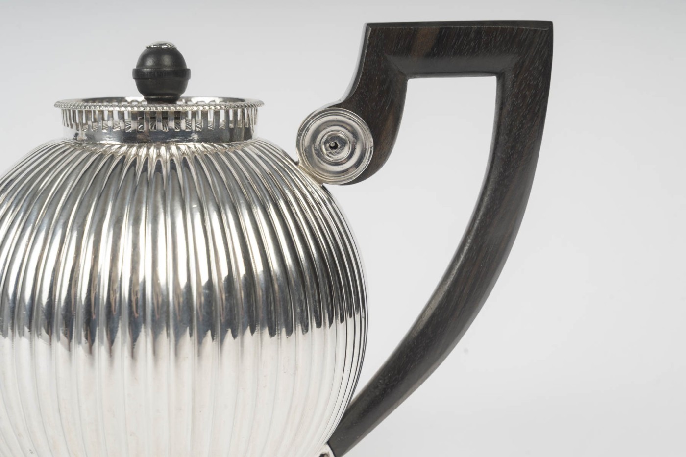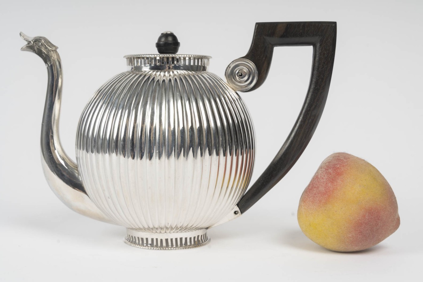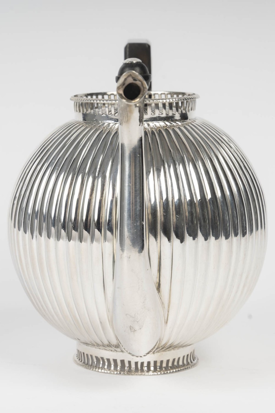 Théière en argent massif, le corps de forme boule à côtes de melon, repose sur une base ronde ajourée.