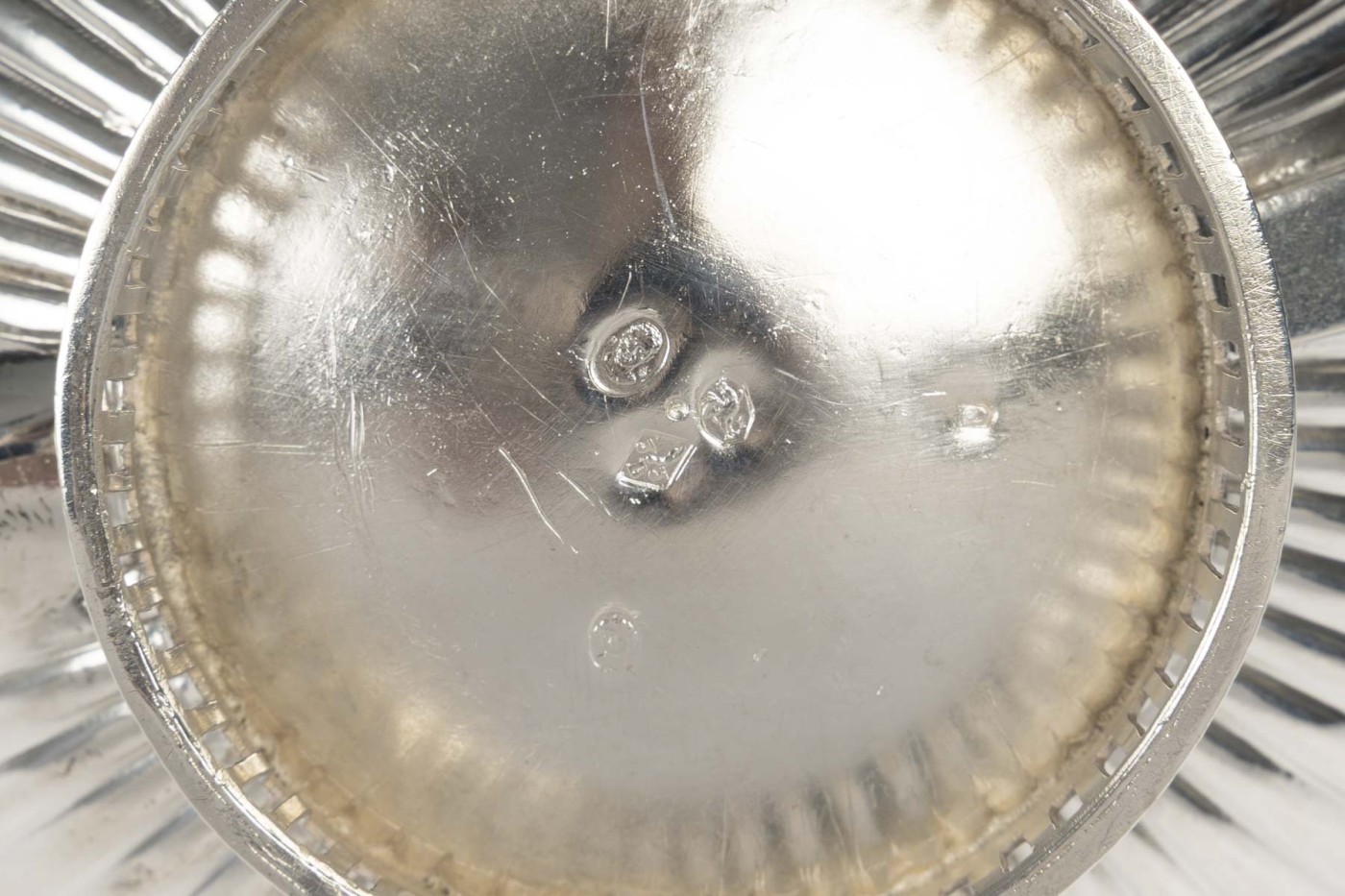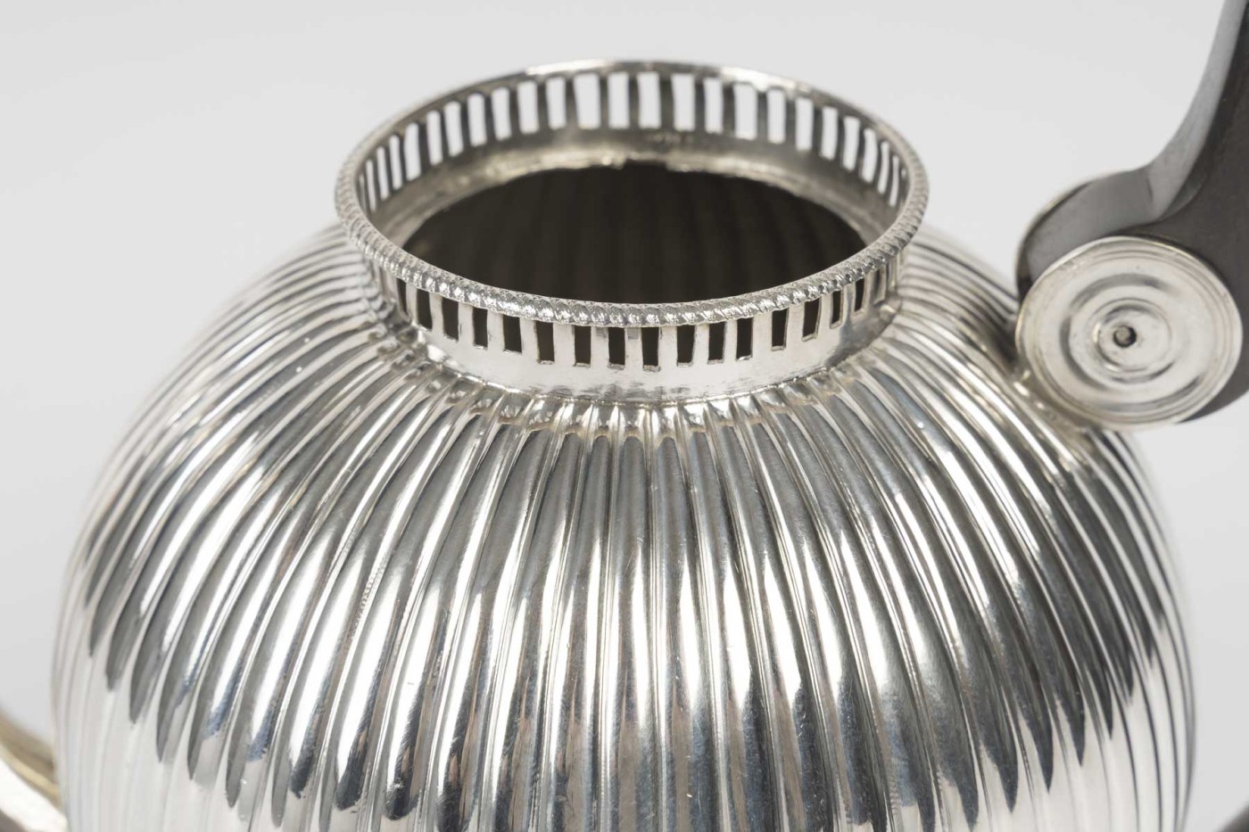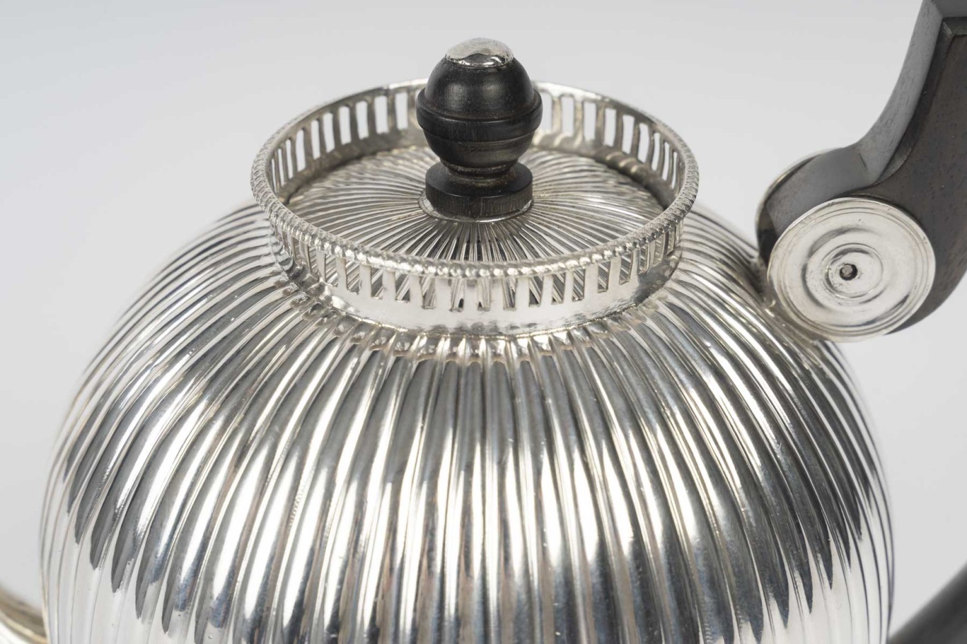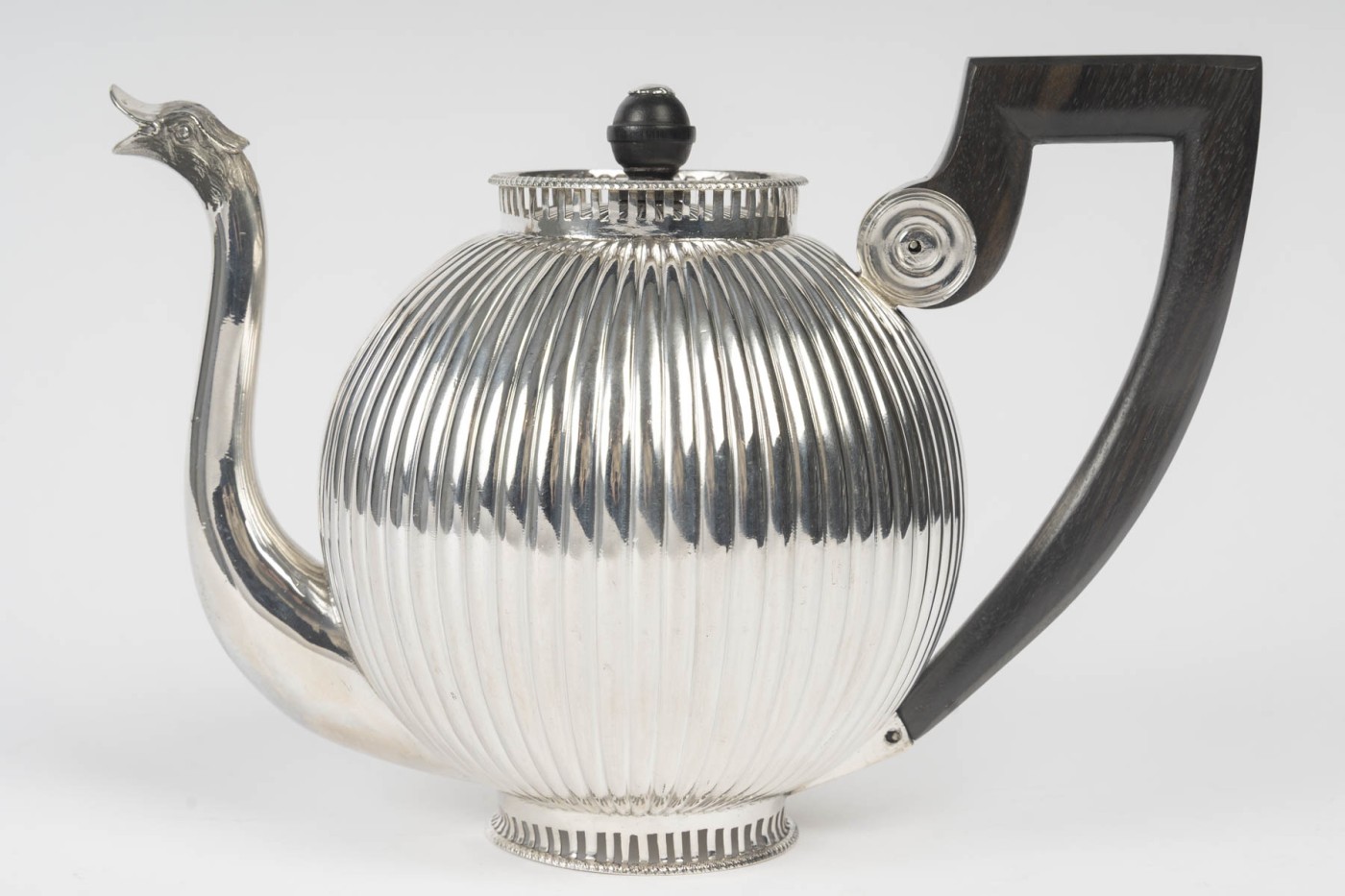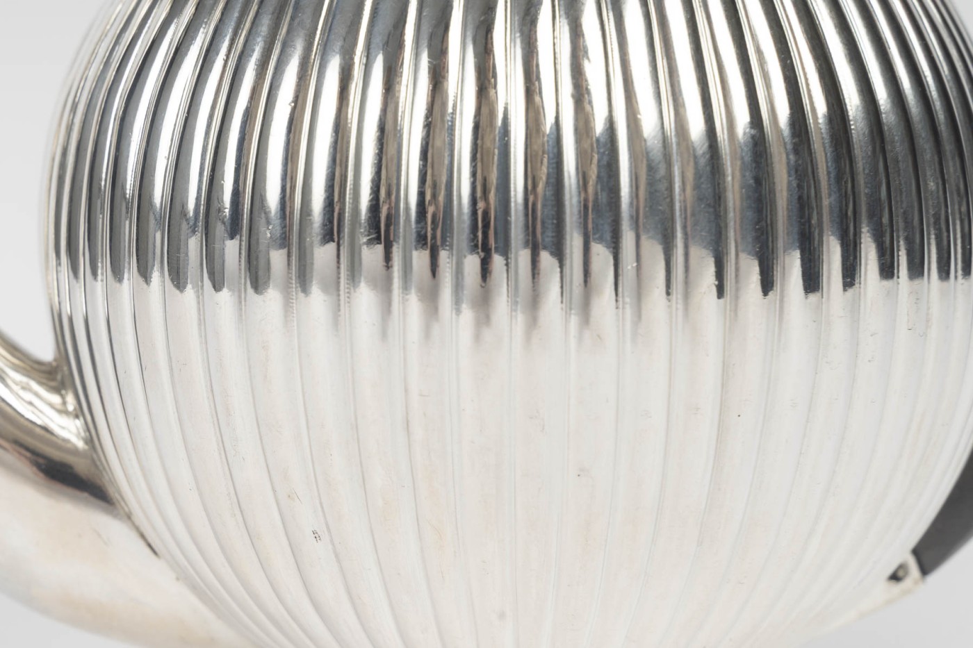 Théière en argent massif, le corps de forme boule à côtes de melon, repose sur une base ronde ajourée.