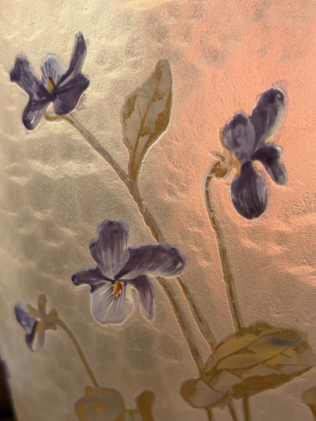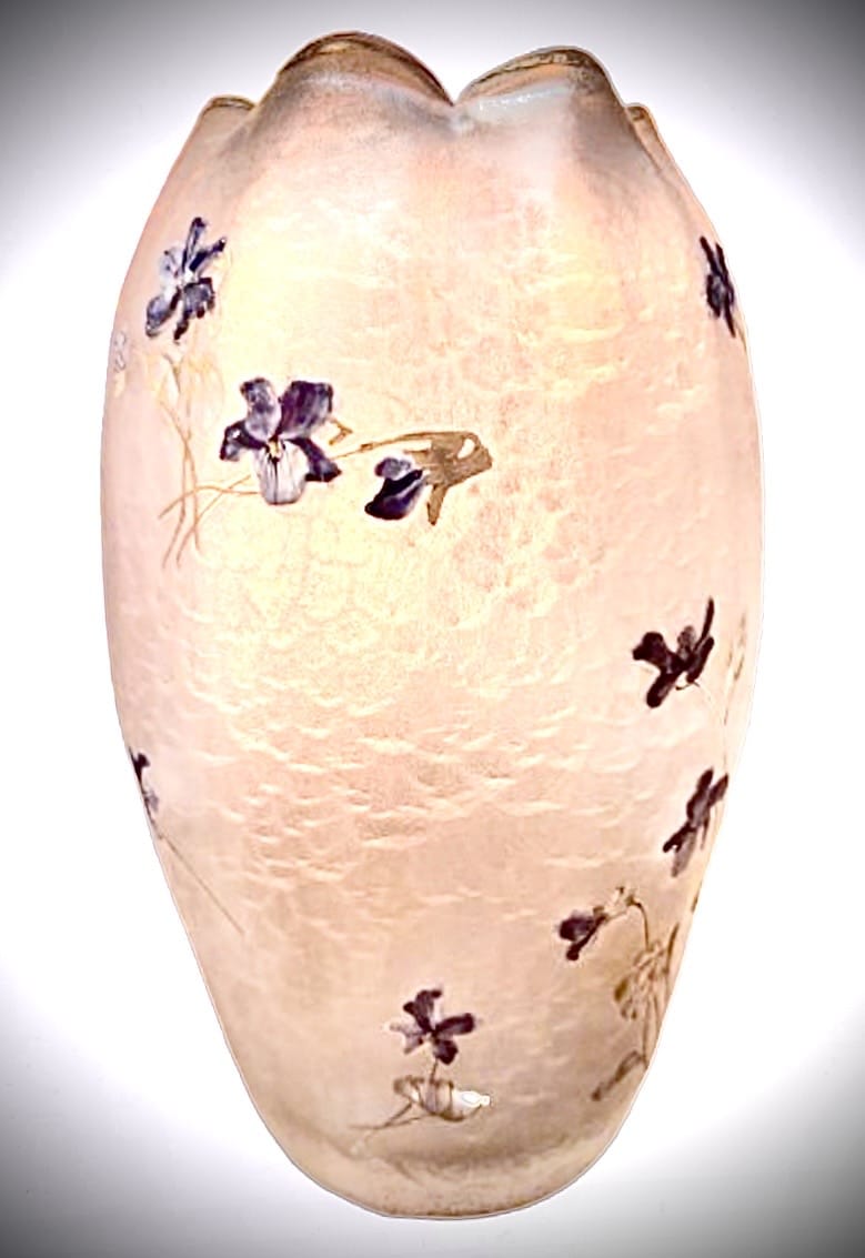 VASE DES ÉTABLISSEMENTS LEGRAS SÉRIE MONTJOYE , VASE ÉMAILLÉ À DÉCOR DE VIOLETTES