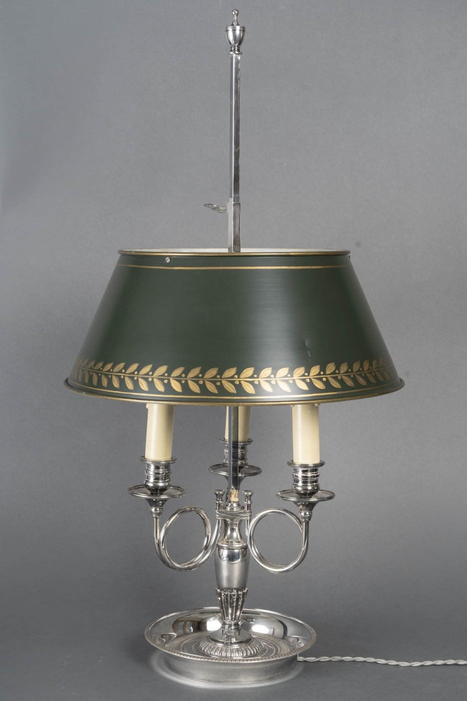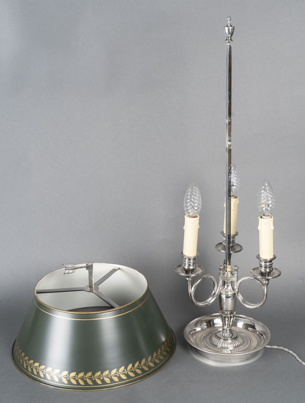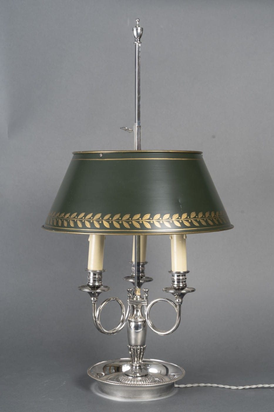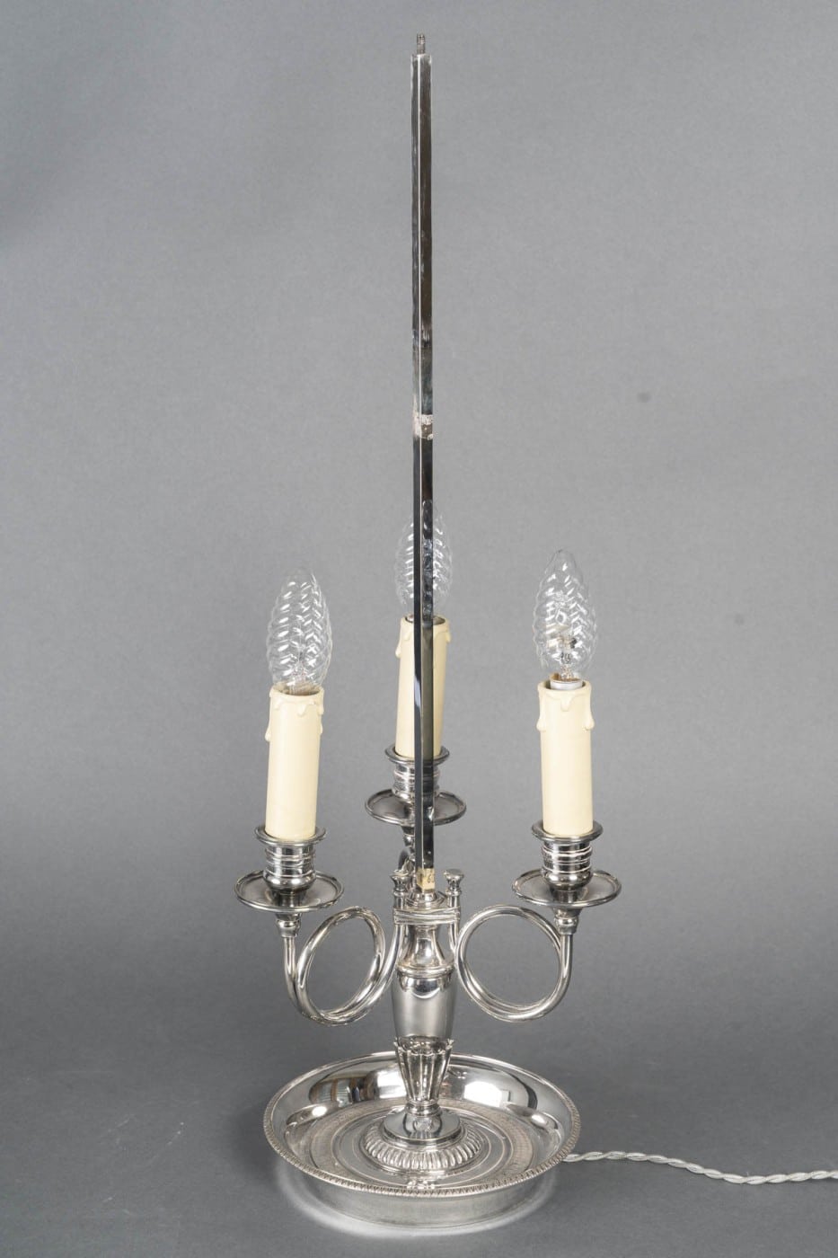 Lampe bouillotte à 3 bras de lumières en bronze argenté.