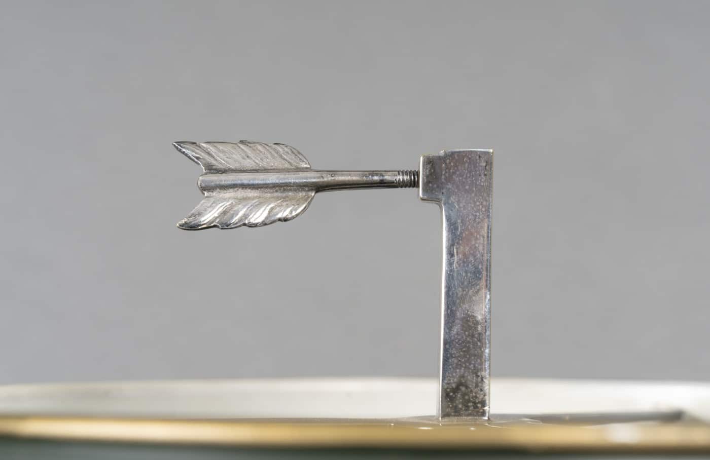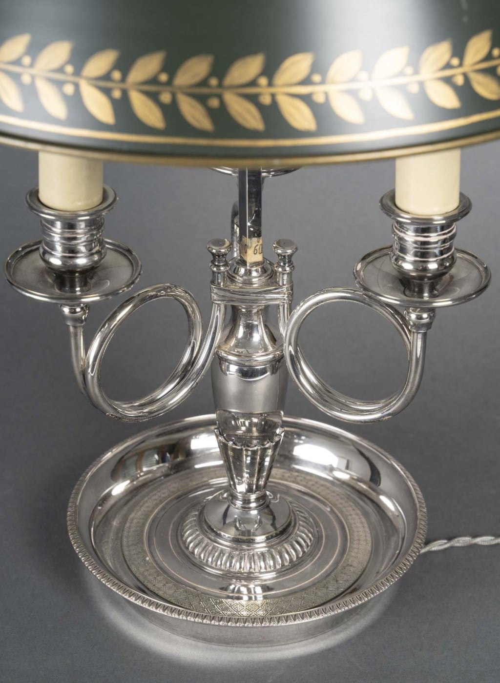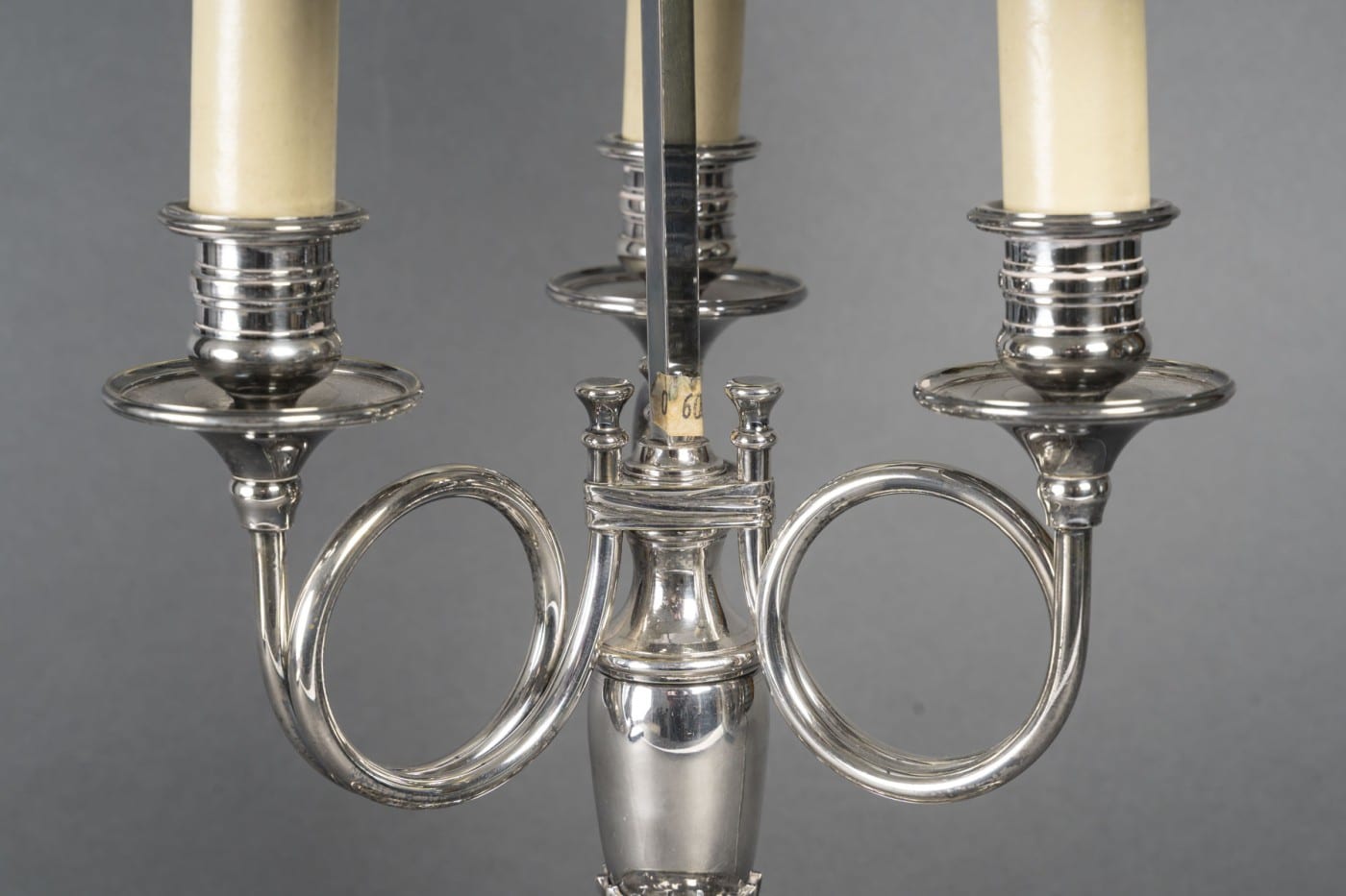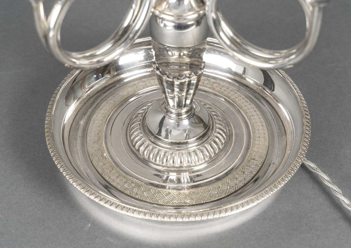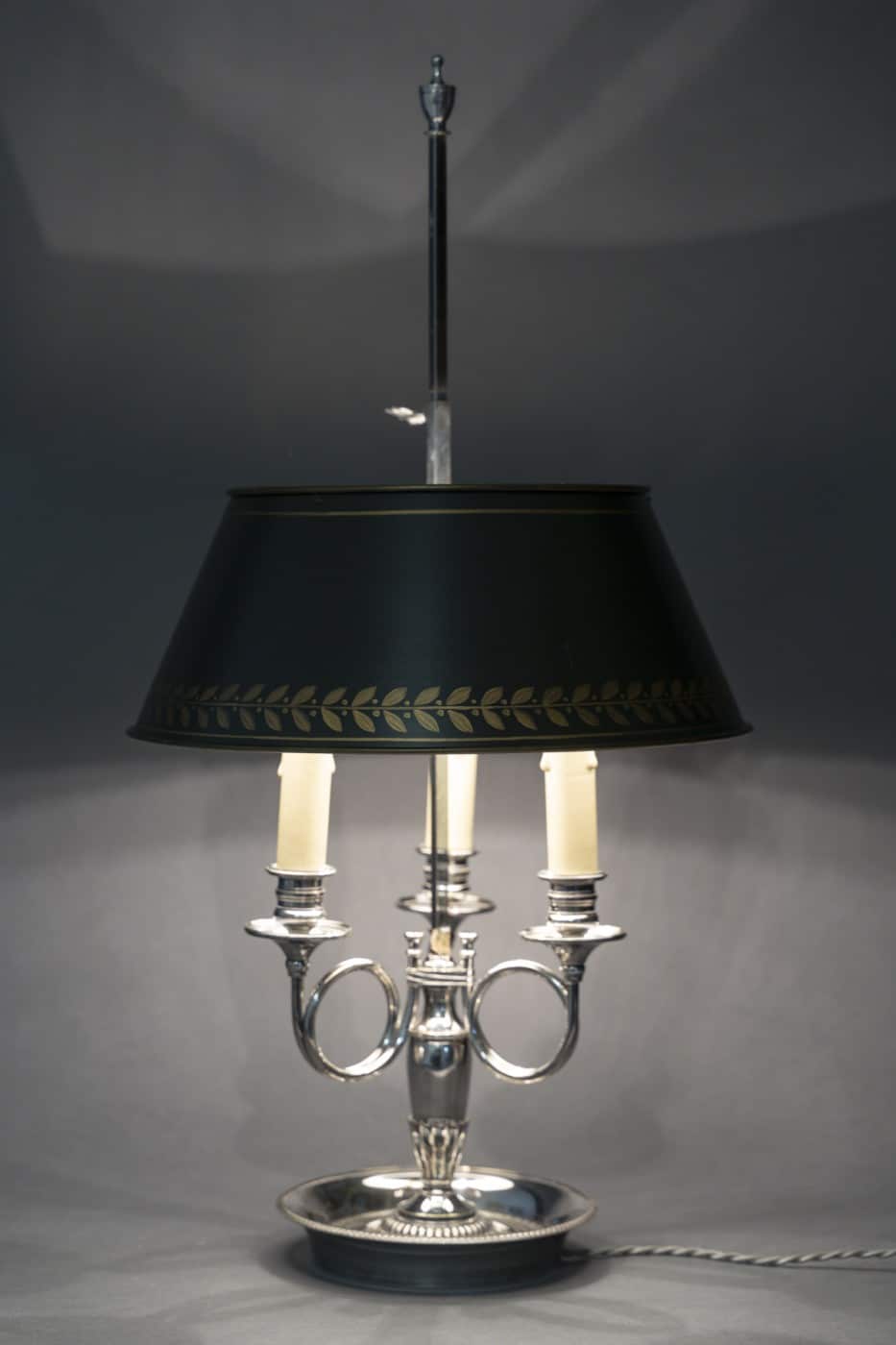 Lampe bouillotte à 3 bras de lumières en bronze argenté.