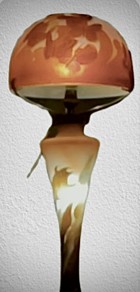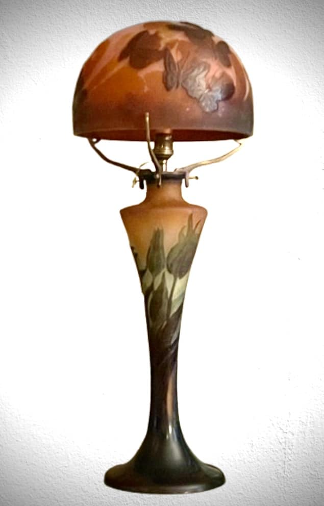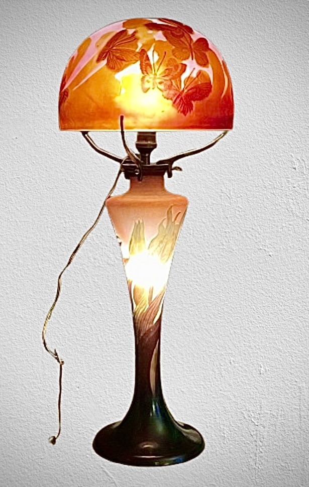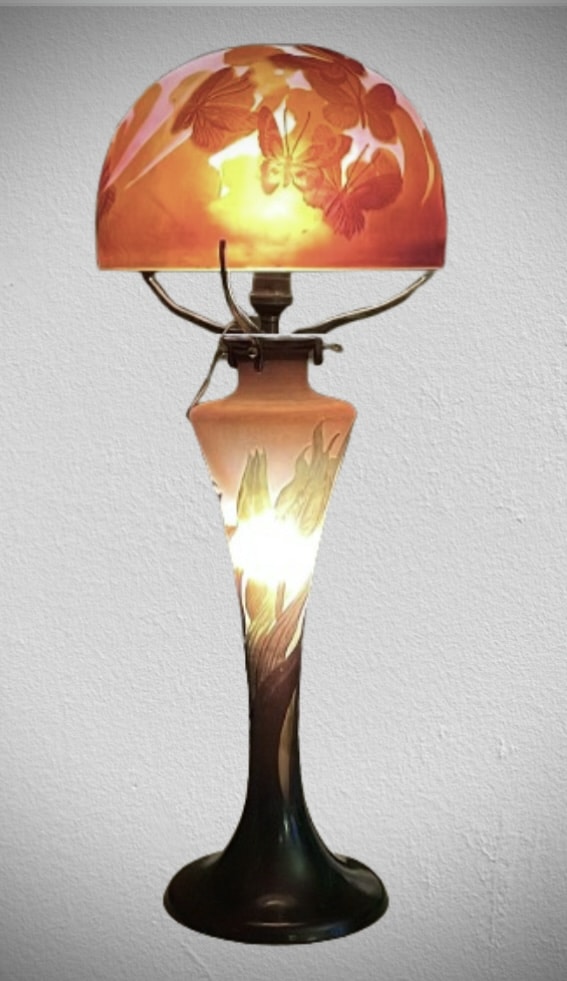 JOLIE LAMPE D EMILE GALLÉ COMPOSÉE D UN CHAPEAU GARNI D UN VOL DE PAPILLONS SURMONTANT UN PIED COMPOSÉ D UN BOUQUET DE FLEURS DE TULIPES DE DIFFÉRENTES COULEURS SIGNÉE SUR LES DEUX PARTIES