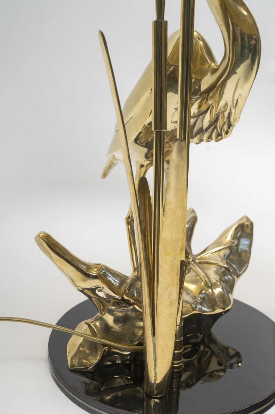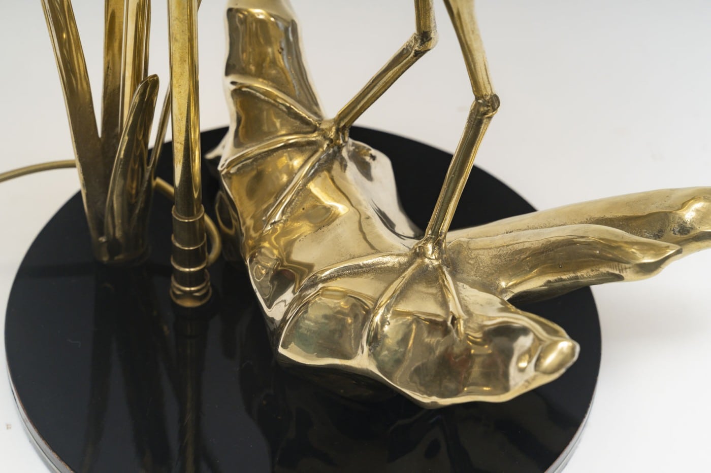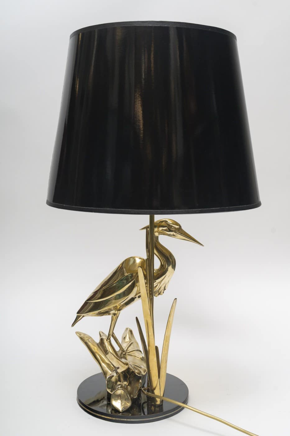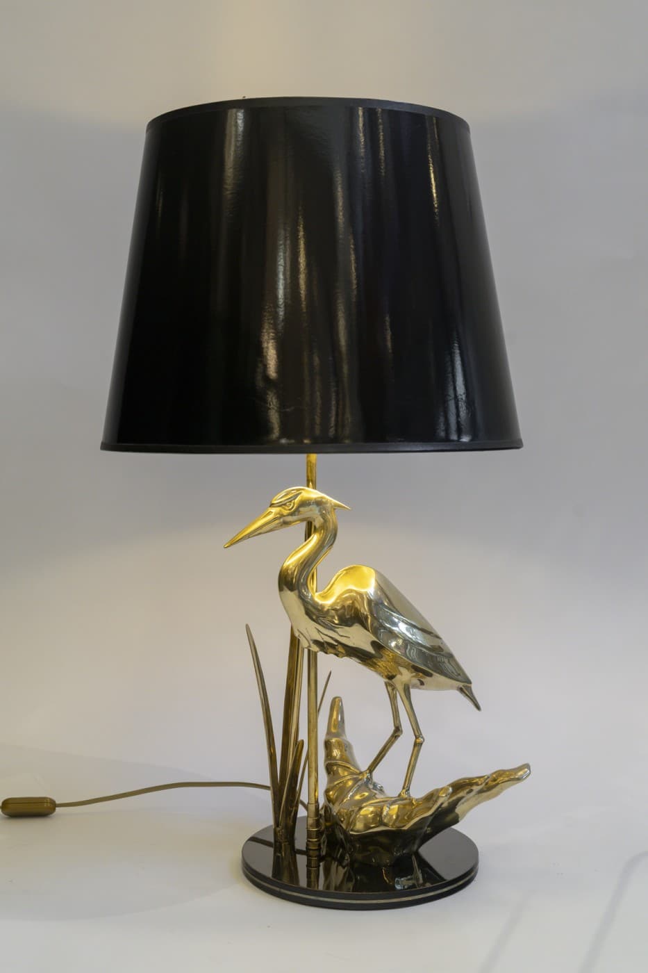 Lampe de bureau sculpturale des années 1970 représentant un héron debout sur ce qui semblerait être la partie d’un tronc d’arbre couché comme il est courant d’en voir au bord de l’eau. Juste à côté de cet échassier se dresse un roseau, la typique plante des eaux douces. Entre les deux, s’élève discrètement une longue tige, qui elle, supporte l’abat-jour, noir à l’extérieur et doré à l’intérieur ce qui une fois l’ampoule éclairante accentue le laiton poli de ce bel ouvrage sculptural.